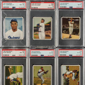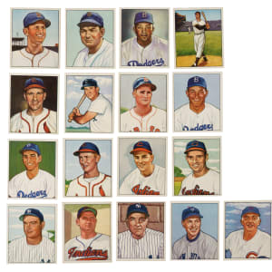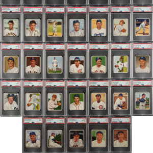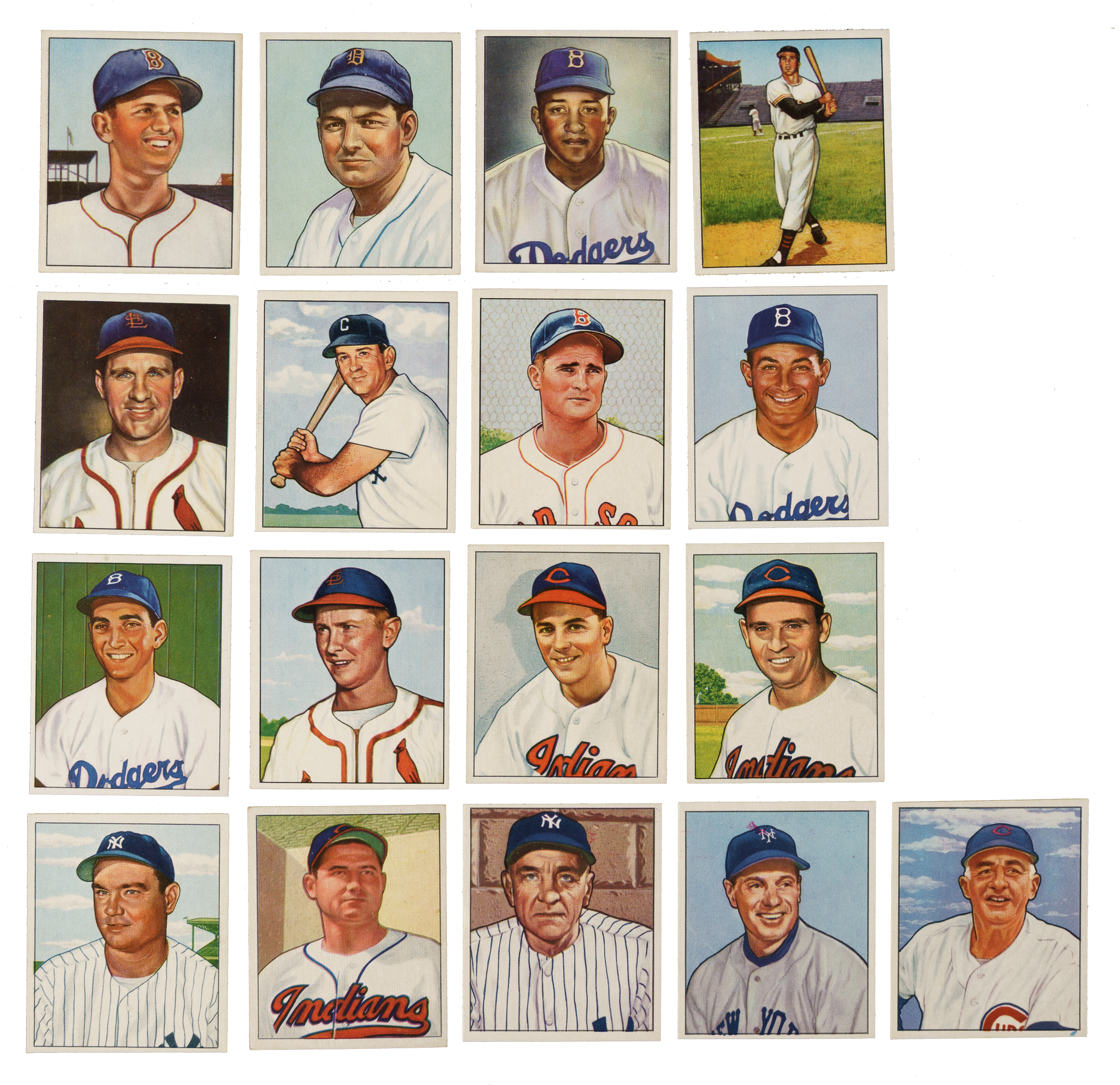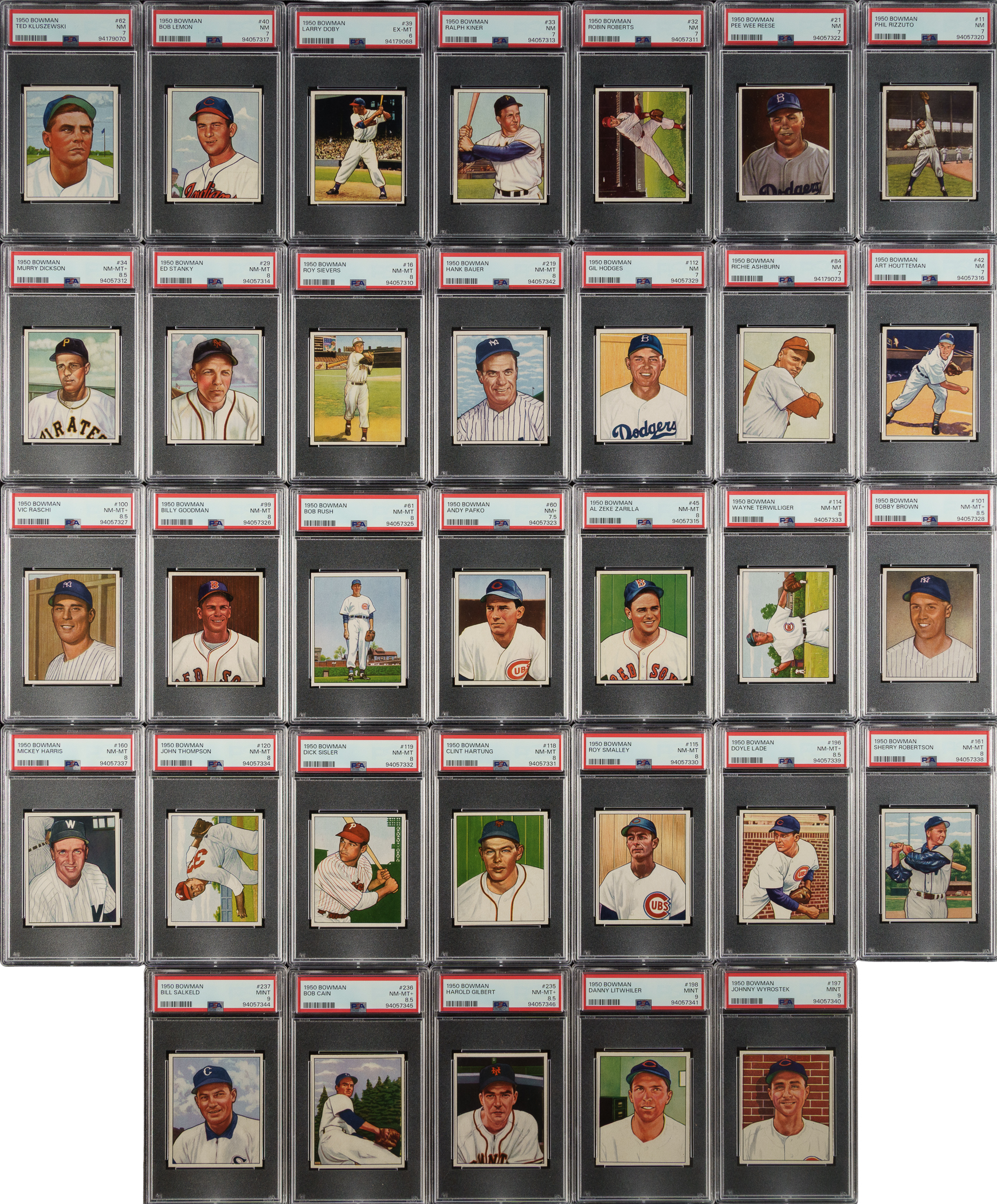 Presented is an extremely attractive and mostly high-grade near-complete set of 1950 Bowman baseball consisting of 250 different cards (out of 252 in the set), missing only #22 Robinson (being sold individually in this auction) and 53 for completion. The 1950 Bowman set is often overlooked by collectors simply because it does not include a Mantle or Mays rookie, but this was a landmark set in its day, being the first postwar baseball issue to feature full-color artwork instead of photographs. Thirty-nine cards have been professionally graded and encapsulated by PSA. Grading Composite: MINT 9 (3 cards): #197, 198, and 237. NM-MT+ 8.5 (6 cards): #34, 100, 101, 196, 235, and 236. NM-MT 8 (16 cards): #6 Feller, 16, 29, 45, 61, 75 Campanella, 77 Snider, 99, 114, 115, 118, 119, 120, 160, 161, and 219 Bauer RC. NM+ 7.5 (1 card): #60. NM 7 (9 cards): #11 Rizzuto, 21 Reese, 32 Roberts, 33 Kiner, 40 Lemon, 42, 62 Kluszewski, 84 Ashburn, and 112 Hodges. EX-MT+ 6.5 (1 card): #46 Berra. EX-MT 6 (3 cards): #19 Spahn, 39 Doby, and 98 Williams. The condition of the 211-card unencapsulated balance is 33% Nr/Mt (including some Nr/Mt-Mt), 56% Ex to Ex-Mt, and 11% Vg to Vg-Ex. Unencapsulated Keys: #1 Parnell RC (Vg-Ex), 8 Kell (Ex+), 23 Newcombe RC (Vg-Ex), 28 Thomson (Nr/Mt), 35 Slaughter (Ex+), 37 Appling (Ex-Mt due to centering), 43 Doerr (Ex), 58 Furillo (Ex-Mt), 59 Branca (Ex-Mt), 71 Schoendienst (Nr/Mt), 94 Boudreau (Ex-Mt), 129 Gordon (Ex-Mt), 139 Mize (Ex), 148 Wynn (Ex), 217 Stengel (Ex-Mt due to centering), 220 Durocher (Nr/Mt), and 229 Frisch (Ex-Mt). This is an outstanding near-complete set (minus two cards) of this classic early Bowman issue. The SMR value for just the 39 graded cards (factoring in the eight half grades at the lower whole-grade level) is $13,425. Total: 250 cards. The size/weight of this item requires that there will be an additional shipping charge for this lot.