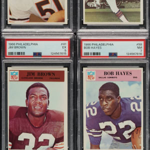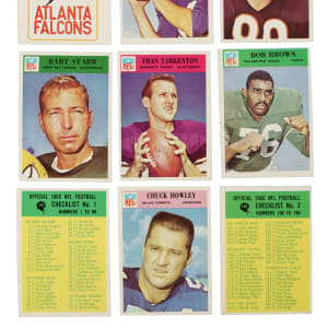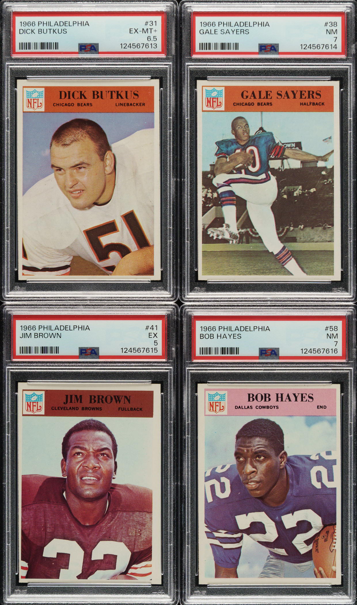 Outstanding complete set of 1966 Philadelphia football cards, highlighted by the rookie cards of Chicago Bears Hall of Famers Gale Sayers and Dick Butkus. Condition is 38% Nr/Mt to Nr/Mt-Mt (mostly Nr/Mt), 55% Ex to Ex-Mt, and 7% Vg to Vg-Ex. Four cards have been graded and encapsulated by PSA. Keys: #1 Falcons Insignia (Vg), 24 Unitas (10/90 T/B, otherwise Ex-Mt), 31 Butkus RC (EX-MT+ 6.5), 32 Ditka (Nr/Mt), 38 Sayers RC (NM 7), 41 J. Brown (EX 5), 58 Hayes RC (NM 7), 59 Howley RC (Nr/Mt+), 88 Starr (Ex), 114 Tarkenton (Vg+), 134 B. Brown RC (10/90 T/B, otherwise Ex-Mt), 197 Checklist 1 (Ex), and 198 Checklist 2 (Vg). This is an extremely attractive mid- to high-grade complete set of this classic football issue with many notable highlights. Total: 198 cards.