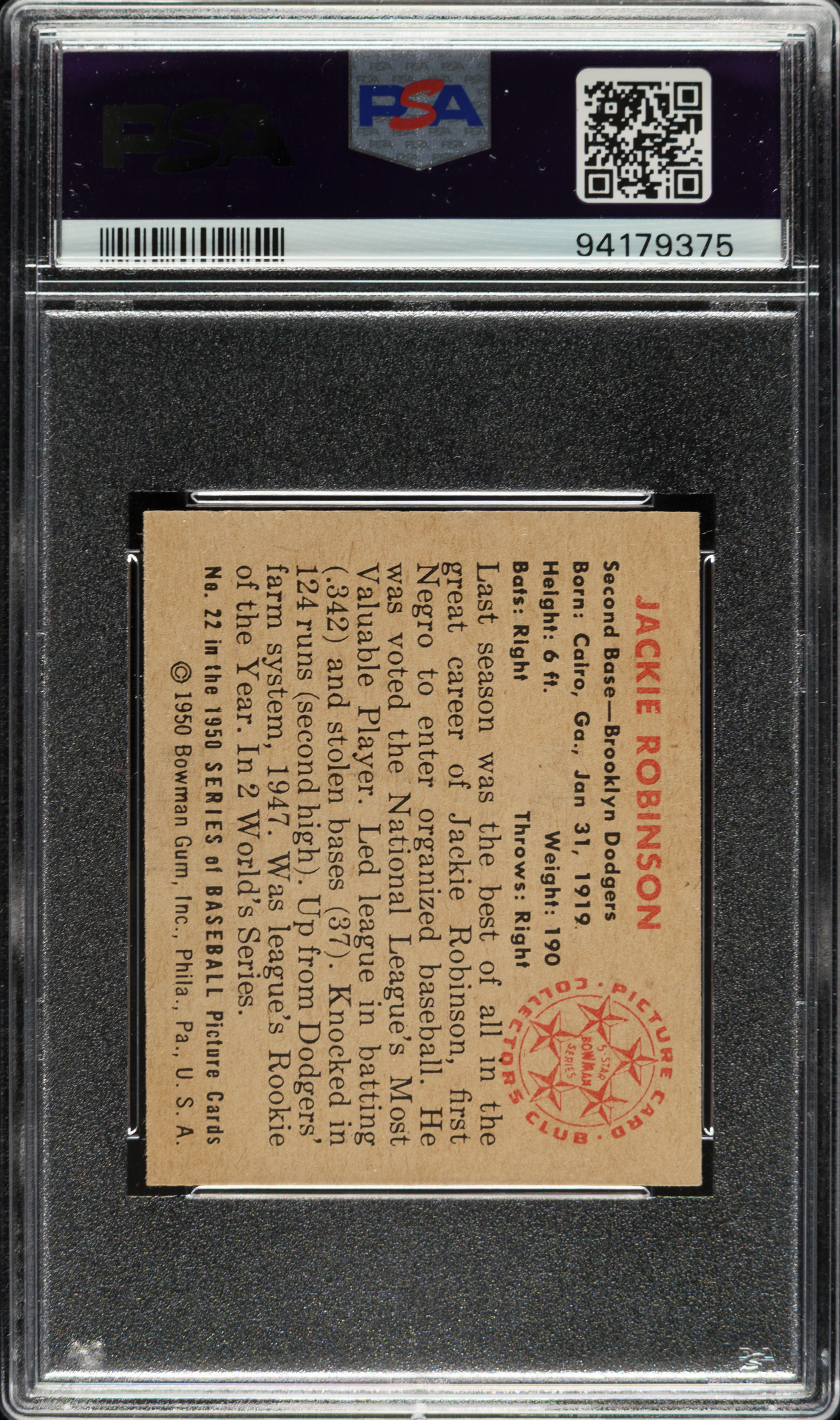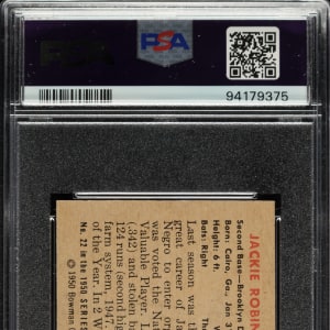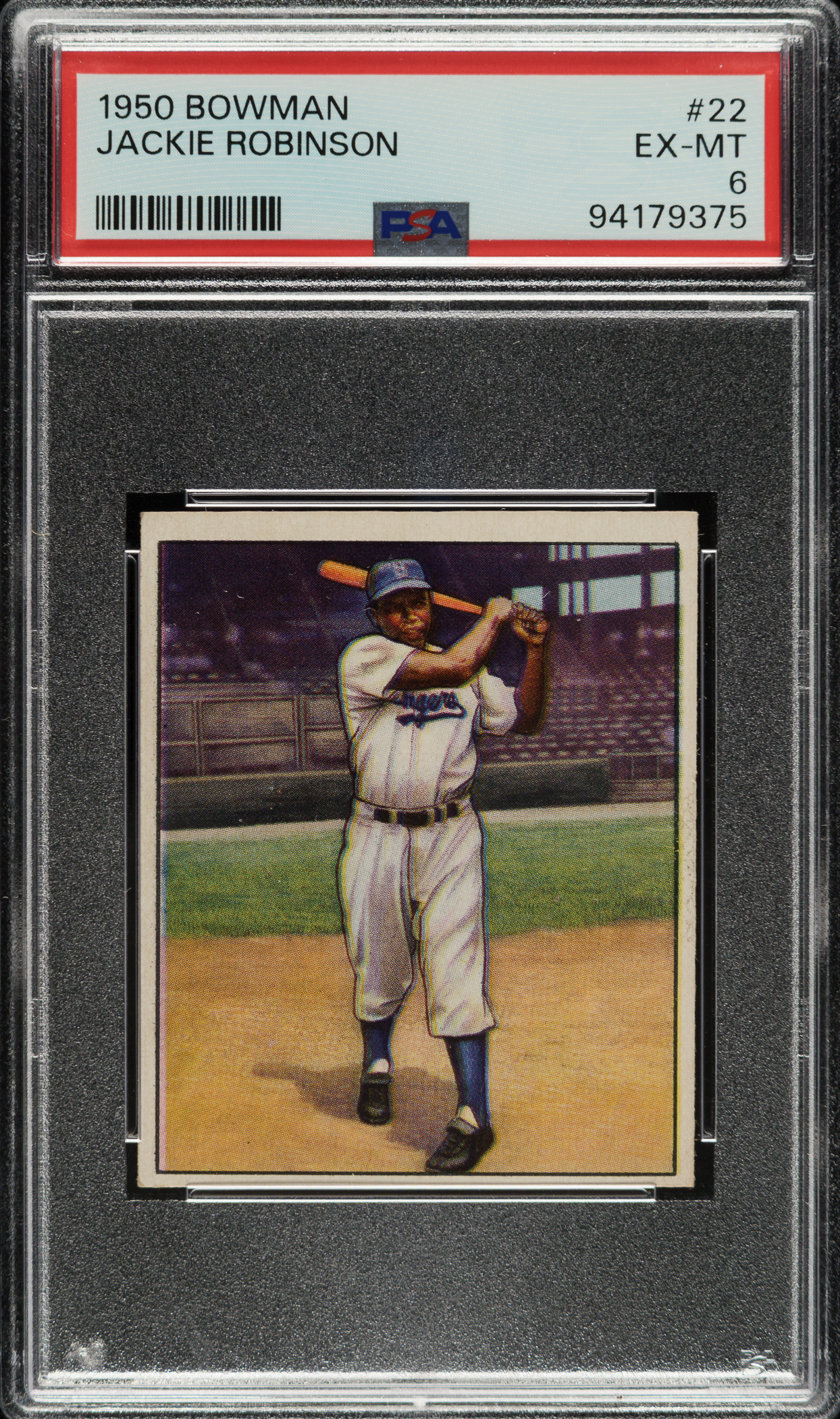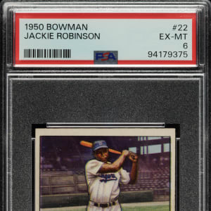 Graded EX-MT 6 by PSA. Very attractive example of Brooklyn Dodgers Hall of Famer Jackie Robinson (#22) from the 1950 Bowman set. One of the key cards to this early Bowman issue, Robinson is pictured in a beautiful full-color swing-through batting pose. The offered card has vibrant colors, a crisp image, light corner wear, and centering toward the bottom. Boldly printed reverse. A fantastic example of Hall of Famer Jackie Robinson that would make a fine addition to a 1950 Bowman set or collection of classic cards.