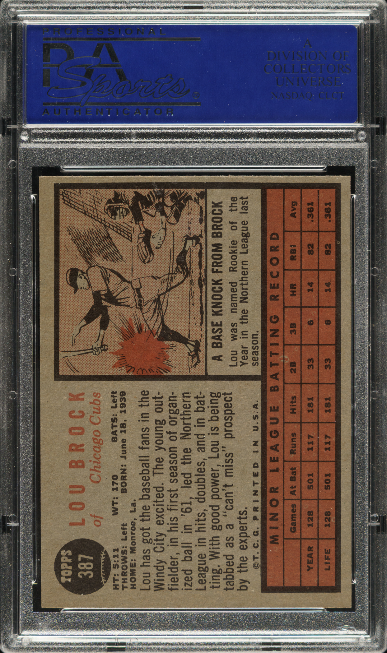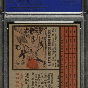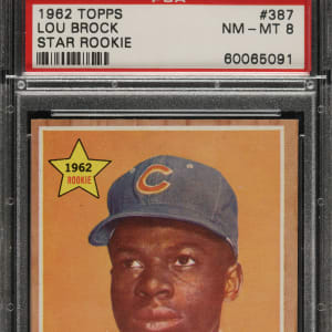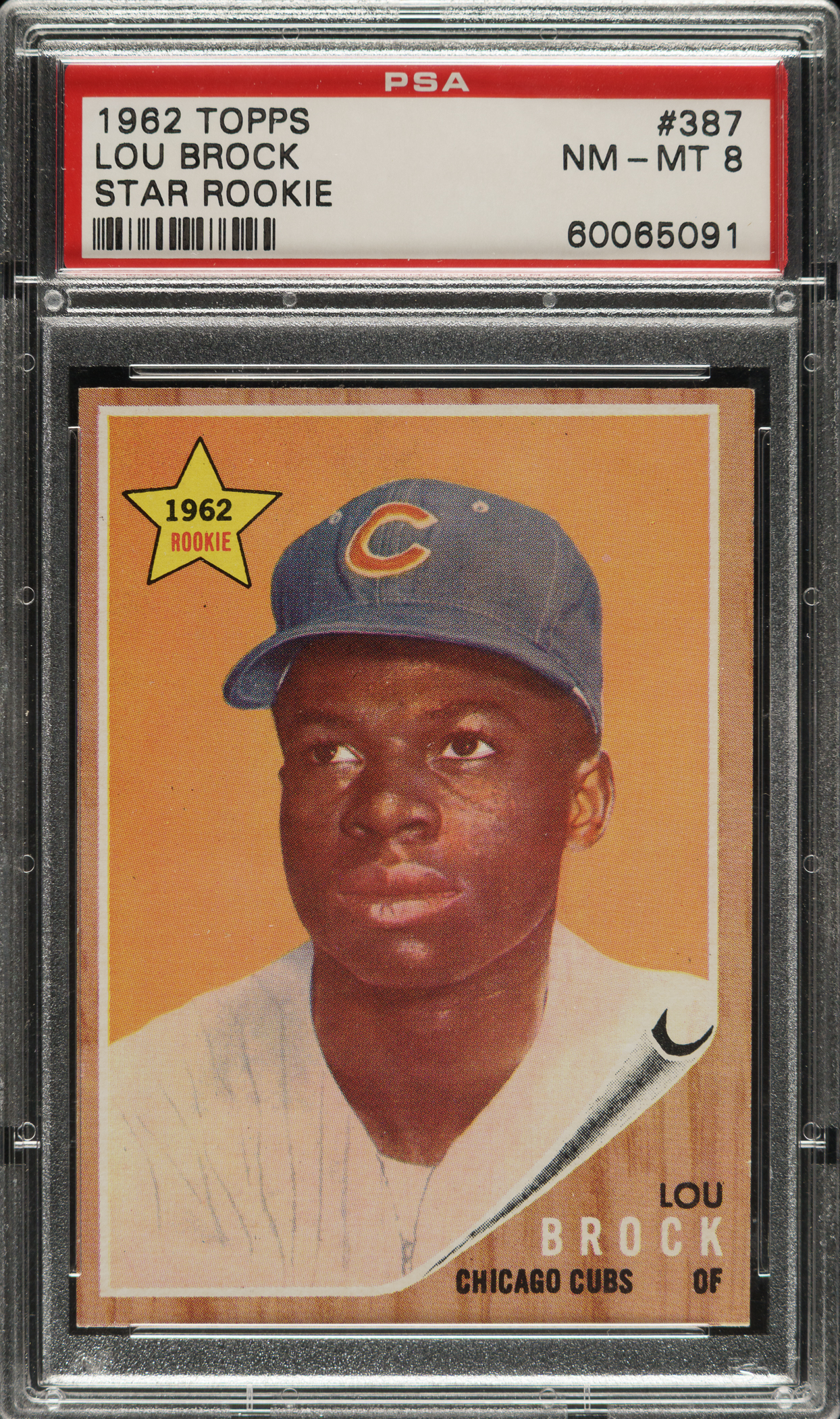 Graded NM-MT 8 by PSA. Outstanding high-grade example of Chicago Cubs Hall of Famer Lou Brock's rookie card from the 1962 Topps set. The offered card features brilliant colors, a crisp image, strong corners, and virtually no chipping along the delicate wood-grain borders. Clean reverse. A tremendous rookie card example of this popular Hall of Famer.