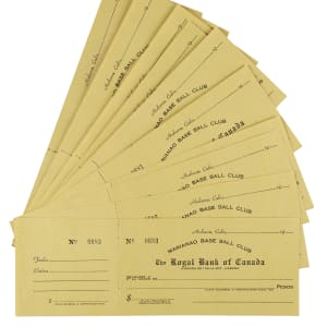 Collection of 20 unused Marianao Base Ball Club (Cuban League) business checks issued in the 1950s. The Marianao Base Ball Club competed in the Cuban League from 1922 to 1961, representing the Havana neighborhood of Marianao. Each check (10-5/8 x 3-3/4 inches) displays staple holes along the attached ledger stubs. Excellent to Near Mint condition overall. Also included in this lot is a 1949-1950 Alerta Antonio Alcalde premium of Amado Ibanez. Poor condition overall. Total: 21 items (20 checks and 1 premium).