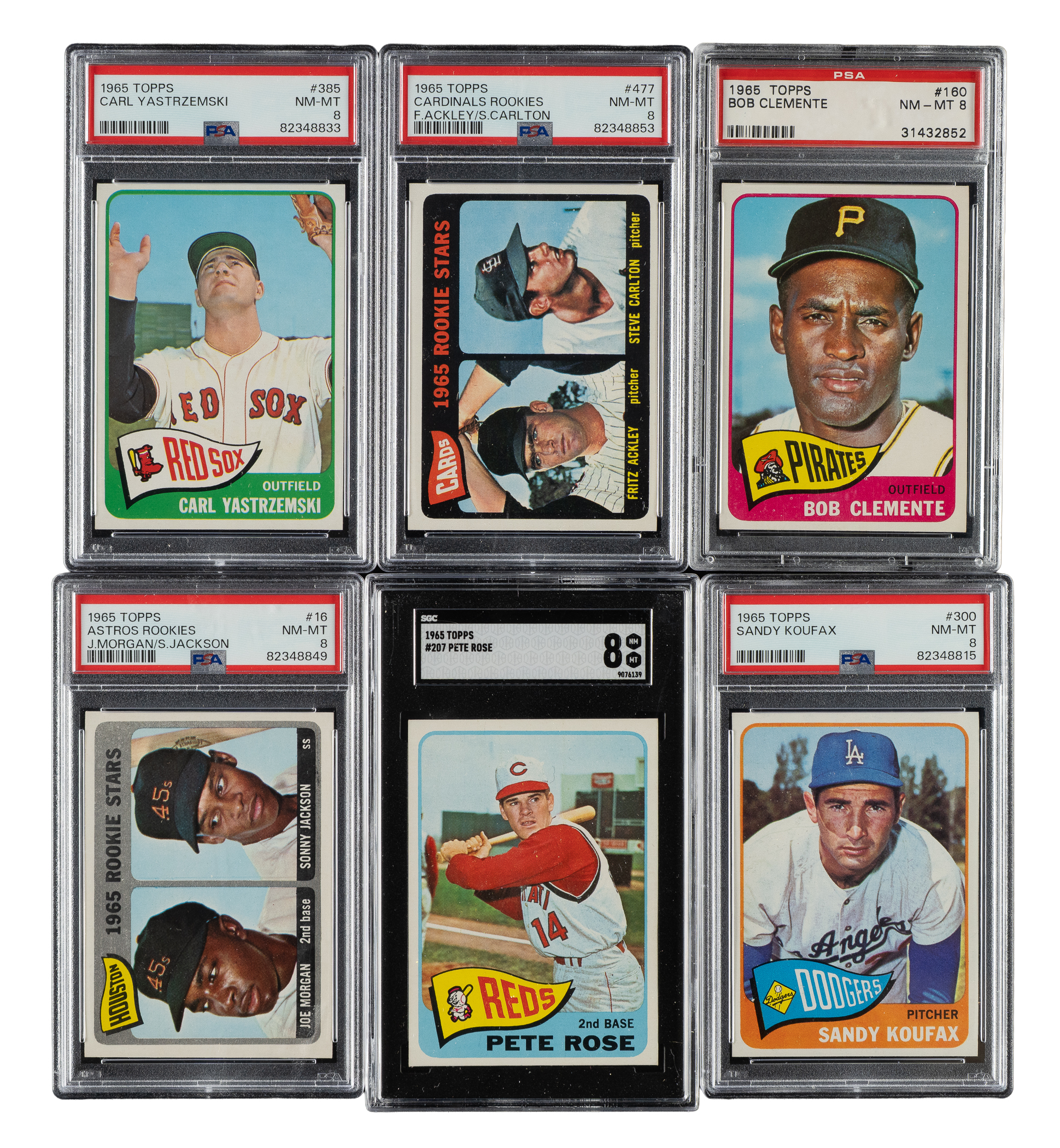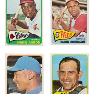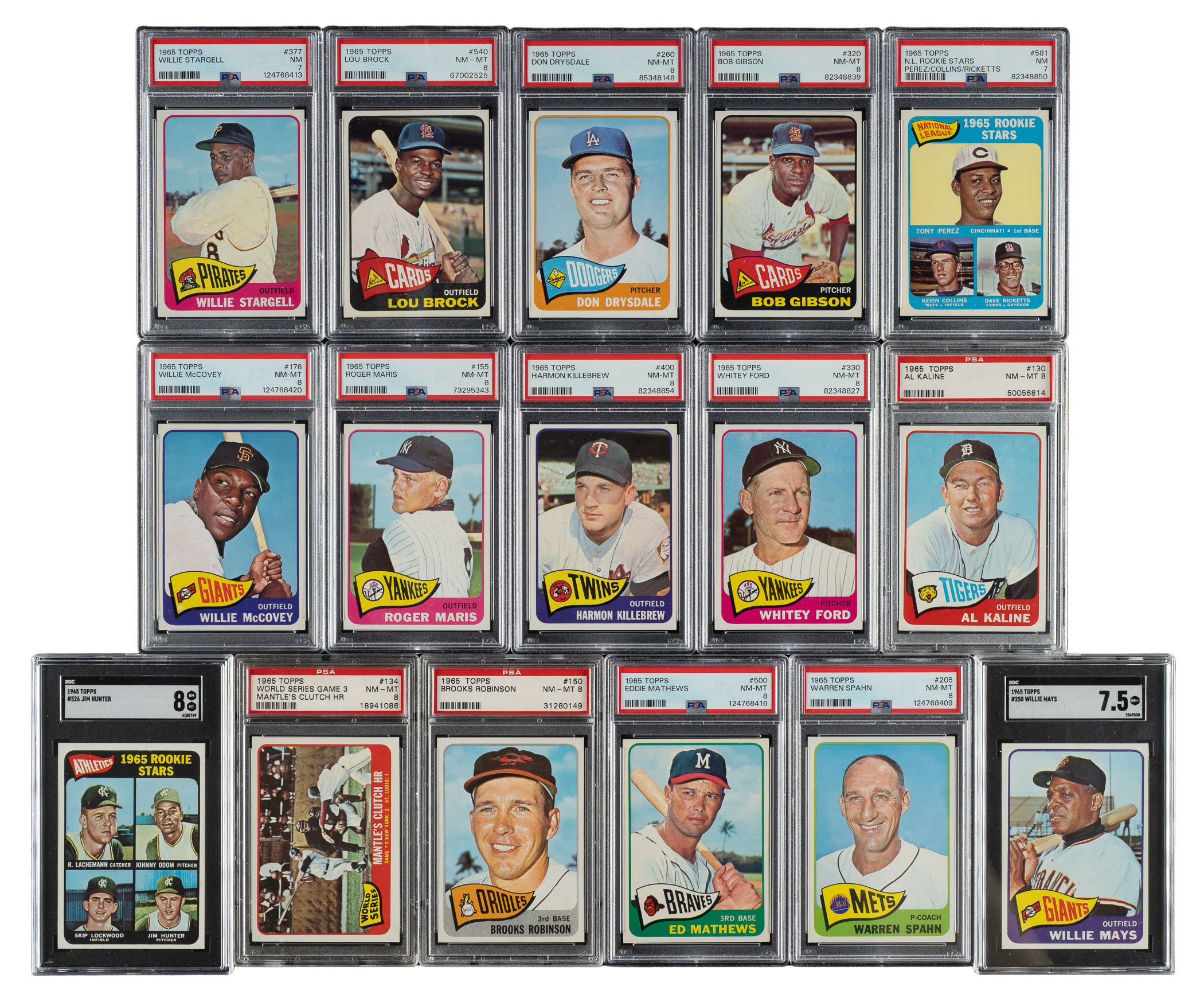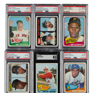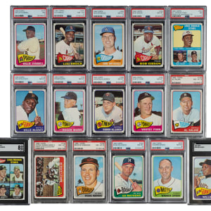 Outstanding crisp, clean, classic 1965 Topps near-complete set consisting of 597 different cards (out of 598 in the set), missing only #350 Mantle for completion (being sold individually in this auction). One of the most popular sets of the decade, the 1965 Topps set includes rookie cards of Hall of Famers Joe Morgan, Steve Carlton, Catfish Hunter, and Tony Perez. A total of 154 cards have been professionally graded and encapsulated by PSA (148) and SGC (6). PSA Grading Composite: NM-MT+ 8.5 (2 cards): 39 and 494 (SGC 92). NM-MT 8 (122 cards): #1, 3, 4, 7, 8, 12, 16 Morgan RC, 20 Bunning, 29 (SGC 88), 40, 48, 54, 56, 61, 65, 70, 74, 77, 81, 95 Mazeroski, 97, 102, 104, 105, 122, 124, 130 Kaline, 134 Mantle WS, 139, 141, 150 B. Robinson, 155 Maris, 160 Clemente, 163, 166, 172, 174, 176 McCovey, 178, 184, 188, 193 Perry, 194, 197, 204, 205 Spahn, 207 Rose (SGC), 215, 216, 220 B. Williams, 236, 243, 252, 260 Drysdale, 266, 273, 274, 276 Wilhelm, 283, 289, 297, 300 Koufax, 302, 304, 306, 309, 312, 317, 320 Gibson, 323, 330 Ford, 339, 340 Oliva, 341, 343, 344, 345, 347, 351, 354, 372, 373, 382, 383, 385 Yastrzemski, 387, 389, 391, 393, 394, 398, 400 Killebrew, 406, 409, 412, 417, 422, 423, 425, 427, 435, 437, 440, 457, 466, 472, 476, 477 Carlton RC, 491, 500 Mathews, 507, 514, 526 Hunter RC (SGC), 530, 533, 540 Brock, 546, 556 Schoendienst (SGC 88), 558, 576, 592, and 593. NM+ 7.5 (2 cards): #177 and 250 Mays (SGC). NM 7 (28 cards): #2, 5, 100, 110 Santo, 125, 175, 187 Stengel, 192, 221, 314, 361, 369, 377 Stargell, 378, 381, 399, 421, 450, 460 Allen, 467, 490, 509, 513 Yankees Team, 543, 550, 581 Perez RC, 588, and 598. The condition of the 443-card unencapsulated balance is 66% Nr/Mt to Nr/Mt-Mt (including a few Mint) and 34% Ex to Ex-Mt (including a few slightly lesser and a couple with a slight miscut). Unencapsulated Keys: #120 F. Robinson (Ex-Mt), 170 Aaron (Nr/Mt), 470 Berra (Nr/Mt), and 510 Banks (Nr/Mt+). Extremely attractive high-grade near-complete set (minus one) with many highlights. The equivalent SMR value for just the 154 graded cards (factoring in the four half grades at the lower whole-grade level) is $9,818. Total: 597 cards. The size/weight of this item requires that there will be an additional shipping charge for this lot.