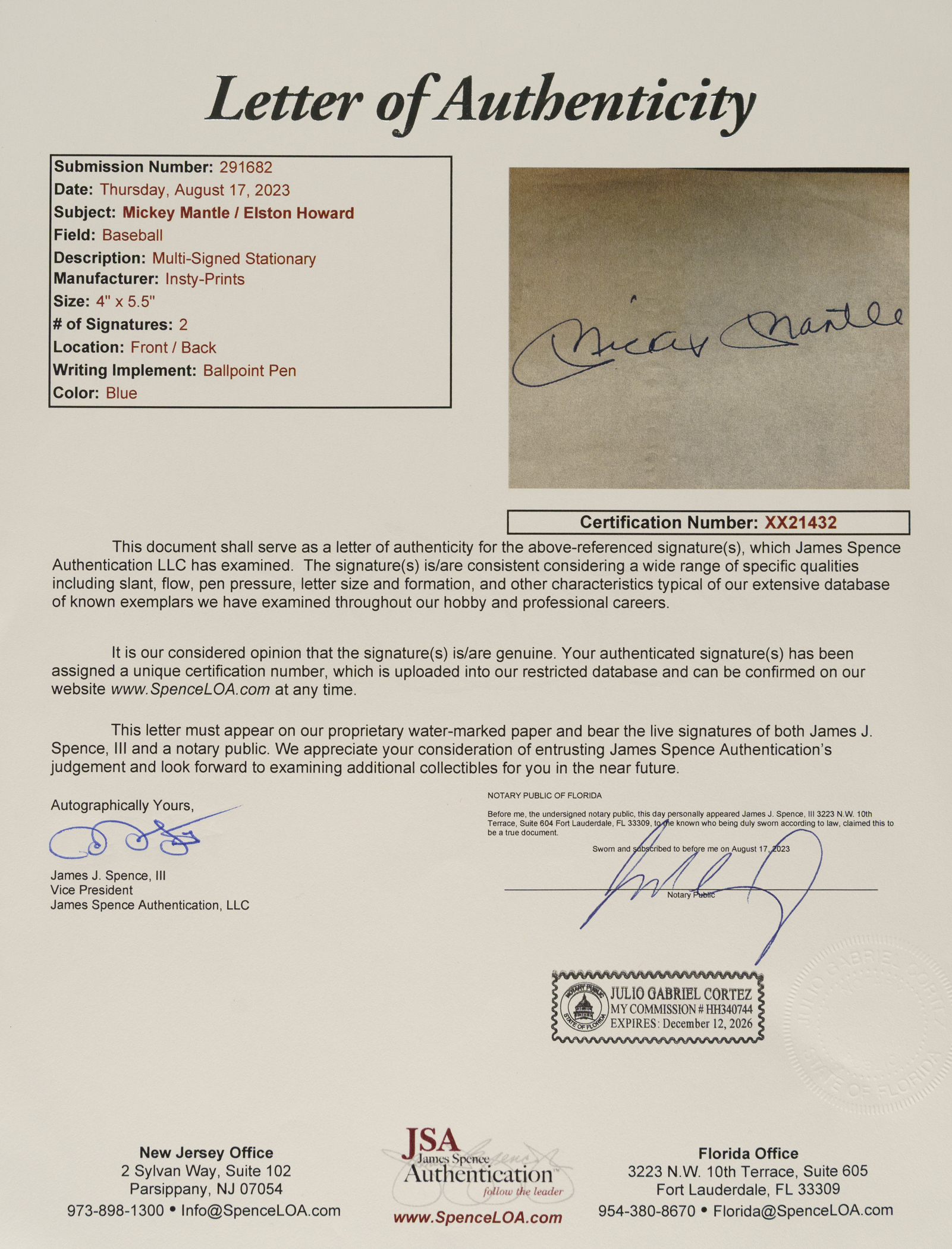 New York Yankees Hall of Famer Mickey Mantle and Elston Howard cut signature. Full LOA from James Spence/JSA.