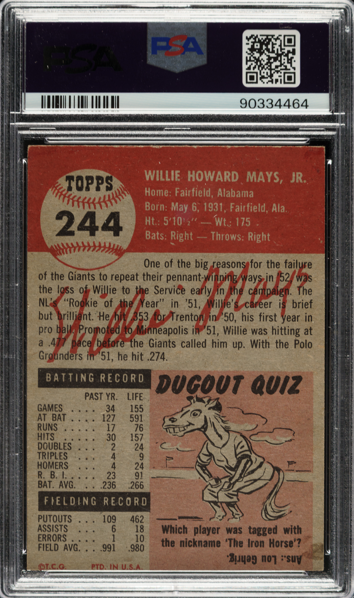 Graded EX 5 by PSA. 1953 Topps card #244 Willie Mays is one of the key cards of the 1950s, one of the most prized of all early Mays cards, and a key card in the 1953 Topps set. This example has bright colors, excellent registration, and light corner wear. Boldly printed reverse. This is a solid mid-grade example.