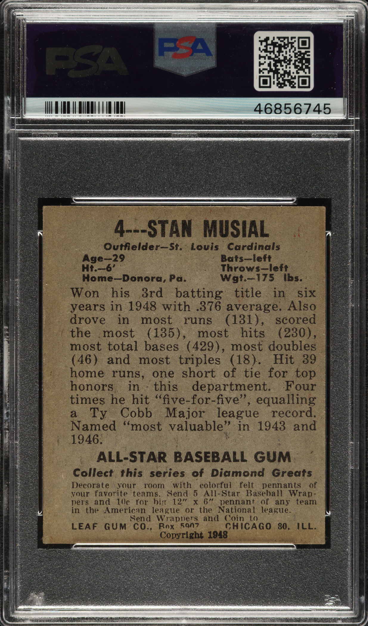 Graded EX 5 by PSA. Mid-grade example of this classic rookie card of St. Louis Cardinals Hall of Famer Stan Musial. The 1948-1949 Leaf Bubble Gum card of Musial is one of the most popular and striking of all his cards. The cards manufactured by Leaf Gum Co. in 1948 and 1949 are often encountered with many problems (excessive toning, general wear from fragile paper stock, soft corners, centering issues, and print lines), and collectors also must deal with the wildly varying degrees of print quality that characterize the set. It is easy to see why 1948-1949 Leafs are one of the most difficult of all issues to collect in high grade. The offered example has brilliant colors, outstanding registration, and strong corners with light touches of wear (there is a small crease above the bottom-left corner). The reverse is clean and free of staining or excess print. This is a solid mid-grade example of one of the icons of postwar Hall of Fame card collecting.