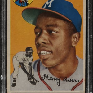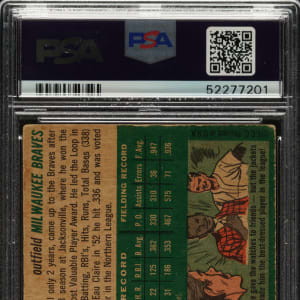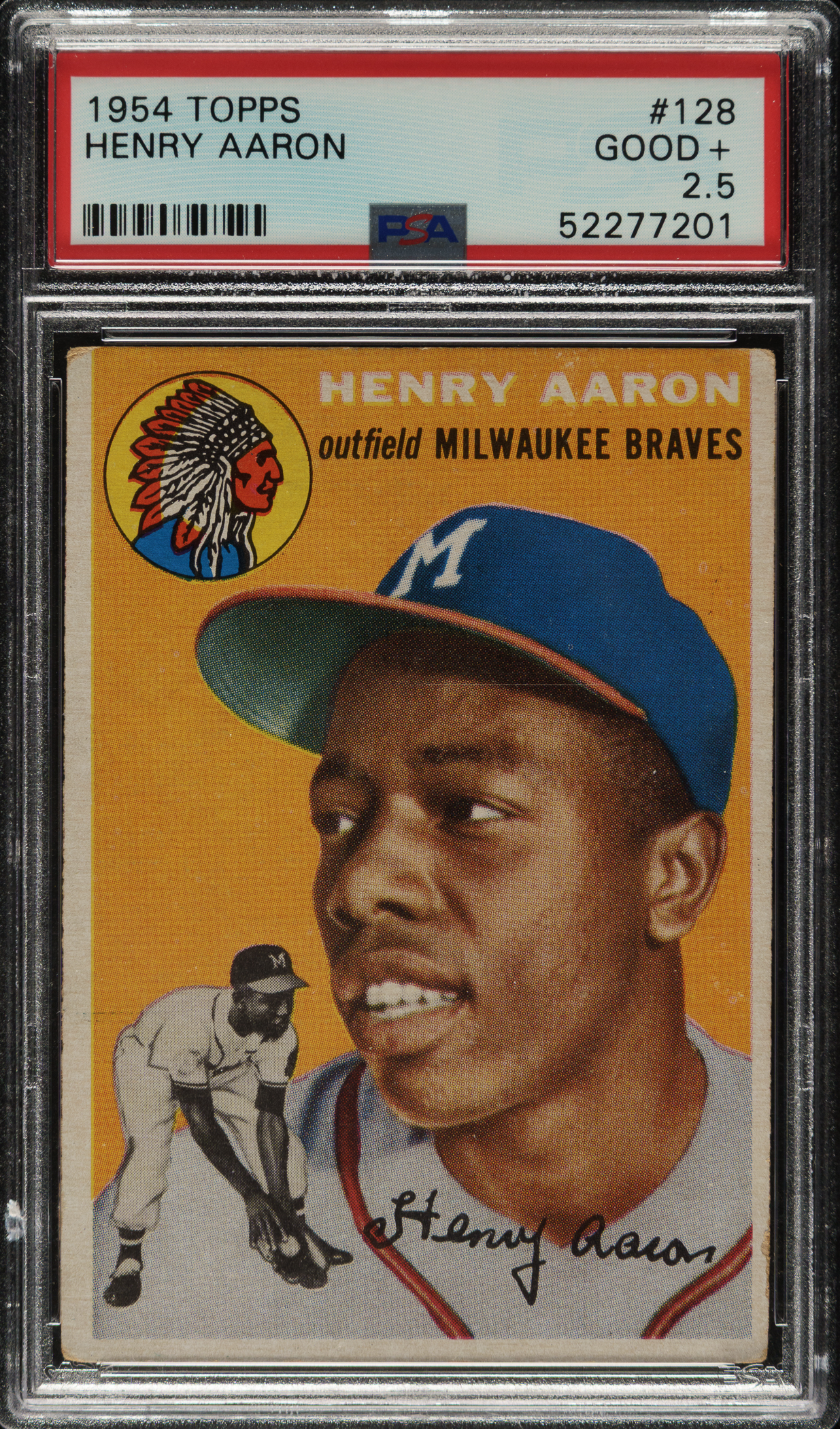 Graded GOOD+ 2.5 by PSA. Pleasing example of Milwaukee Braves Hall of Famer Hank Aaron's rookie card. One of card collecting's classics, Aaron's rookie card is the key to the 1954 Topps set and one of the most popular of all postwar baseball cards. The card has bold colors, a crisp image of Aaron, and honest corner wear. The reverse is lightly toned and displays a few wrinkles.