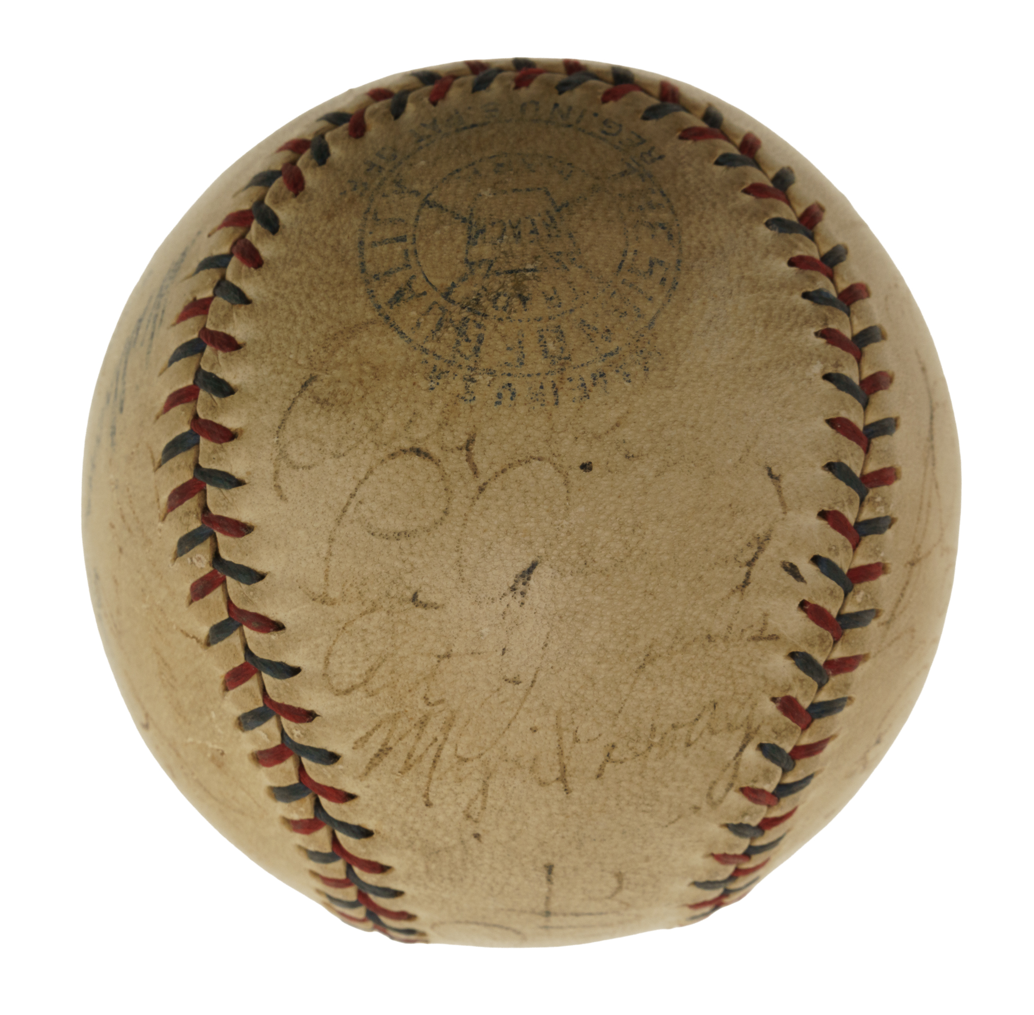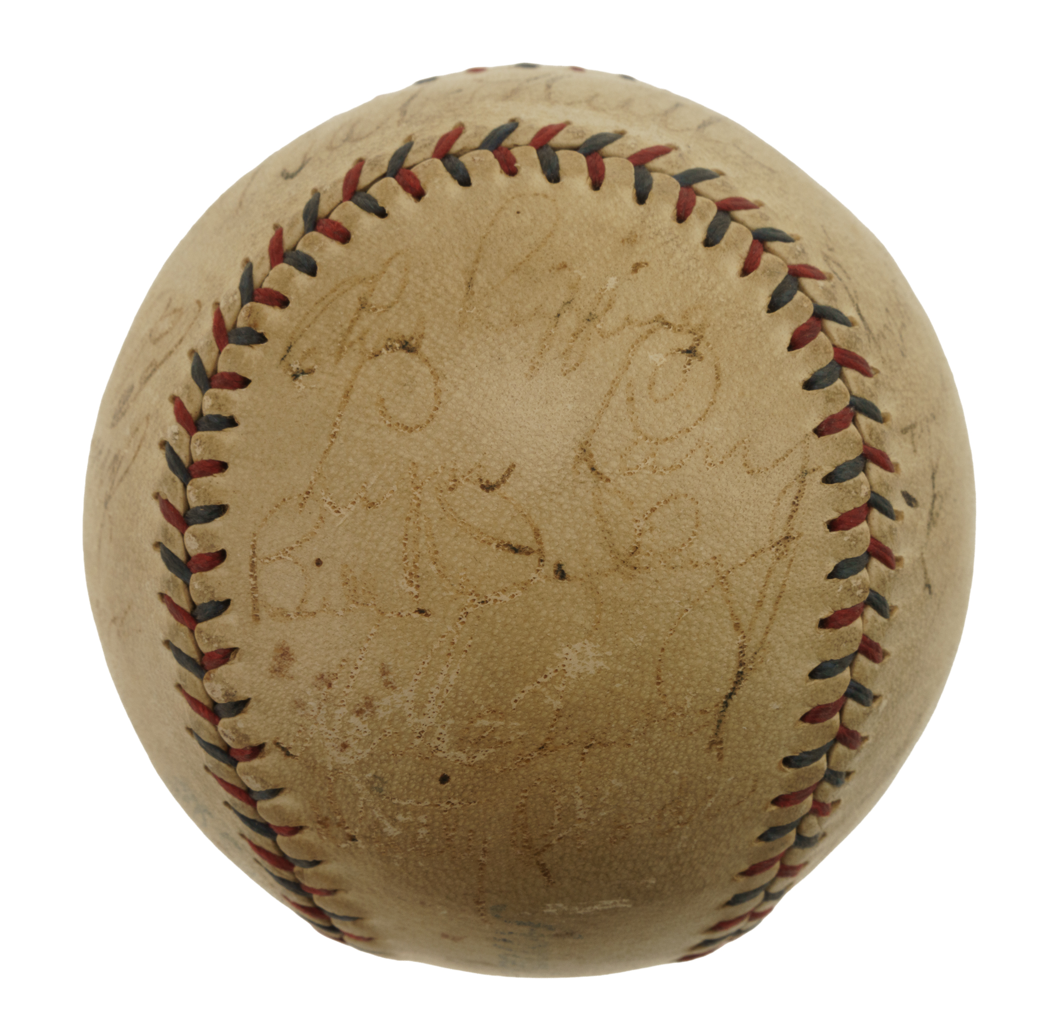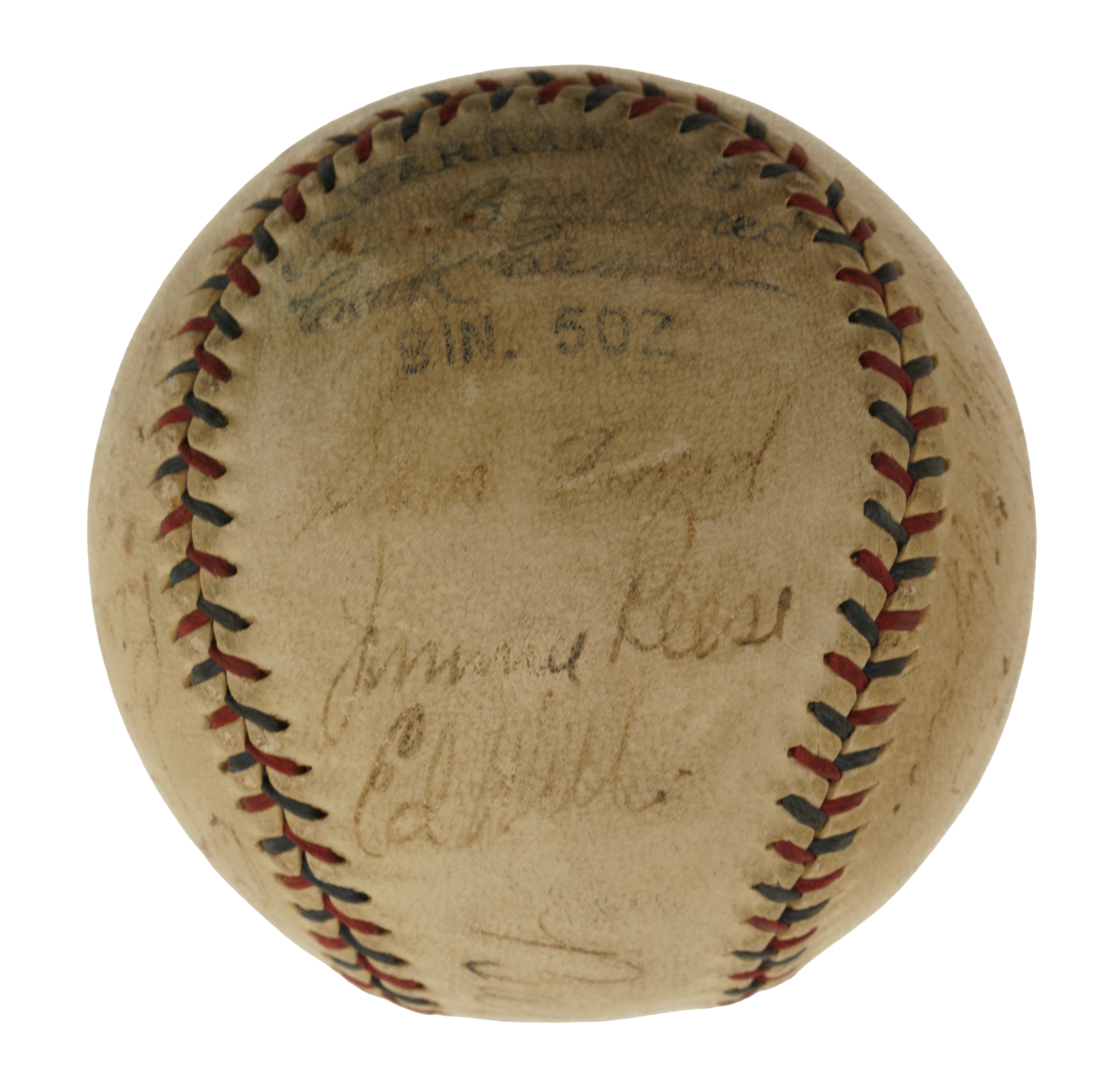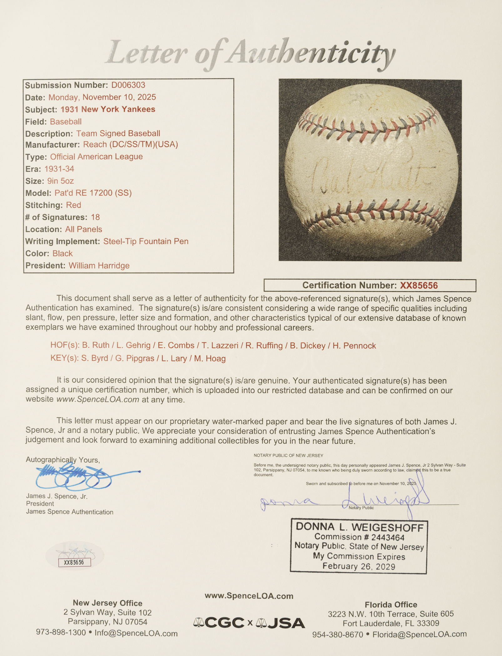 Official American League baseball (Harridge) signed in black ink by eighteen members of the 1931 New York Yankees: Babe Ruth (sweet spot), Lou Gehrig, Lazzeri, Ruffing, Combs, Dickey, Pennock, Pipgras, Byrd, Johnson, Reese, Lary, Jorgens, Wells, Hoag, and three unidentified. The ball displays light toning throughout and a number of small abrasions. The manufacturer's stampings are slightly faded but still remain clearly legible. Full LOA from James Spence/JSA.