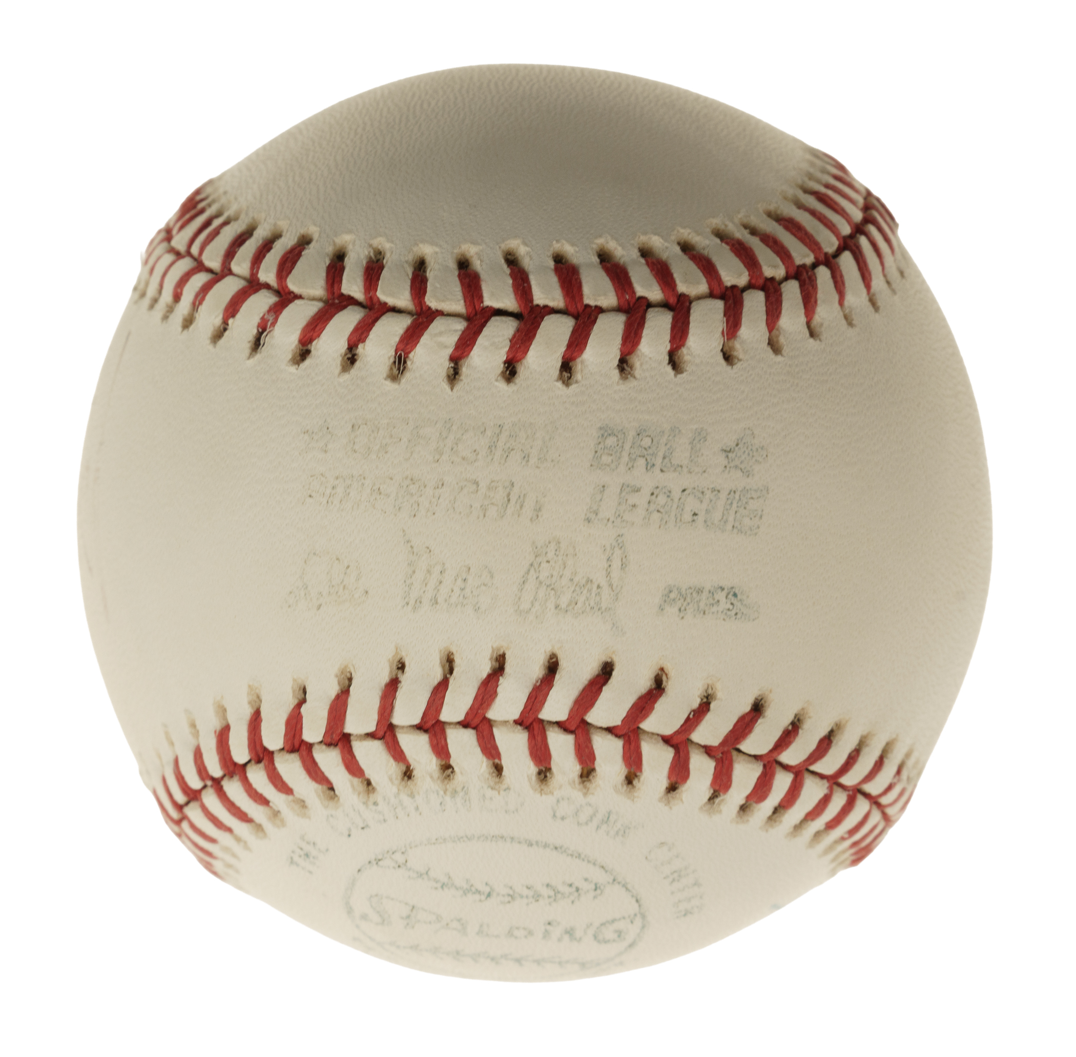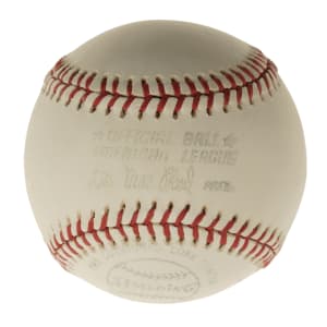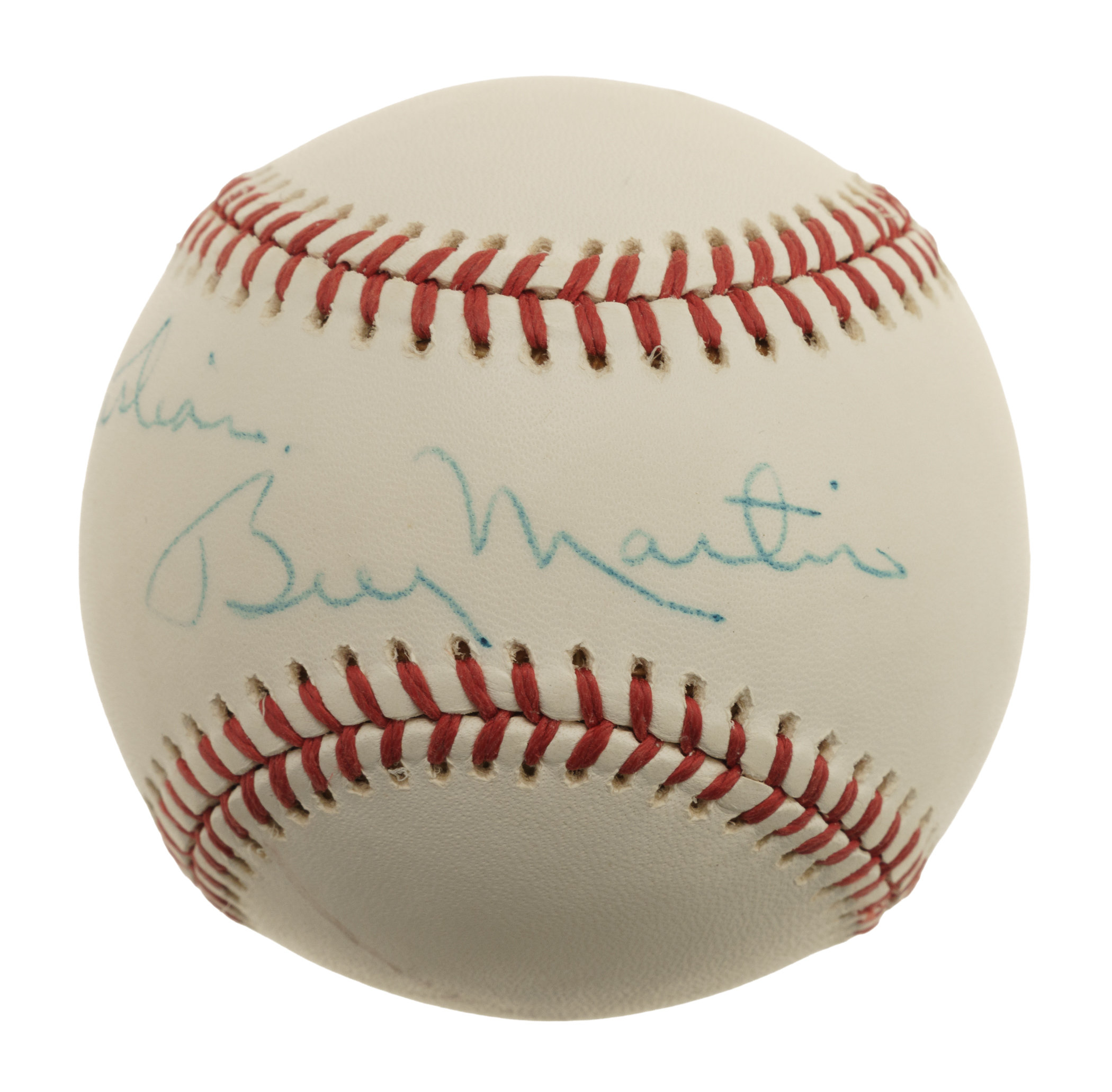 Official American League baseball (MacPhail) signed by Billy Martin and George Steinbrenner. Martin has inscribed "To Christian/Billy Martin" in blue ink along the sweet spot, while Steinbrenner has signed in black ink along a side panel. The ball is in Excellent to Near Mint condition overall. Auction LOA from James Spence/JSA.