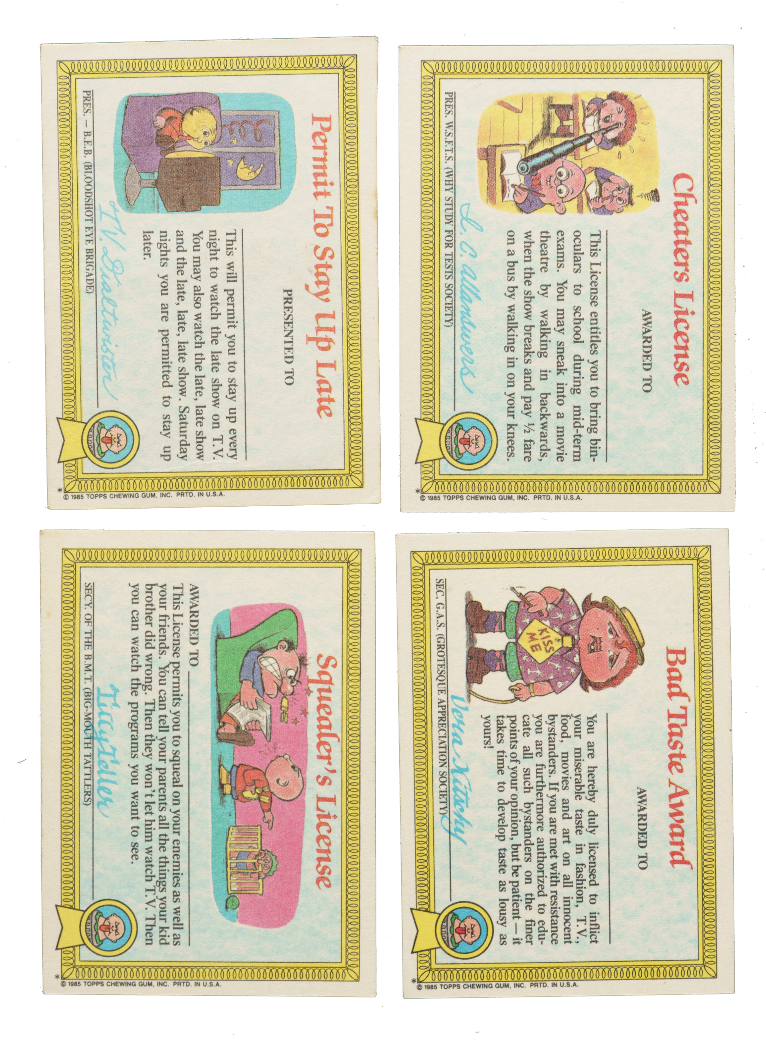 Presented are two sets (one near-complete and one partial) of the 1985 Topps "Garbage Pail Kids" stickers, representing the first two original series of this popular 1980s nonsport issue. Also included are four variations and eleven duplicates. Clearly a parody of Coleco's popular Cabbage Patch Kids dolls (which ultimately led to a trademark infringement lawsuit), Topps Garbage Pail Kids cards were the brainchild of Pulitzer Prize-winning cartoonist Art Spiegelman (of Maus graphic novel fame), who was also the main creator of Topps Wacky Packages. Each sticker features a humorously drawn cartoon kid with a rhyming, alliterative, or word-play nickname. Topps Garbage Pail Kids stickers were an instant hit with youngsters, with many schools banning them because of their edgy content and the distractions they caused. This pair consists of the following: 1) Series 1 Near-Complete Set (71/82) Plus Two Variations and 11 Duplicates: Condition is 26% Ex (including a few higher), 69% Vg to Vg-Ex, and 5% lesser (one Gd and three Pr). Missing the following eleven stickers for completion: #7b, 11b, 14b, 18b, 20b, 27b, 28b, 34b, 35b, 38b, and 39b. Includes both back variations for two stickers (#5a and 8b). #5b is a "Stupid Student" back, 8a is a "Cheaters License" back, and 29a and b are both checklist backs. Keys: #1a Nasty Nick (Vg), 1b Evil Eddie (Pr, pen marks), 8a Adam Bomb (Ex, "Cheaters License" back), 8b Blasted Billy (Pr due to pen on reverse, checklist back), and 8b Blasted Billy (Vg-Ex+, "Cheaters License" back). Duplicates (11): Two #7a, two 14a, two 18a, 22b, 28a, 34a, 39a, and 42a. 2) Series 2 Partial Set (52/84) Plus Two Variations: Condition is 48% Ex to Ex-Mt and 52% Vg to Vg-Ex (including one Pr). Missing the following thirty-two stickers for completion: #44a, 44b, 45a, 46b, 48a, 53a, 53b, 54a, 54b, 55b, 60a, 61a, 61b, 62b, 63a, 63b, 65a, 65b, 68a, 69a, 70a, 71b, 72a, 74b, 75a, 76a, 77a, 78a, 78b, 79a, 81b, and 83b. Includes both back variations for two stickers (#42a and 42b). #49b is the original "Schizo Fran" front variation. This is a very attractive collection of mid-grade stickers from these popular 1980s nonsport sets. Total: 138 stickers (set pair of 123 plus four variations and eleven duplicates).