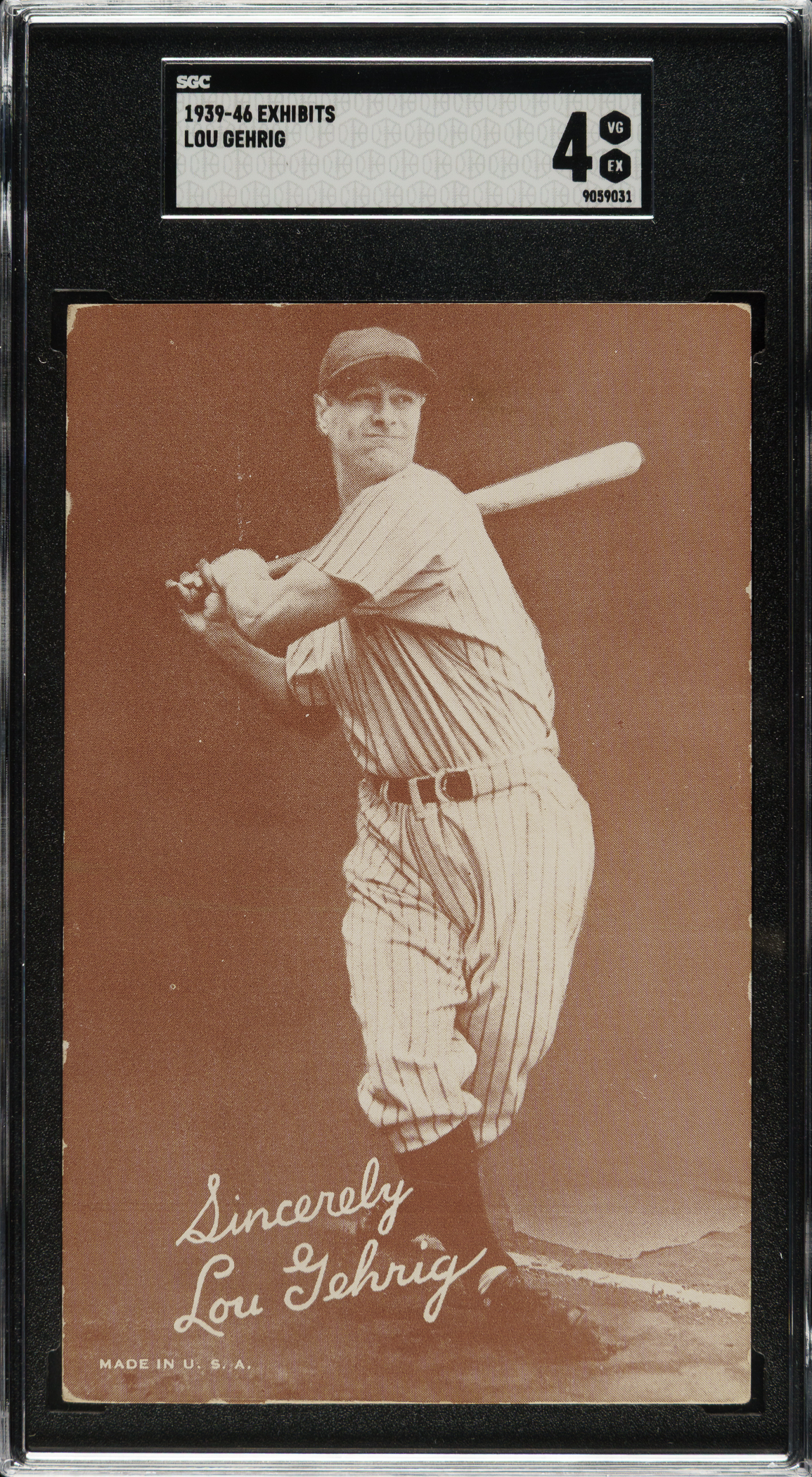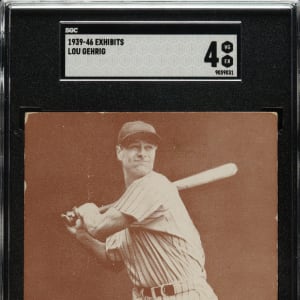 Graded VG/EX 4 by SGC. Classic example of New York Yankees Hall of Famer Lou Gehrig from the Salutation Exhibits set. These unnumbered cards are not dated and were issued over a series of years, and they are generally collected as a single set. Some cards in this Exhibit-card series were issued for numerous years, while other players were issued for only a short period of time, creating many rarities. Gehrig is one of the players who fall into the latter category, unfortunately, as his debilitating disease ended his prolific baseball career in April 1939, right as this set was issued (Gehrig succumbed to his disease in 1941 at the age of 37). This makes the offered card the final card ever issued of Lou Gehrig as a player. The card has a crisp image with a clean facsimile signature ("Sincerely, Lou Gehrig"). Downgraded due to light-to-moderate corner and edge wear.