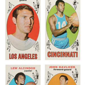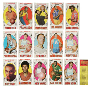 Presented is an exceptional mid- to high-grade near-complete set of 1969-1970 Topps basketball, highlighted by numerous stars and key rookie cards, including Hall of Famers John Havlicek and Lew Alcindor (Kareem Abdul-Jabbar). This set represents Topps' first large-scale basketball effort in over a decade (since its first issue in 1957) and is extremely popular with collectors due to its size, design, and star selection. Missing only #1 Wilt Chamberlain for completion. Condition is 15% Nr/Mt (including a couple Nr/Mt-Mt), 65% Ex to Ex-Mt, and 20% Vg to Vg-Ex (including one slightly lesser). Keys: #2 Goodrich RC (25/75 L/R and B/T, otherwise Ex-Mt), 10 Thurmond RC (Ex-Mt), 15 Hawkins RC (Vg-Ex), 20 Havlicek RC (Ex+), 25 Alcindor RC (Vg+), 35 Baylor (Ex+), 40 Cunningham RC (Vg-Ex), 43 Bradley RC (Vg-Ex), 44 Wilkens (Nr/Mt-Mt), 45 Lucas RC (Ex-Mt), 50 Robertson (Ex-Mt), 55 Bing RC (Ex), 56 Unseld RC (Nr/Mt due to centering), 60 Reed RC (20/80 L/R, otherwise Ex-Mt+), 75 Hayes RC (Ex-Mt), 80 Monroe RC (Ex-Mt), 85 DeBusschere RC (Ex+), 90 West (Ex), 98 Frazier RC (Ex), and 99 Checklist (Vg). This is a very attractive, crisp, and clean near-complete set (minus one) of this significant and popular early Topps basketball issue. Total: 98 cards.