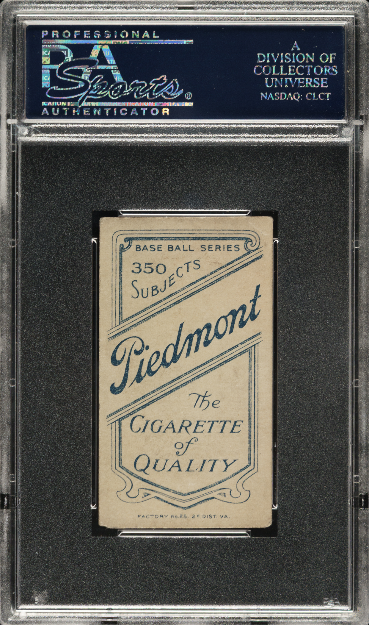 Graded VG 3 by PSA. Very attractive mid-grade example of this classic tobacco card of Detroit Tigers Hall of Famer Ty Cobb. The T206 Ty Cobb bat-off-shoulder pose is one of the key cards in the set. The offered card has bold colors, honest corner wear, and excellent centering. There is a small crease near the upper-left corner noted for accuracy. Boldly printed Piedmont 350/25 advertising reverse.