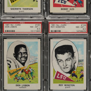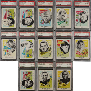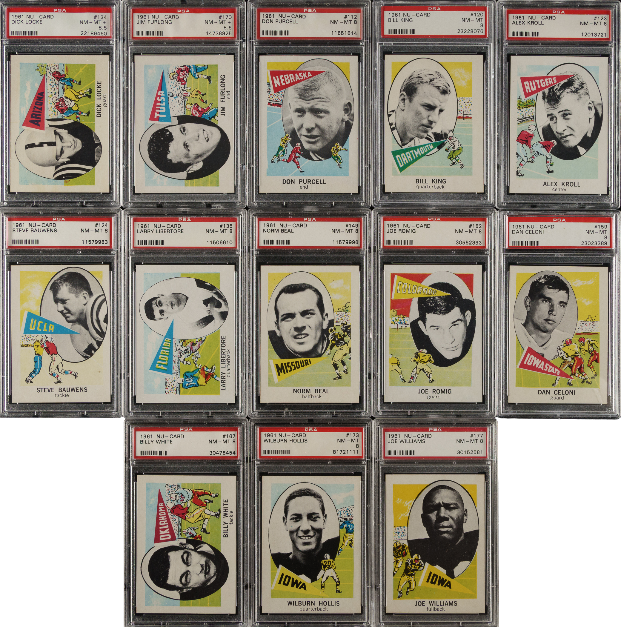 Collection of seventeen 1961 Nu-Card football cards, each graded and encapsulated by PSA. PSA Grading Composite: NM-MT+ 8.5 (6 cards): #109, 116, 134, 150, 163, and 170. NM-MT 8 (11 cards): #112, 120, 123, 124, 135, 149, 152, 159, 167, 173, and 177. Total: 17 cards. The size/weight of this item requires that there will be an additional shipping charge for this lot.