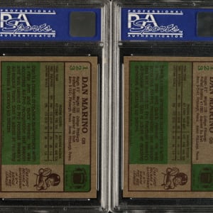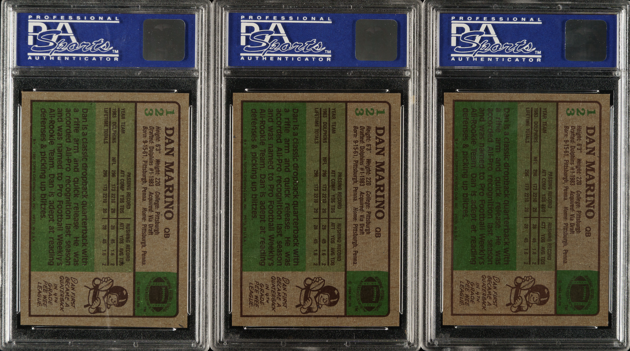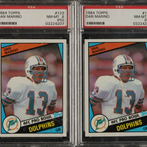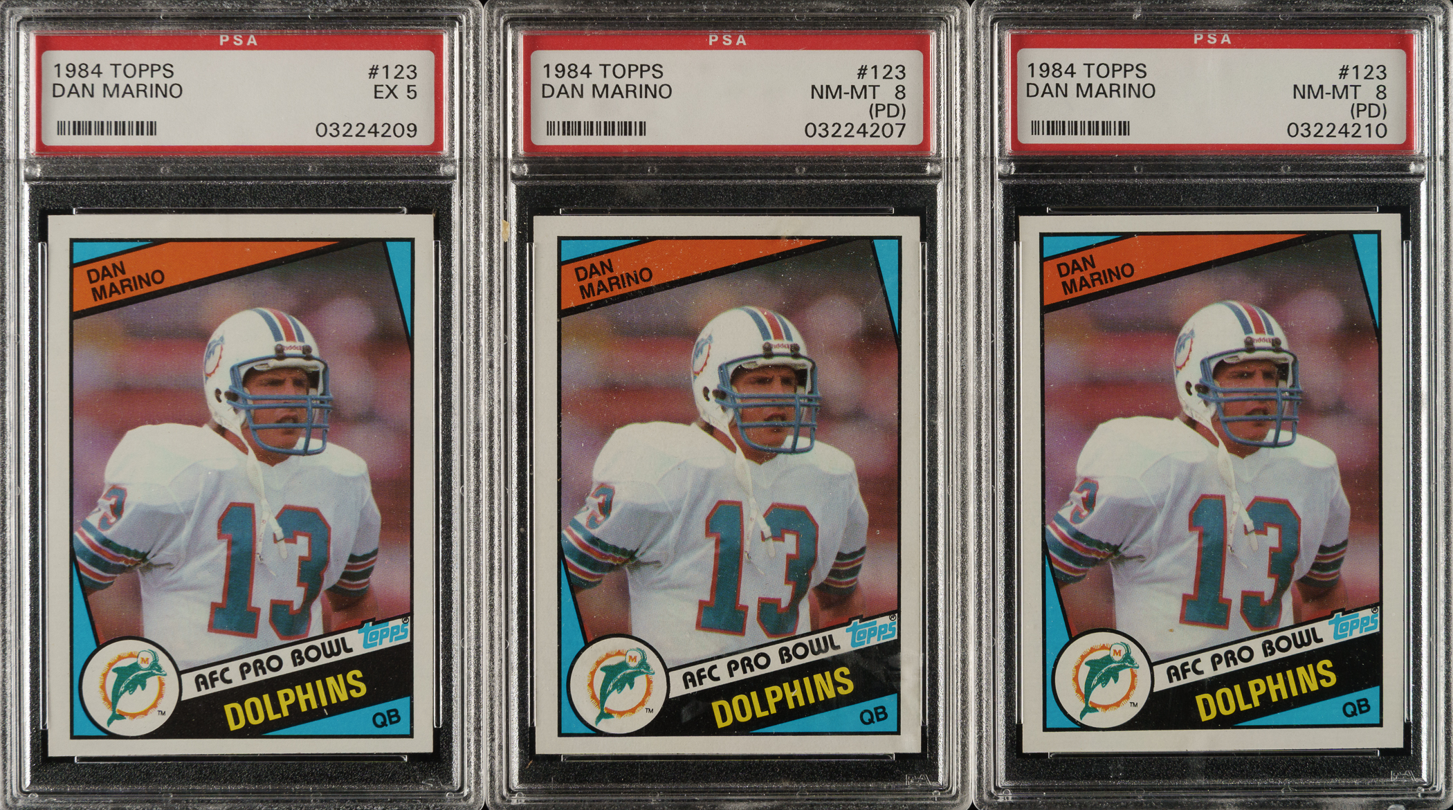 Trio of 1984 Topps Football cards, featuring Miami Dolphins football Hall of Famer Dan Marino. Each card has been graded and encapsulated by PSA. This trio consists of the following: Three #123 Marino RC (one EX 5 and two NM-MT 8 PD). Total: 3 cards.