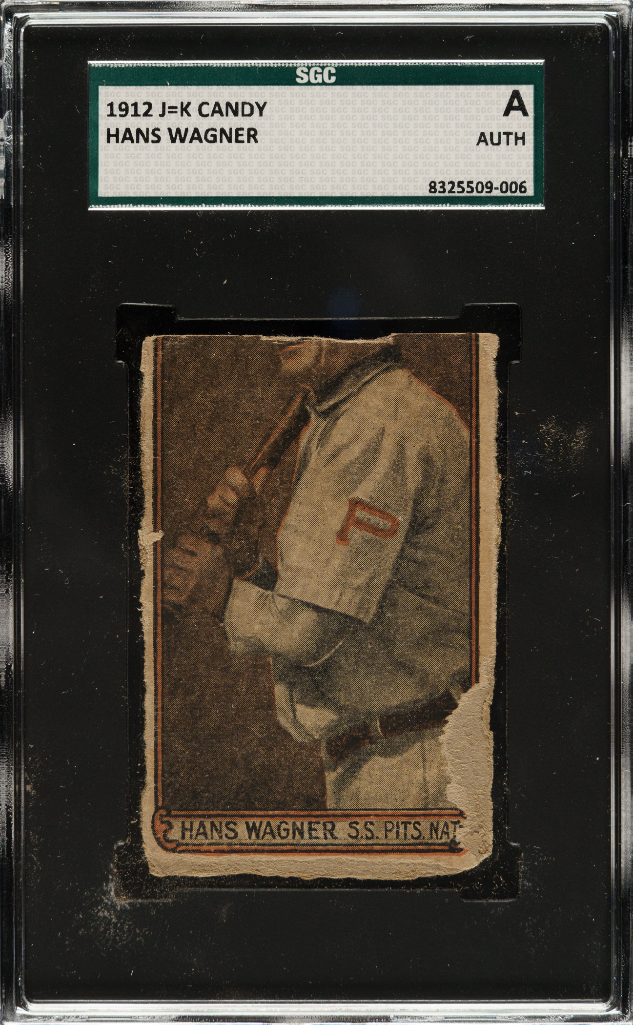 Presented is one of only four examples of Pittsburgh Pirates Hall of Famer Honus Wagner ever graded from the extremely rare 1912 J=K Candy issue. This is a Type II card with a colorized photo of Wagner holding his bat. (Please note SGC does not differentiate between the Type 1 and Type 2 cards in their population report.) Issued in 1912 by the J. Koenigsberg company of New York, each card was designed to be hand-cut from the side of a candy box containing one of the company's products. J=K Candy cards can be found in two distinct versions: the sepia Type I and a colorized die-cut Type II variety (as offered here). Encapsulated as "Authentic" by SGC due to an irregular hand-cut across the top (missing a portion of Wagner's head), the image is crisp with paper loss on the lower right edge and light creases visible. The blank reverse is clean. These cards naturally tend to grade very modestly due to their method of issue and hand-cut nature. Examples from this unusual 1910-era candy issue are extremely rare, and an example of a key Hall of Famer such as Honus Wagner is virtually never encountered. This is an extremely elusive rarity that would be an outstanding addition to any world-class Honus Wagner or type-card collection.