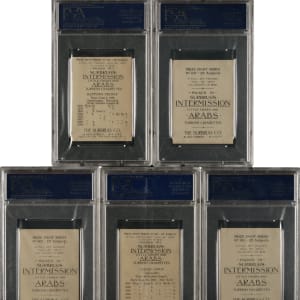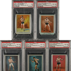 Collection of five 1911 T225 Surbrug "Prize Fight Series 101" cards, featuring boxing Hall of Famers Battling Nelson and Harry Lewis. Each card has been graded and encapsulated by PSA. PSA Grading Composite: EX 5 (1 card): Nelson. VG-EX 4 (4 cards): Barry, Coulon, Lewis and Stewart. Total: 5 cards.