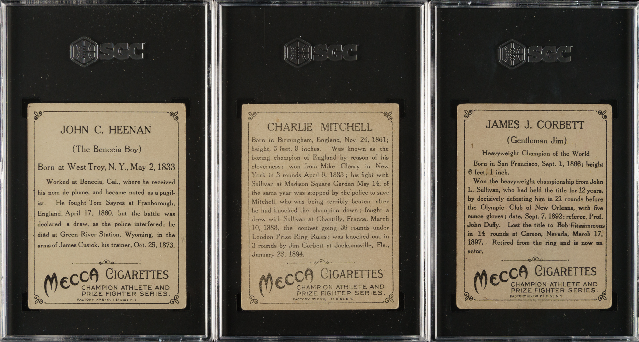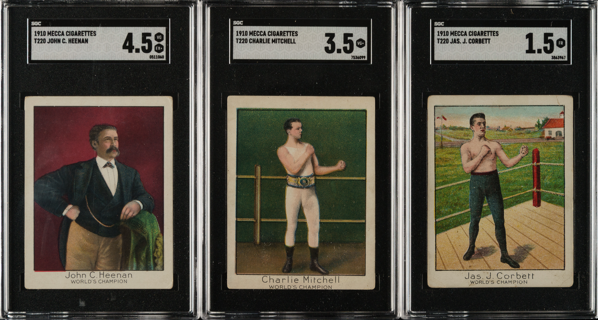 Trio of 1910 T220 Mecca Champions Boxing cards, featuring boxing Hall of Famers James Corbett, Charlie Mitchell and John Heenan. Each card has been graded and encapsulated by SGC. This trio consists of the following: Corbett (FAIR 1.5), Heenan (VG/EX+ 4.5), and Mitchell (VG+ 3.5). Total: 3 cards.