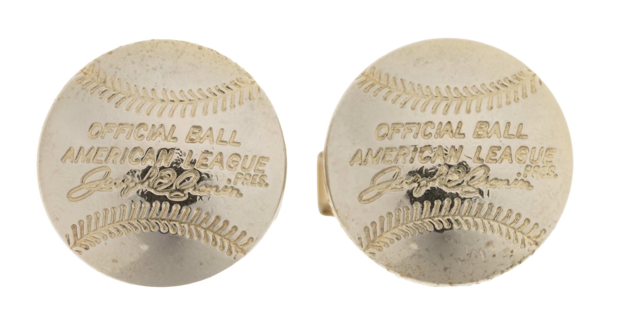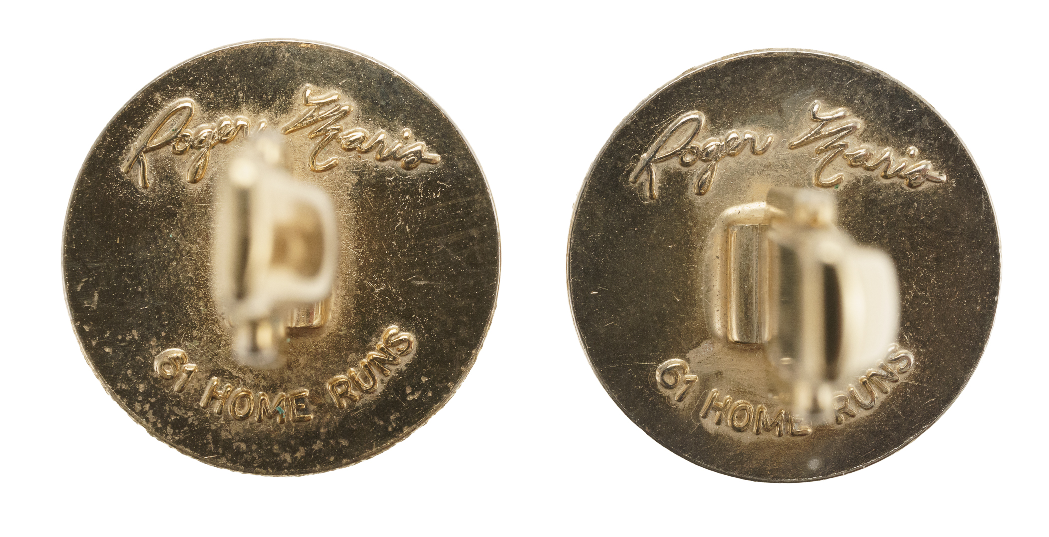 Pair of cufflinks produced to commemorate Roger Maris' record-breaking 61 home run season in 1961. The cufflinks feature an Official American League baseball design with Joe Cronin's facsimile signature on the front and have "Roger Maris/61 Home Runs" engraved on the back. The cufflinks display no manufacturer's stamping nor any indication of the gold content. Excellent to Near Mint condition overall.