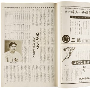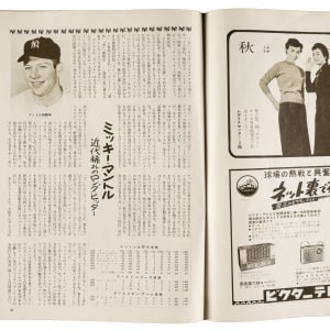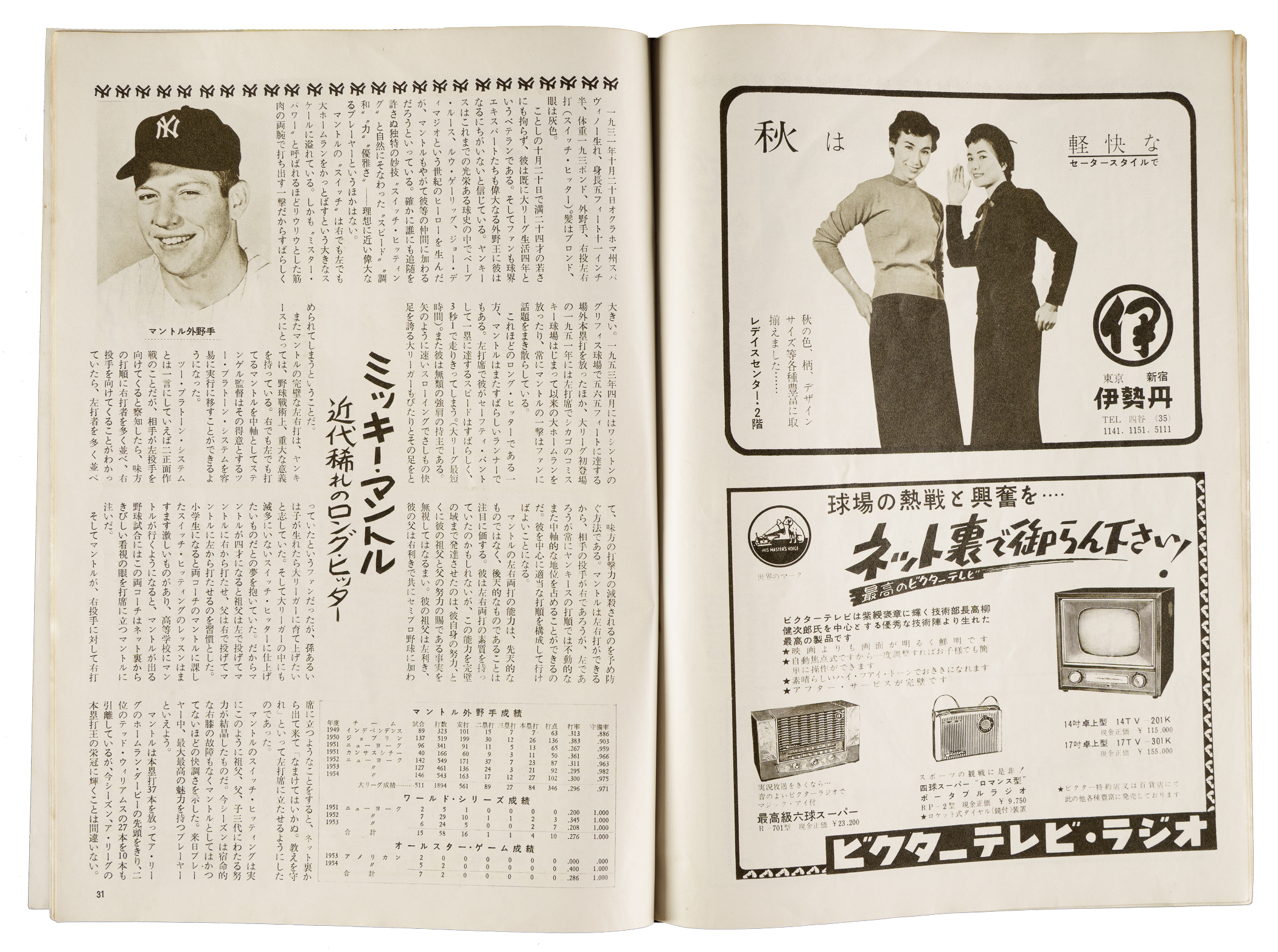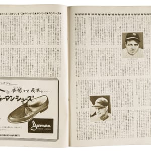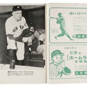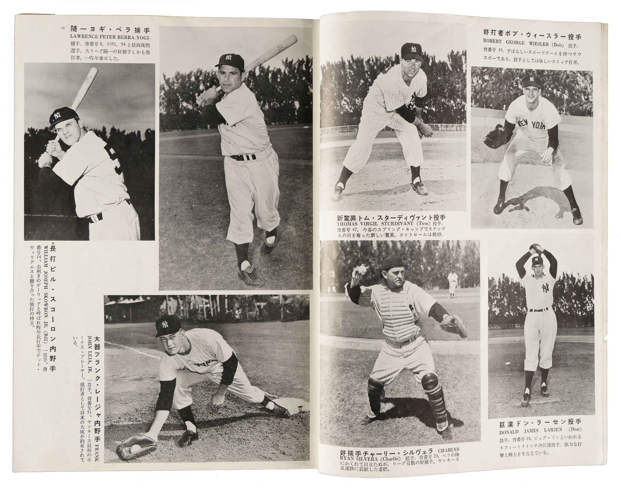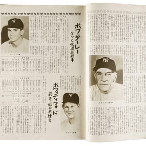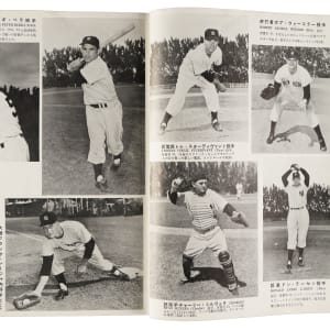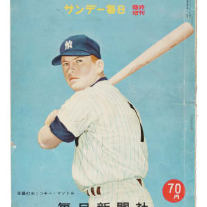 Offered is an extremely scarce magazine originating from Japan featuring Mickey Mantle on the cover. Issued during the New York Yankees "Tour of Japan" in 1955, the magazine has numerous other photos picturing both Mantle and other Yankees ballplayers, plus those of Babe Ruth and Lou Gehrig on the interior pages. This is just the third example of this scarce publication that we have offered in the past 20-plus years. The text of the extensive historical information is in Japanese. The display value of the cover makes this item especially appealing to Mickey Mantle collectors. The substantial soft-cover publication (8-1/4 x 11-5/8 inches) exhibits moderate handling wear, with creasing and a small edge tear visible along the front cover. The interior pages, minus a few minor flaws, present beautifully. Very Good condition overall.