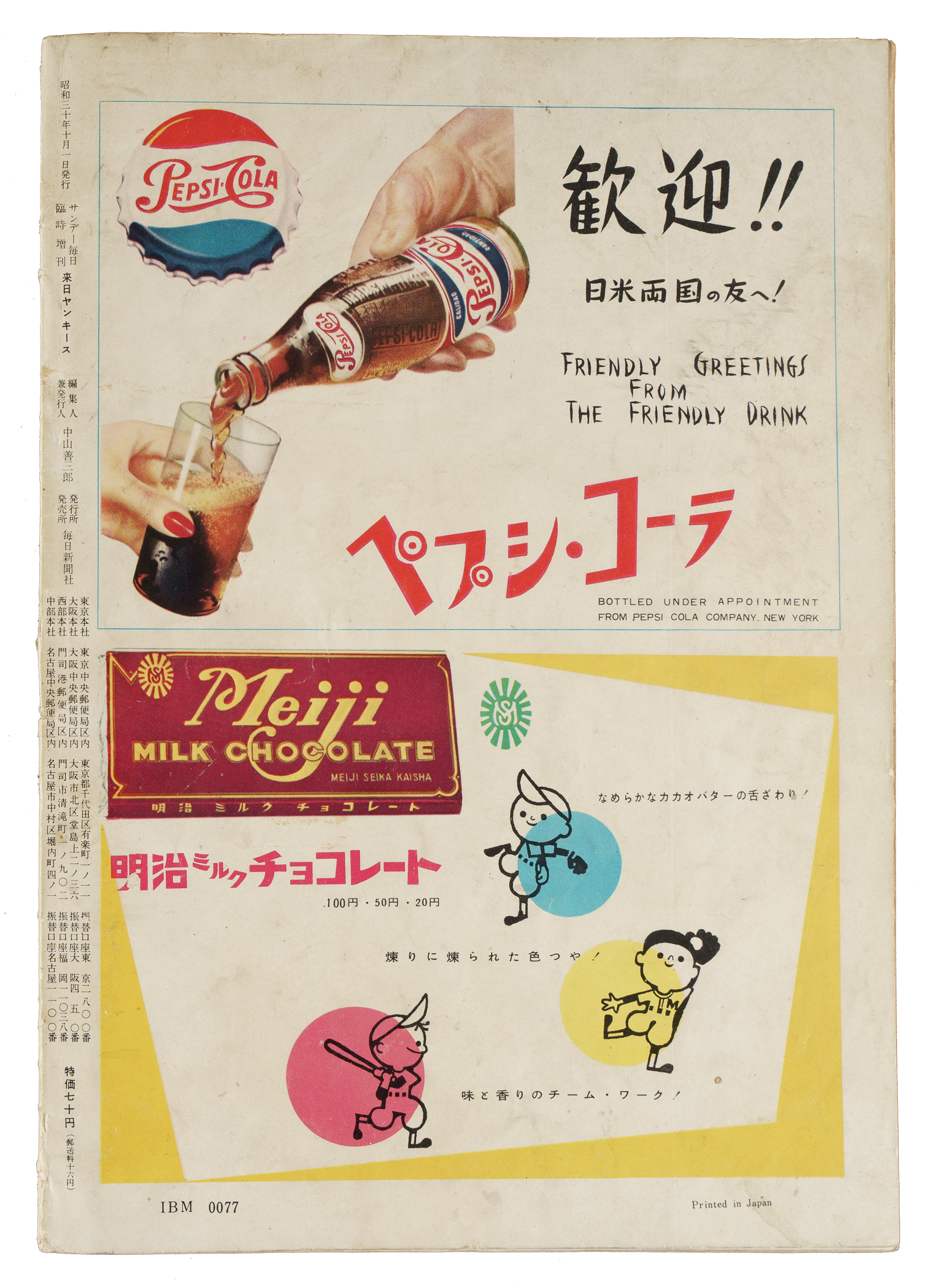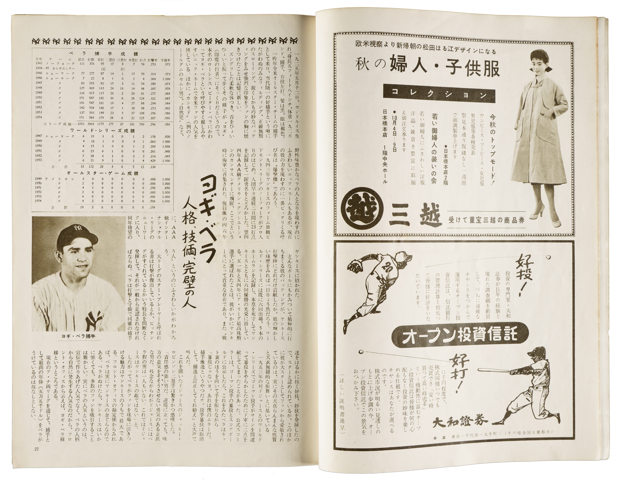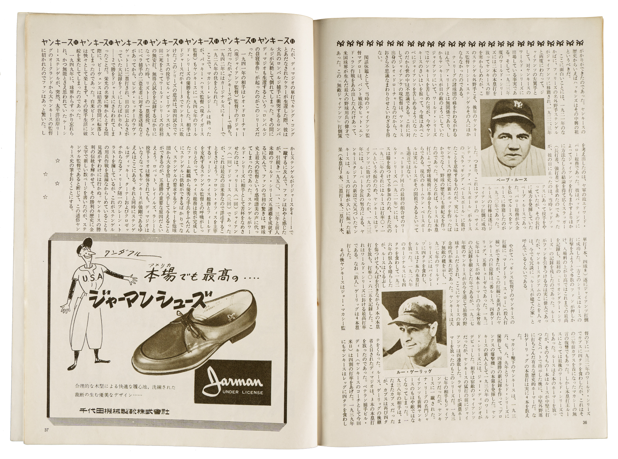 Offered is an extremely scarce magazine originating from Japan featuring Mickey Mantle on the cover. Issued during the New York Yankees "Tour of Japan" in 1955, the magazine has numerous other photos picturing both Mantle and other Yankees ballplayers, plus those of Babe Ruth and Lou Gehrig on the interior pages. This is just the third example of this scarce publication that we have offered in the past 20-plus years. The text of the extensive historical information is in Japanese. The display value of the cover makes this item especially appealing to Mickey Mantle collectors. The substantial soft-cover publication (8-1/4 x 11-5/8 inches) exhibits moderate handling wear, with creasing and a small edge tear visible along the front cover. The interior pages, minus a few minor flaws, present beautifully. Very Good condition overall.