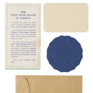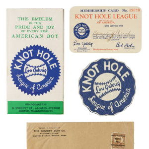 In 1934, the Goudey Gum Company began a sales promotion consisting of the establishment of a youth organization, called the Knot Hole League, which featured Lou Gehrig as the spokesman and president of the club. Membership in the club made youngsters eligible for prizes, which could be obtained only by the redemption of gum wrappers from the company's baseball-card issues. Offered here is a collection of four items relating to the Knot Hole League. This collection consists of the following: 1) Knot Hole League fold-out brochure, which outlines the Club's goals and benefits and also pictures the prizes which were available from the company, including the R309 standup premiums (3.25 x 6 inches, folded; Vg). 2) Membership card issued to Homer Ulrich (4.25 x 2.75 inches; Gd-Vg). 3) Knot Hole League felt patch (3.25 inches in diameter; Ex-Nm). 4) Original mailing envelope, addressed to Homer Ulrich (6.25 x 4 inches; Vg). Total: 4 items.