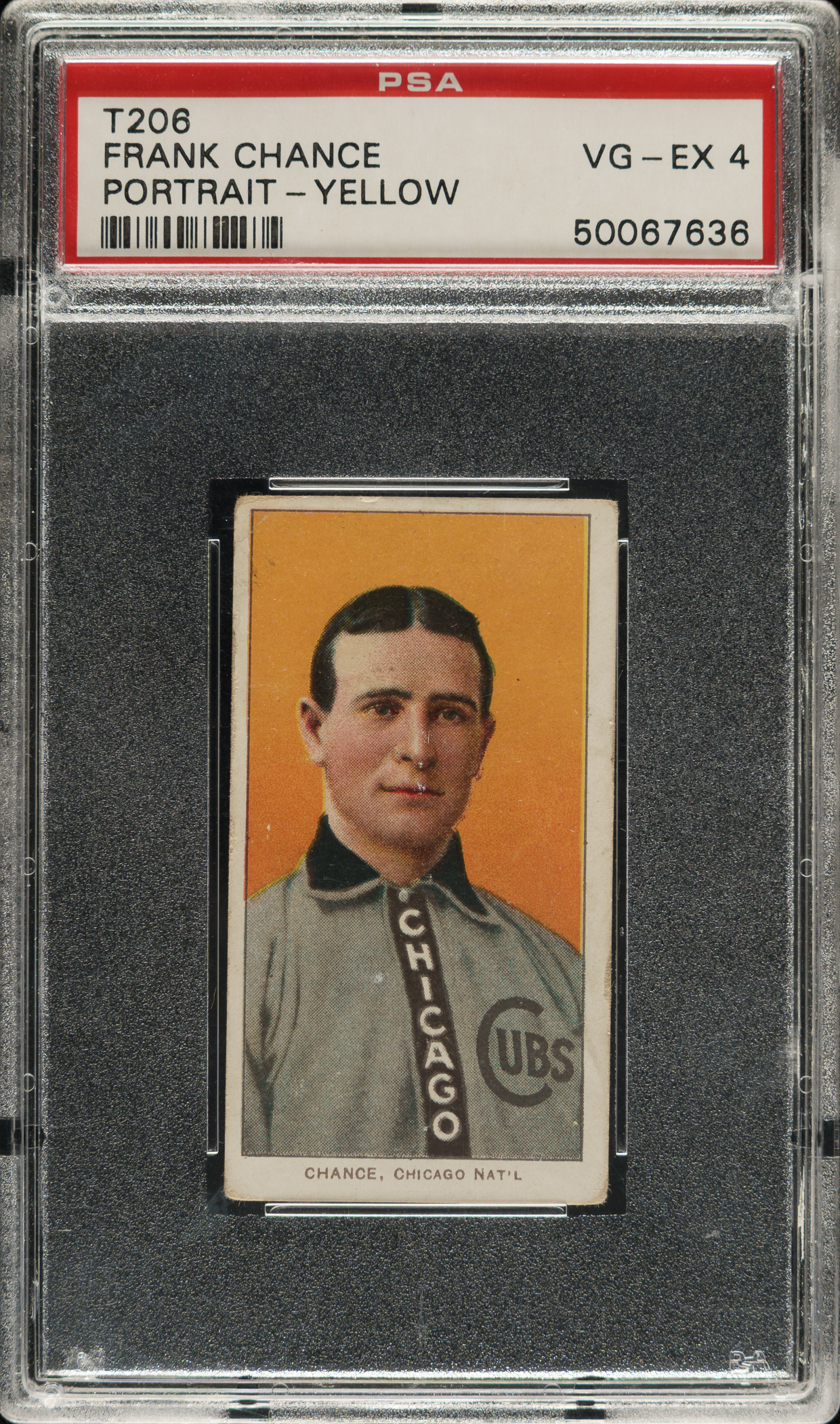 Lot # 210: 1909-1911 T206 White Border Frank Chance Portrait Yellow Background PSA VG-EX 4