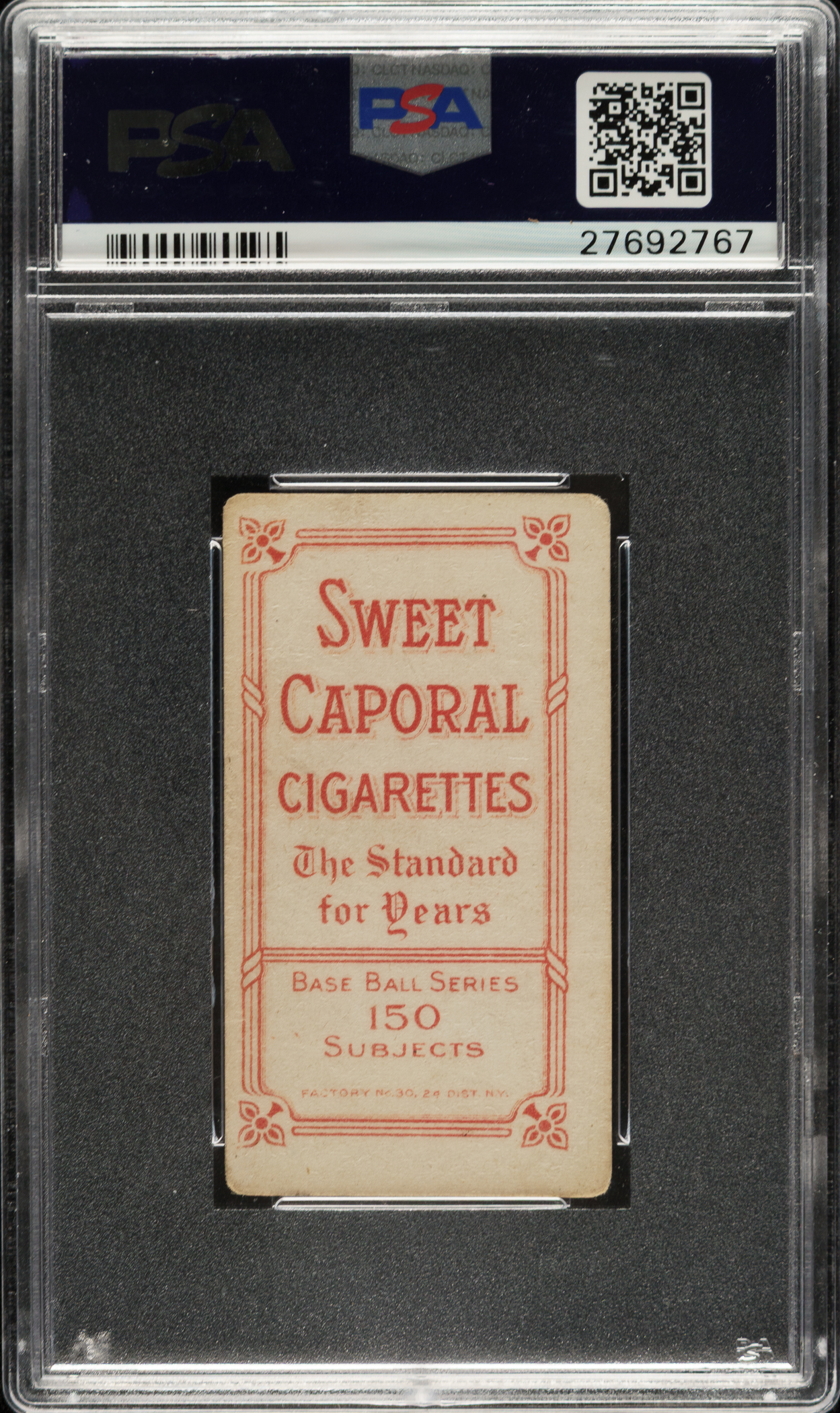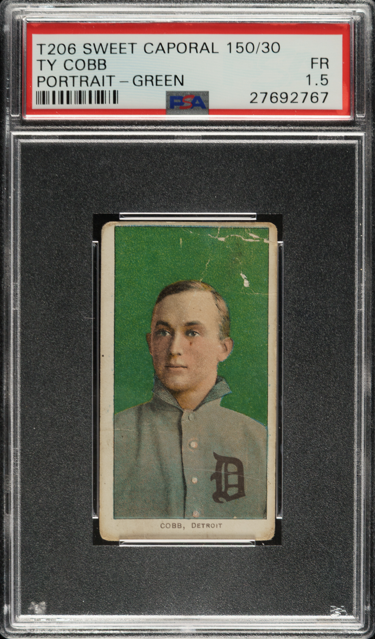 Graded FAIR 1.5 by PSA. Appealing example of this classic tobacco card of Detroit Tigers Hall of Famer Ty Cobb. The green-background pose has long been considered the rarest of the four poses of Cobb in the T206 set. The offered card displays beautiful colors, outstanding registration, and moderate corner wear. Boldly printed Sweet Caporal 150/30 advertising reverse. Scattered creasing and a surface indentation along the bottom border contribute to the assigned grade.