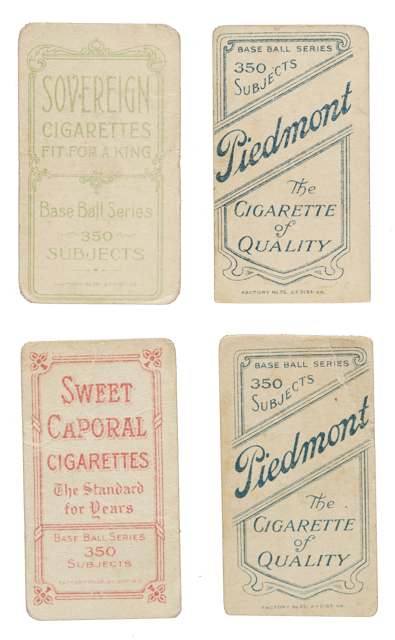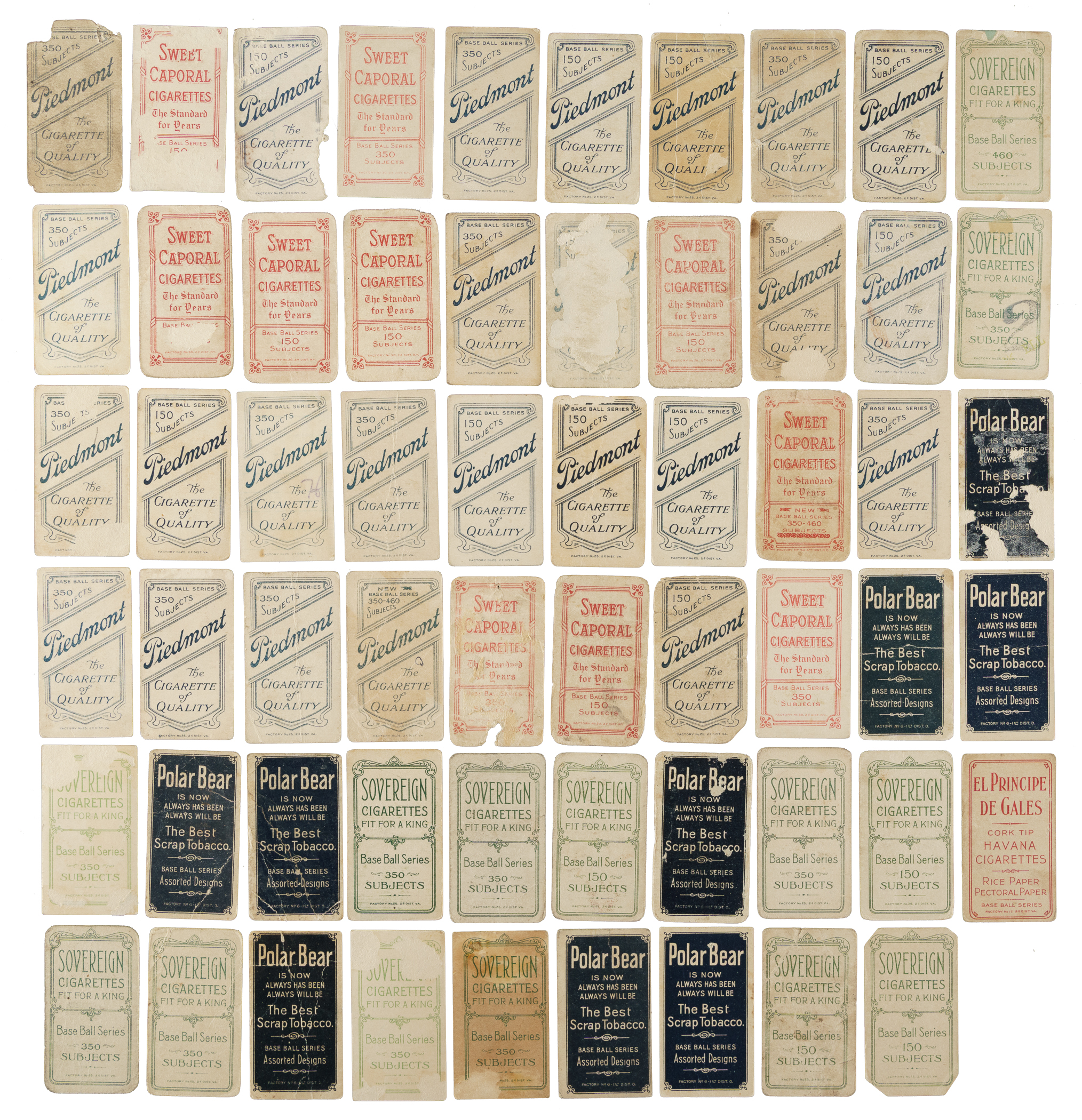 Collection of 63 different cards from the classic T206 White Border series. Condition is 10% Gd to Vg (one slightly better) and 90% Pr to Fr (including three trimmed and three missing pieces). Keys: Dahlen/Brooklyn (Pr), Leifield/batting (Pr, Sovereign 350 back, name at top), Magee/portrait (trimmed, otherwise Gd), Spade (Fr, El Principe De Gales back), and Street/portrait (Pr). While certainly not in high grade, the collection is still very presentable, with only a few exceptions. All cards have a Piedmont or Sweet Caporal advertisement on their reverses except for nine Polar Bear, one El Principe De Gales, and fifteen Sovereign. T206s perhaps more so than any other vintage issue are extremely popular in all grades. This is an ideal collection of cards for the collector who wants real, authentic 1910-era tobacco cards but isn't interested in spending the fortune it would take to acquire them in significantly higher grade. Total: 63 cards.