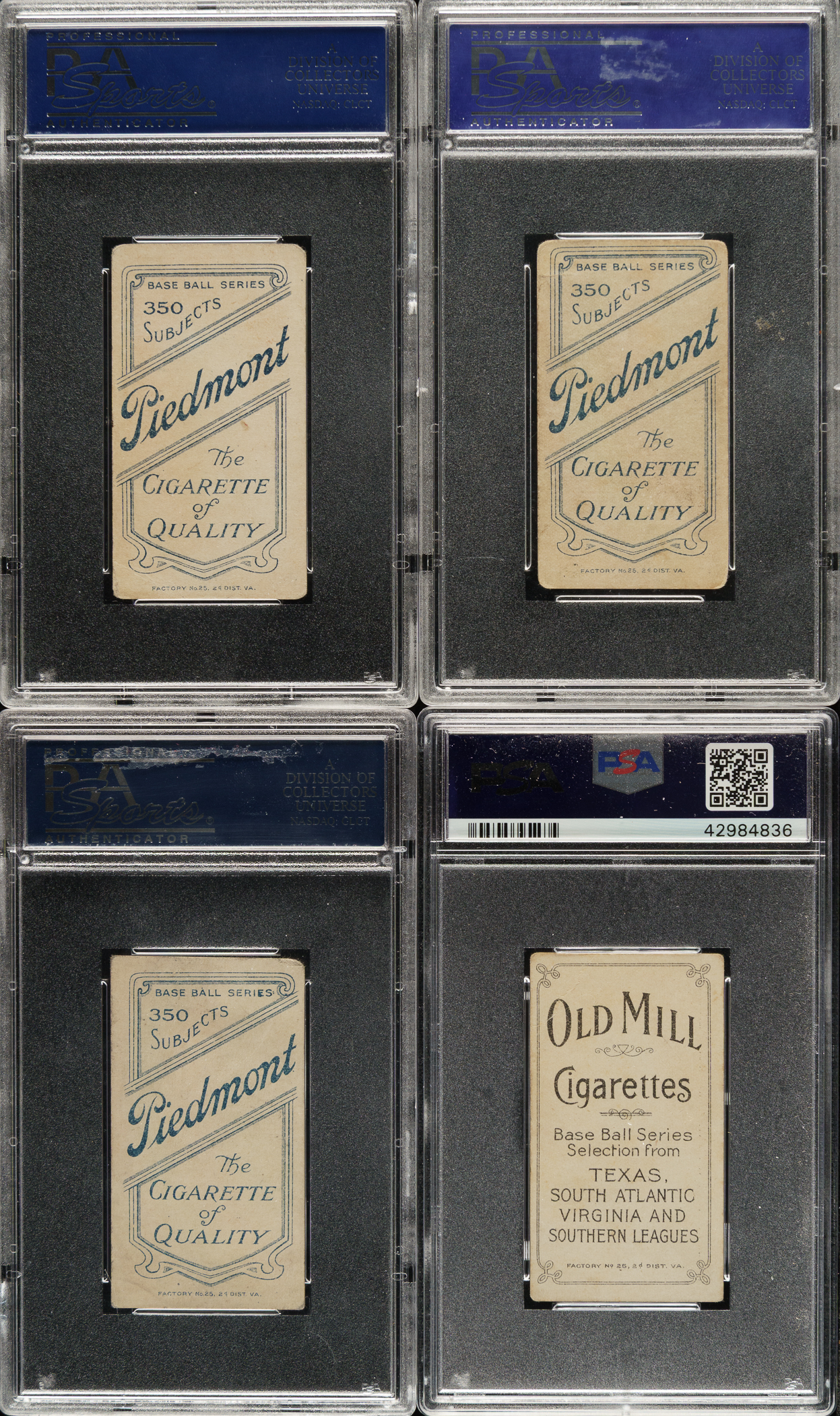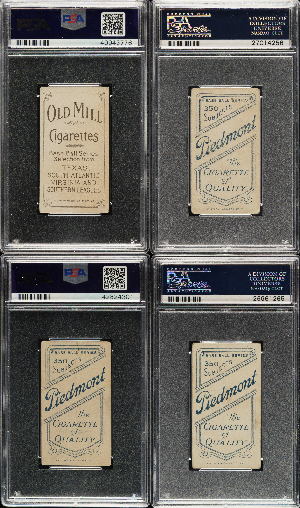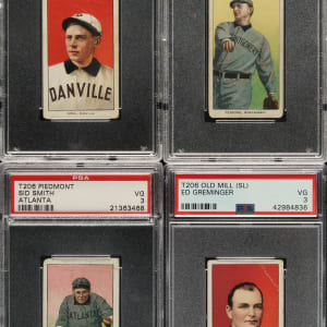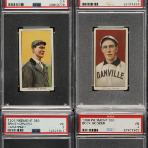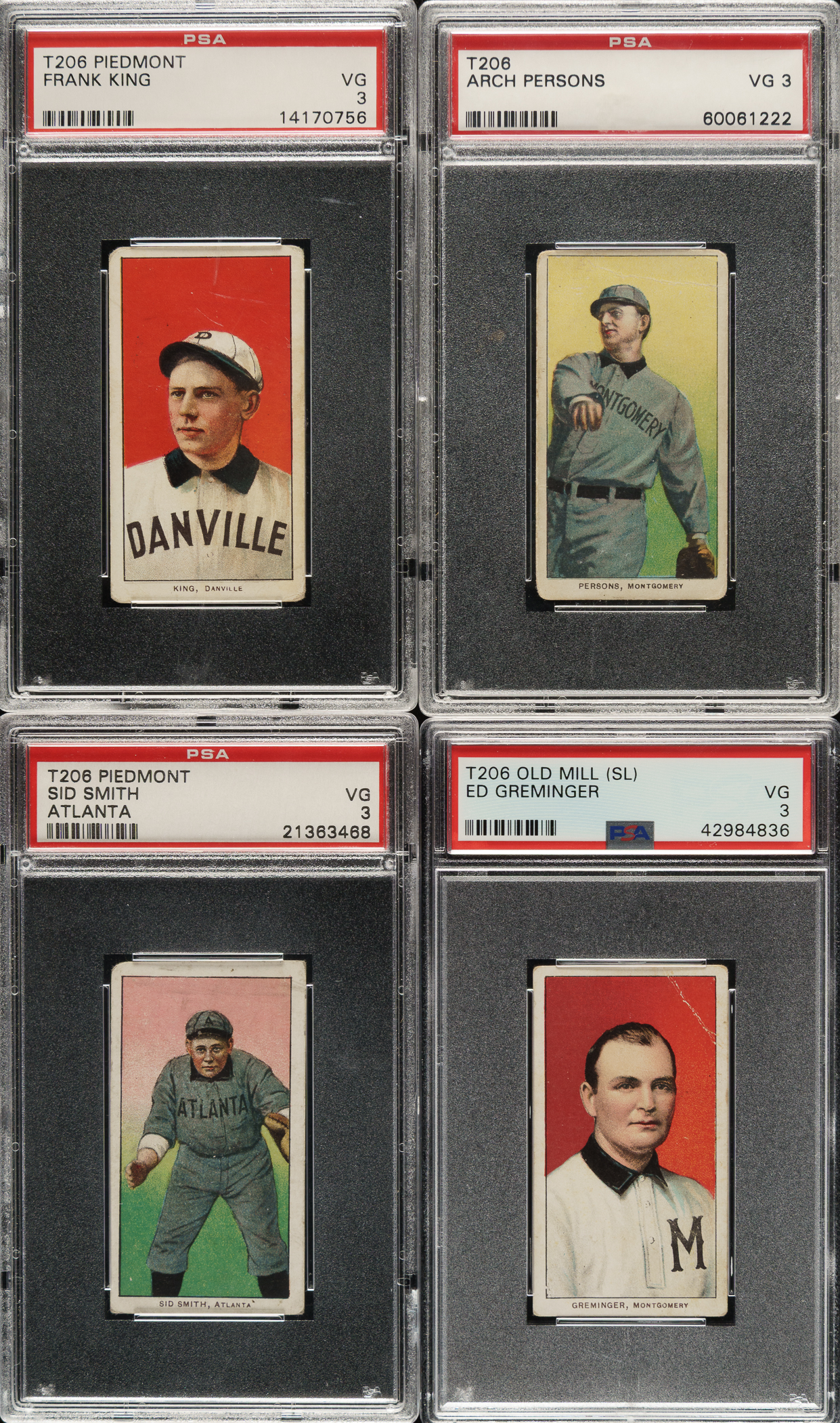 Collection of eight 1909-1911 T206 White Border southern leaguers, each professionally graded and encapsulated VG 3 (one VG+ 3.5) by PSA. This collection features two Old Mill advertising backs. This collection consists of the following: Bastian (VG+ 3.5, Old Mill back), Greminger (Old Mill back), Hooker, E. Howard, King, Persons, S. Smith, and Westlake. Total: 8 cards.