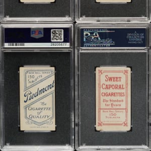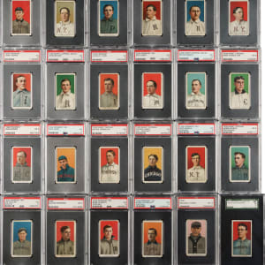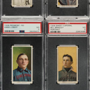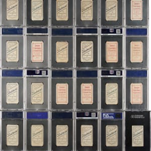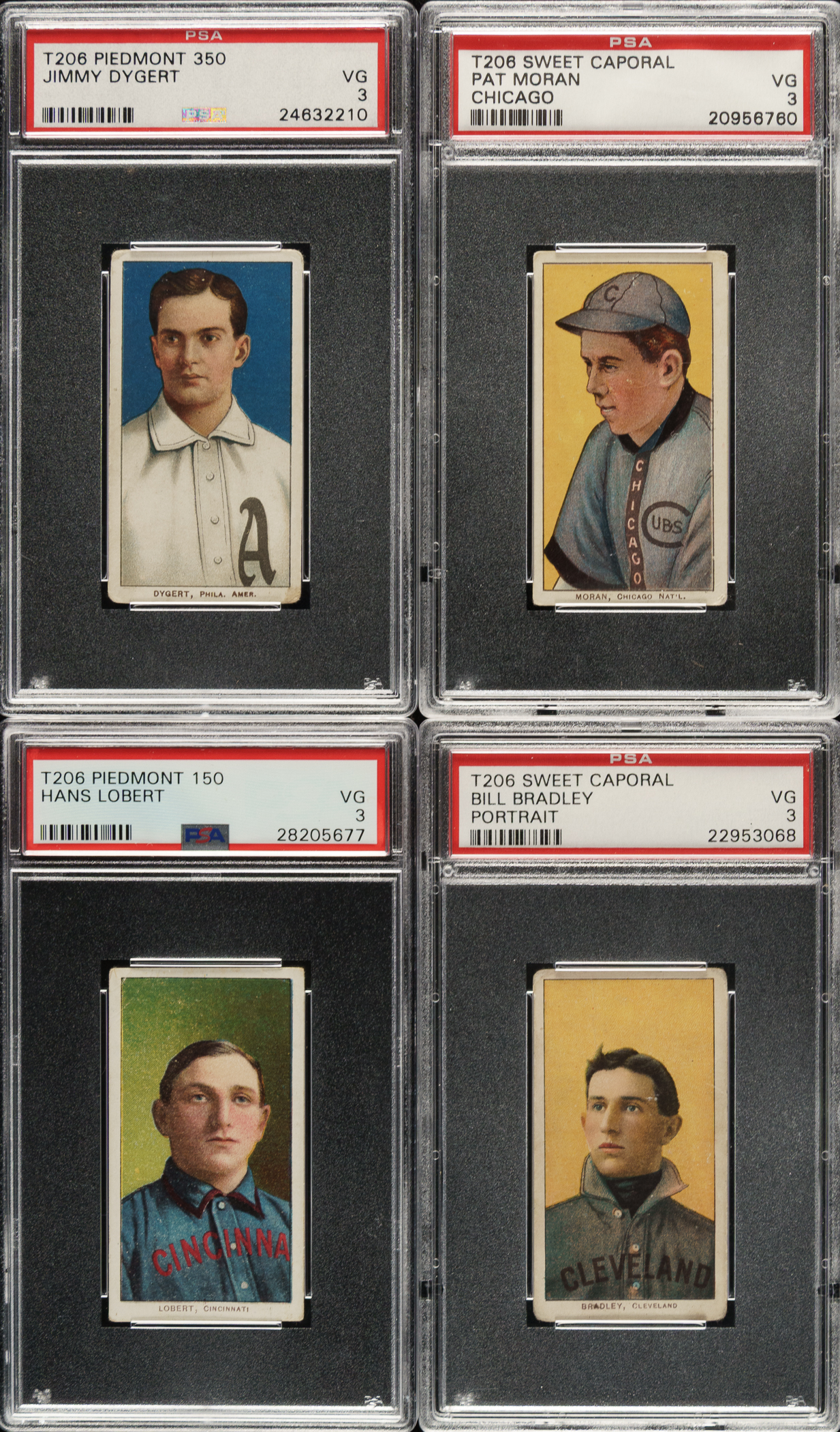 Collection of 28 different cards from the T206 White Border set, each graded and encapsulated as VG 3 by PSA (except one SGC). This collection is composed exclusively of players in portrait pose. Portraits are a very distinctive subset of T206, making this collection a particularly striking assemblage of T206s. This collection consists of the following: Abstein, Ames, Arndt, Barger, Batch, Bradley, Bridwell/no cap, Burke, Butler, Carr, Casey, Cassidy, Congalton, Dorner, Dygert, Egan, Grimshaw, F. Jones, Lobert, Merkle, H. Moran, P. Moran, O'Neil, Pickering (SGC 40), Quillen, Rossman, Schmidt, and Steinfeldt. Total: 28 cards. The size/weight of this item requires that there will be an additional shipping charge for this lot.