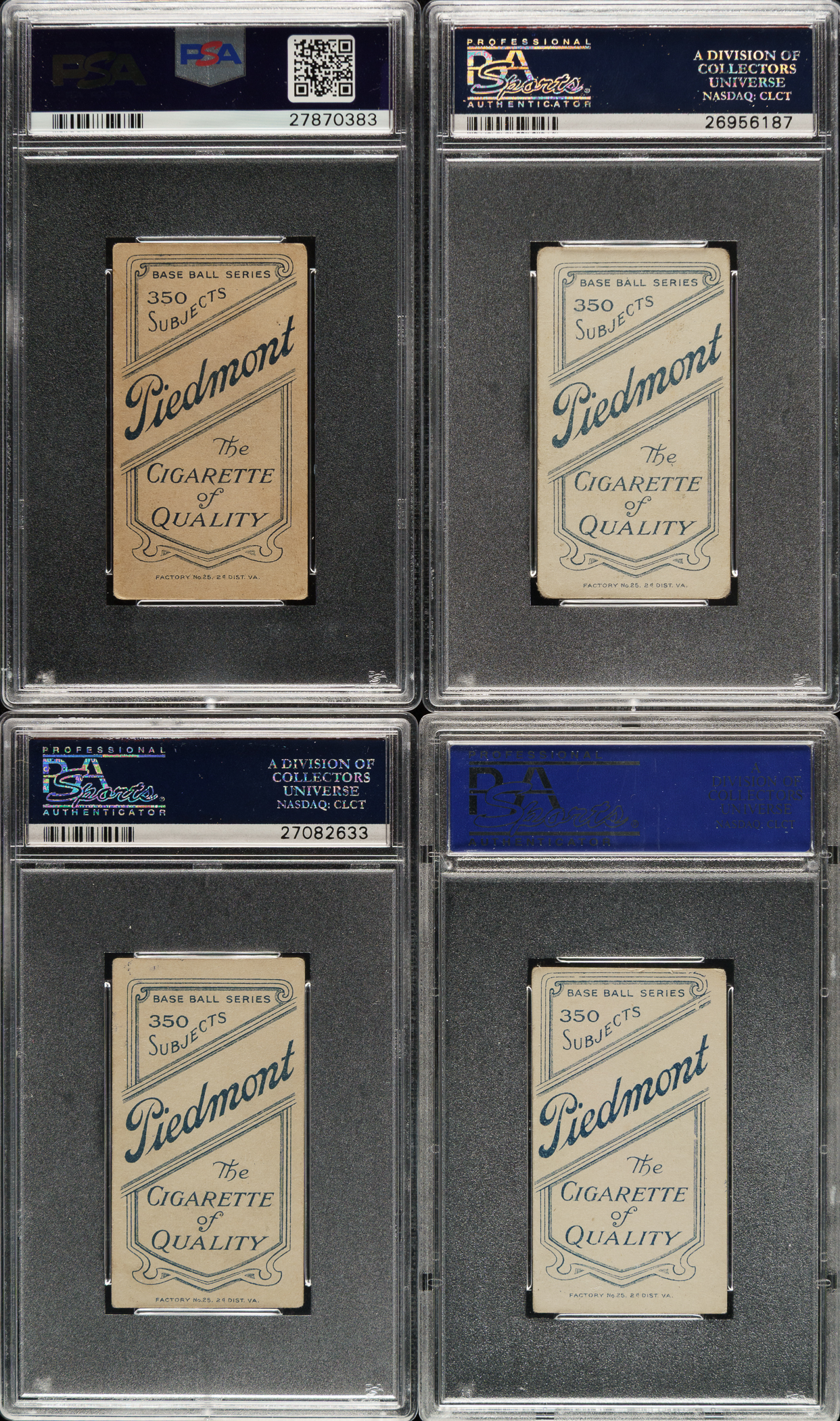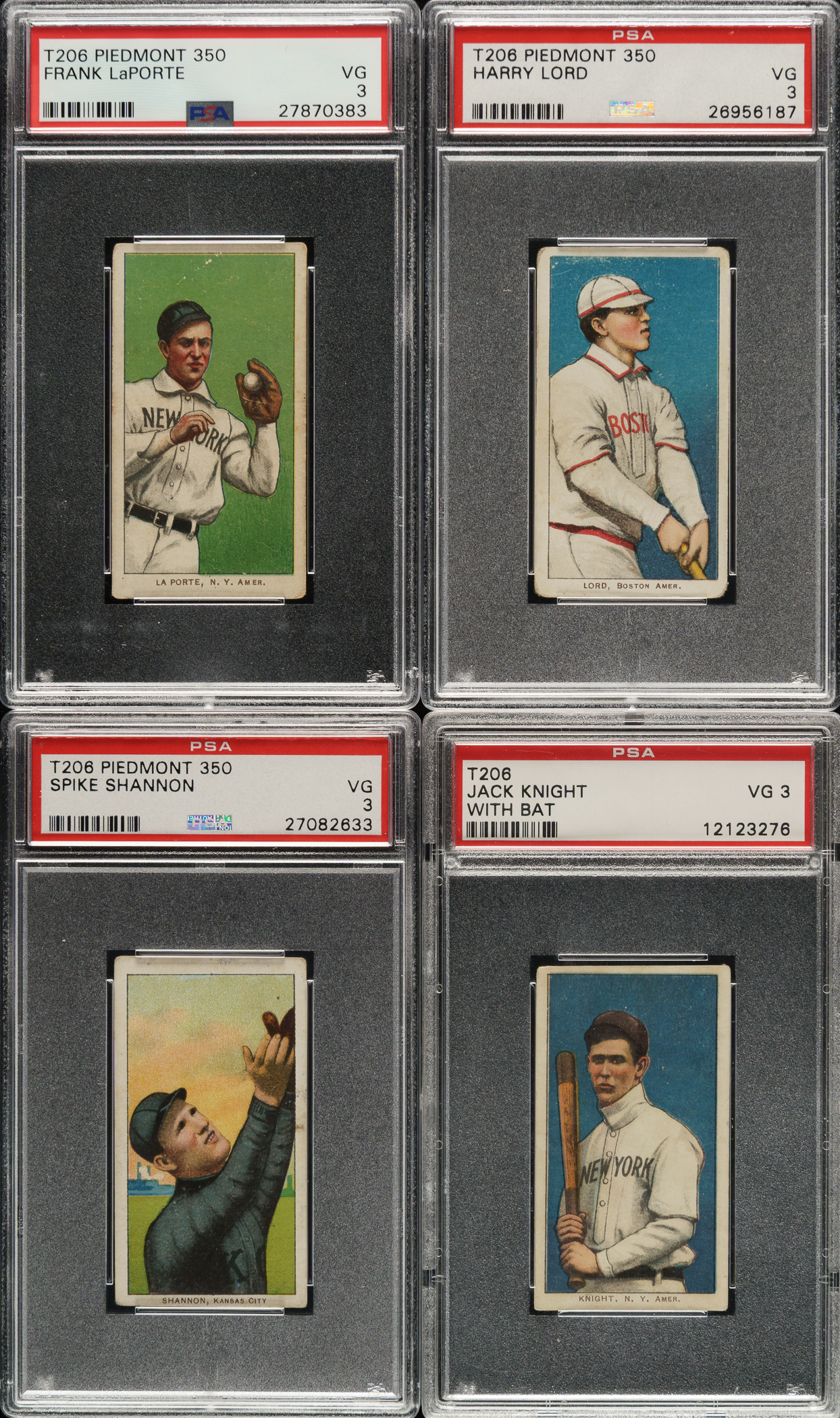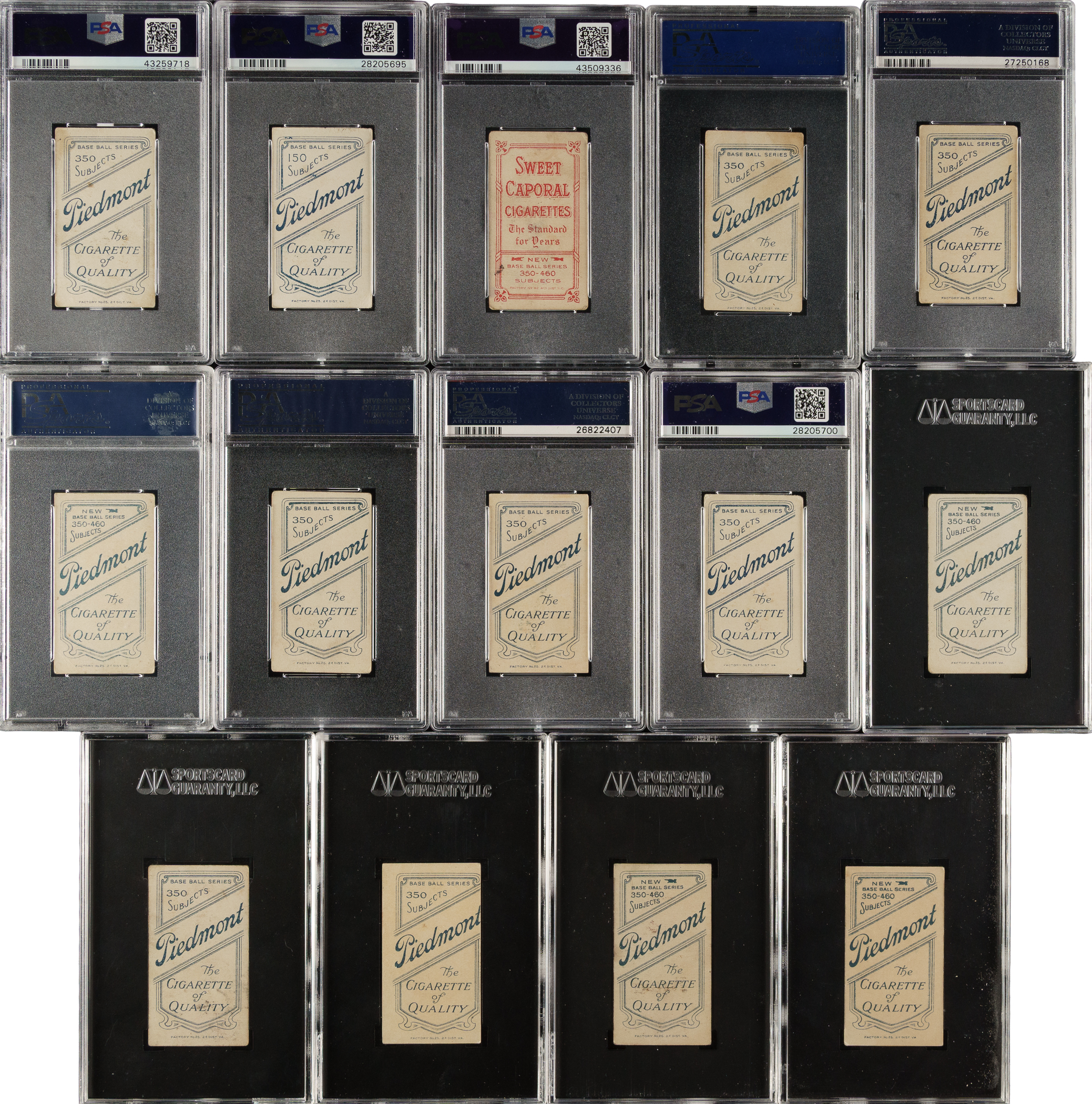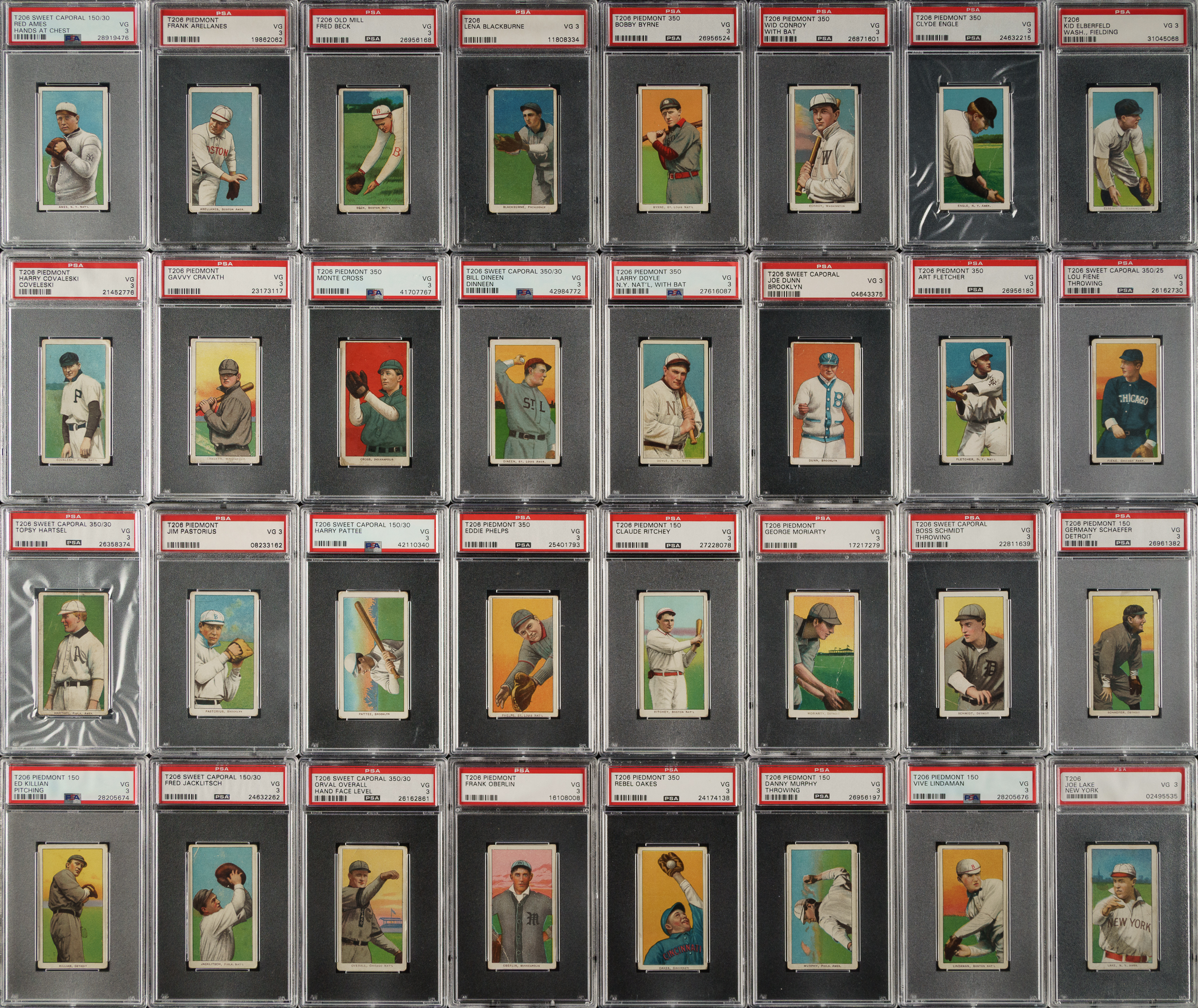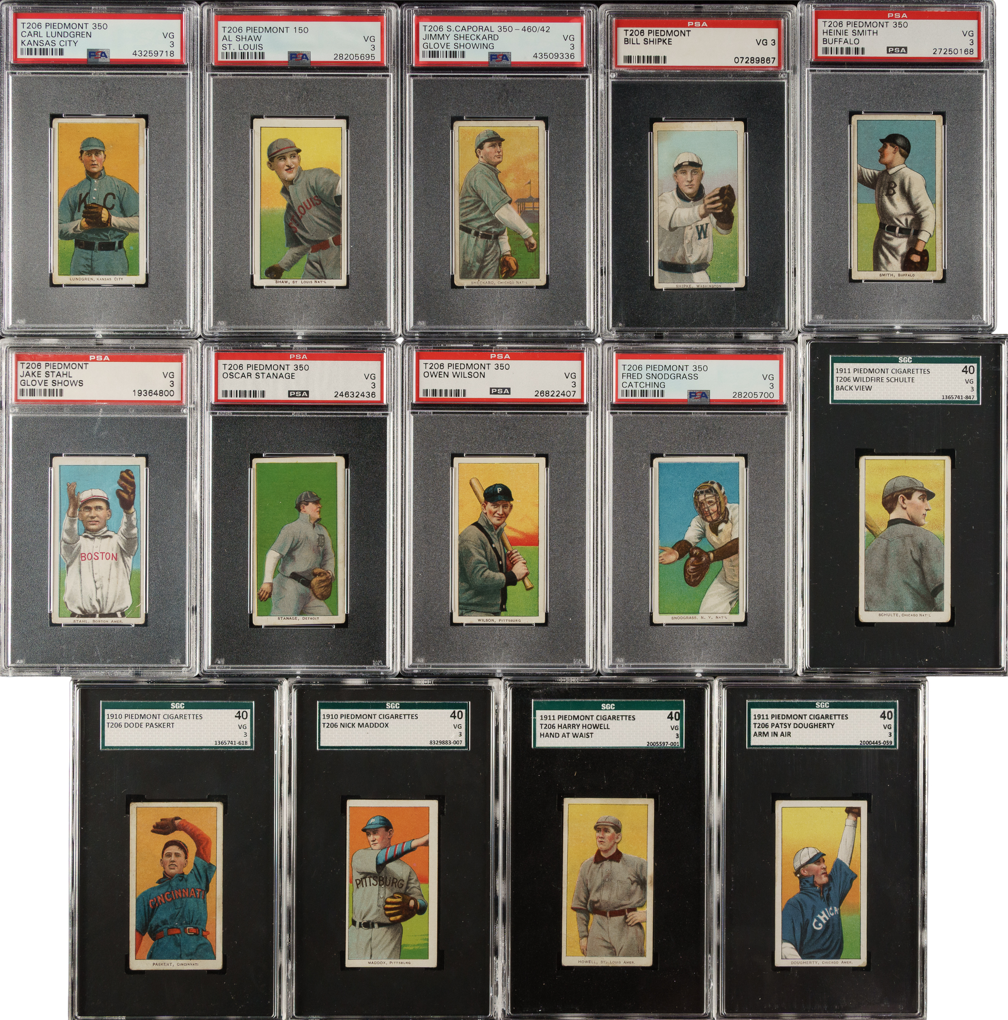 Tremendous collection of 50 different 1909-1911 T206 White Border cards, each professionally graded and encapsulated VG 3 by PSA (except five SGC). This collection consists of the following: Ames/hands at chest, Arellanes, Beck (Old Mill Back), Blackburne, Byrne, Conroy/with bat, Coveleski, Cravath, Cross, Dineen, Dougherty/arms in air (SGC), Doyle/with bat, Joe Dunn, Elberfeld/fielding, Engle, Fiene/throwing, Fletcher, Hartsel, Howell/hands at waist (SGC), Jacklitsch, Killian/pitching, Knight/with bat, Lake/New York, LaPorte, Lindaman, Lord, Lundgren/Kansas City, Maddox (SGC), Moriarty, Murphy/throwing, Oakes, Oberlin, Overall/hand at face level, Paskert (SGC), Pastorius, Pattee, Phelps, Ritchey, Schaefer/Detroit, Schmidt/throwing, Schulte/back view (SGC), Shannon, A. Shaw, Sheckard/glove showing, Shipke, H. Smith, Snodgrass/catching, Stahl/glove shows, Stanage, and Wilson. Total: 50 cards. The size/weight of this item requires that there will be an additional shipping charge for this lot.