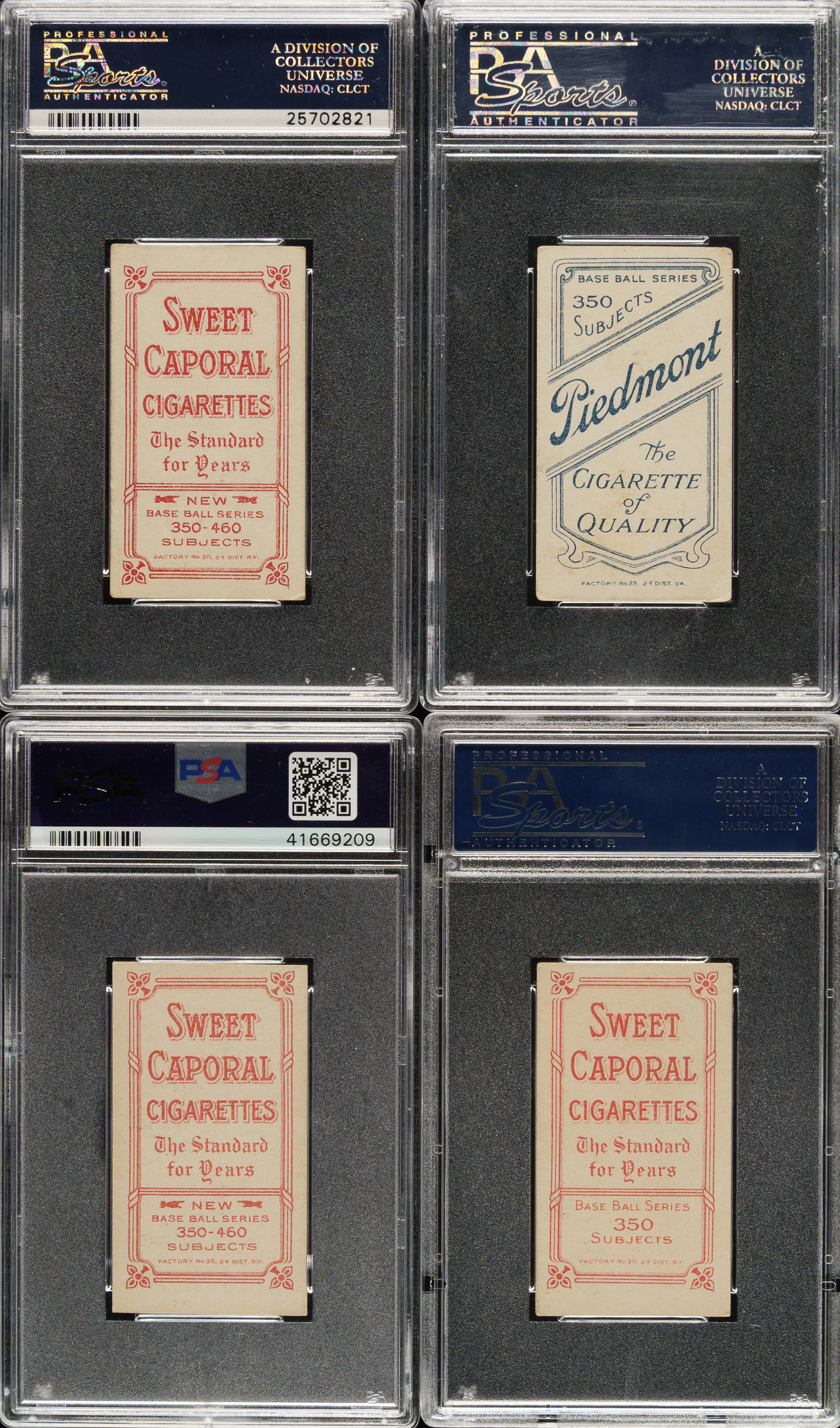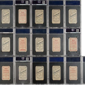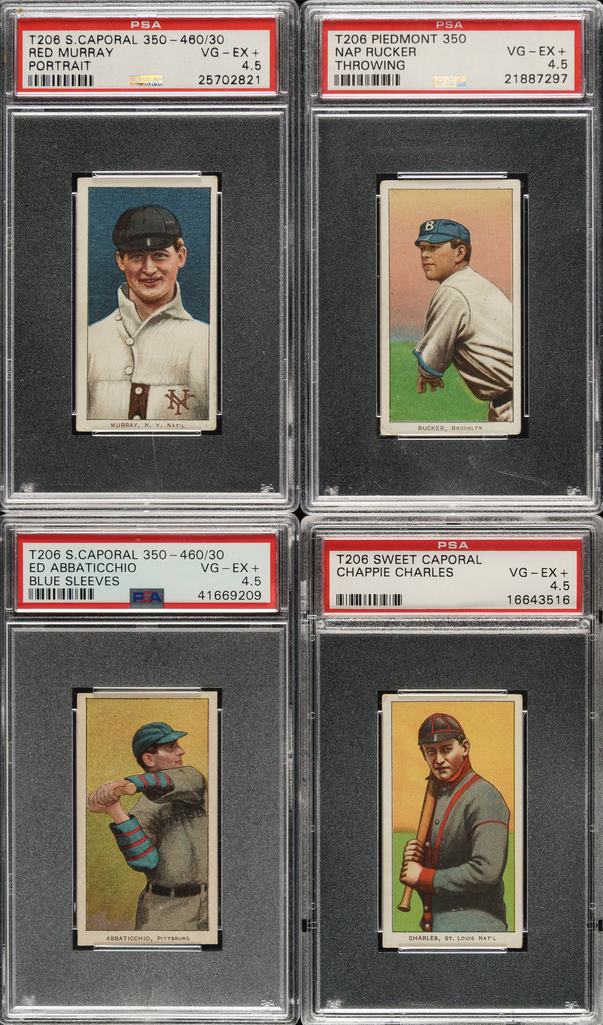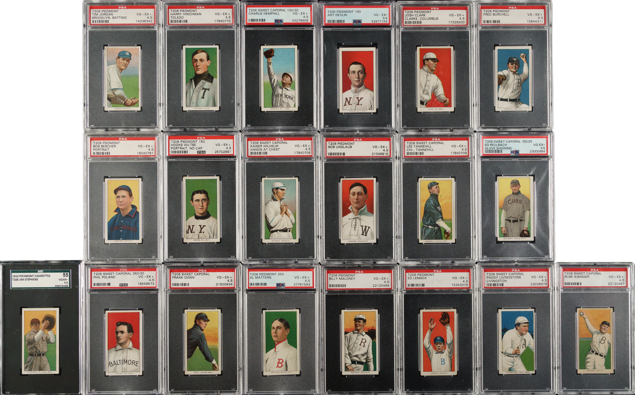 Collection of twenty-four 1909-1911 T206 White Border cards, each professionally graded and encapsulated VG-EX+ 4.5 by PSA (except one SGC). This collection consists of the following: Abbaticchio/blue sleeves, Bescher/portrait, Burchell, Charles, J. Clark, Devlin, Hemphill, H. Hinchman, T. Jordan/batting, Kisinger, Lennox, Livingstone, Maloney, Mattern, Murray/portrait, Owen, Poland, Reulbach/glove showing, Rucker/throwing, Stephens (SGC 55), Tannehill/Tannehill on front, Unglaub, Wilhelm/hands at chest, and Wiltse/portrait-no cap. Total: 24 cards. The size/weight of this item requires that there will be an additional shipping charge for this lot.