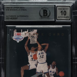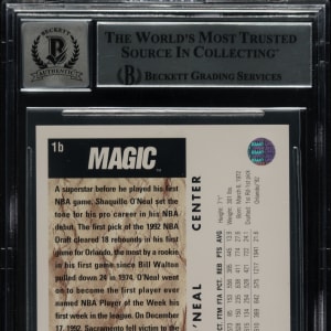 Beckett has encapsulated the card, grading the signature GEM MINT 10. Orlando Magic Hall of Famer Shaquille O'Neal.