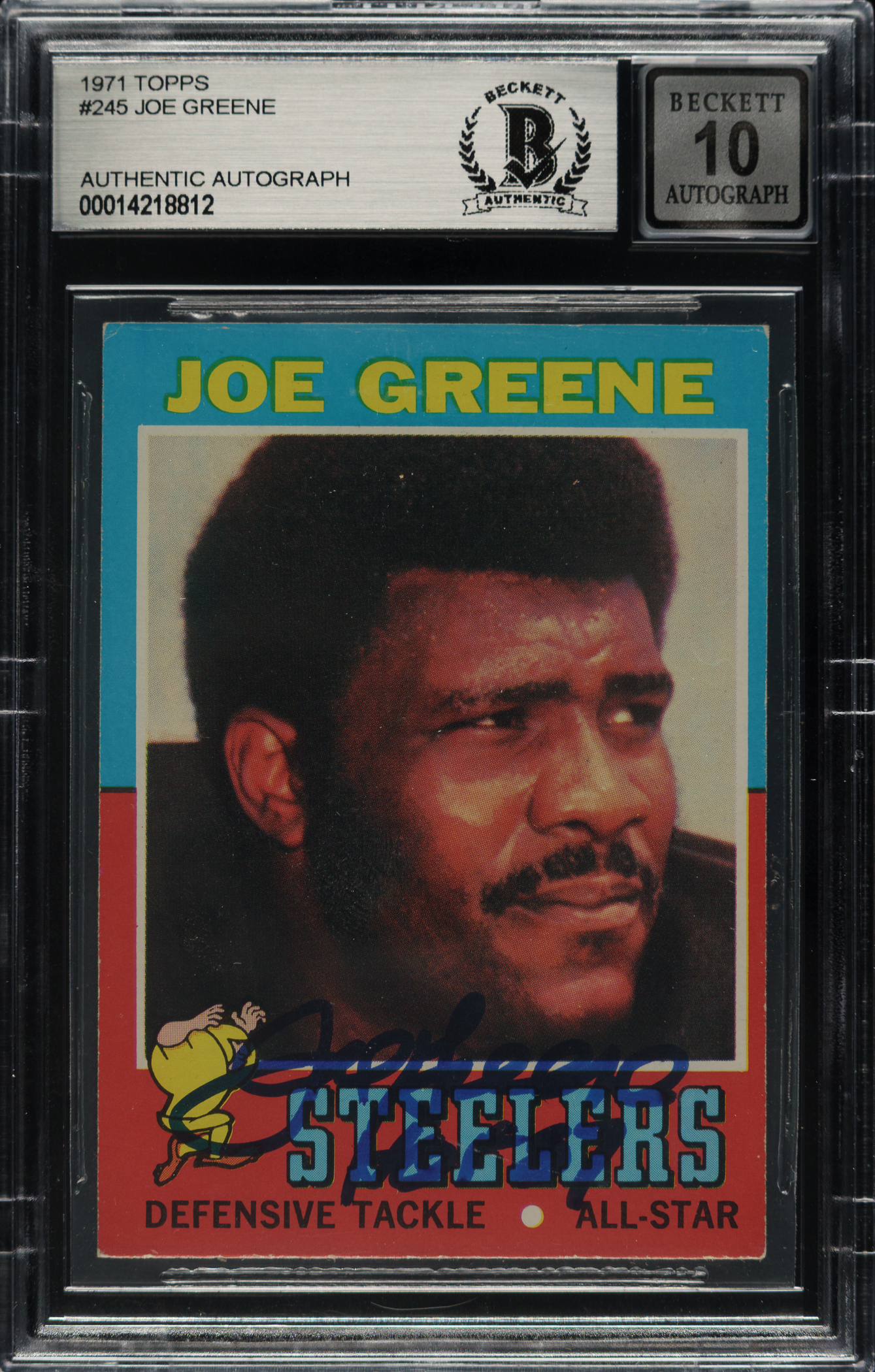 Beckett has encapsulated the card, grading the signature GEM MINT 10. Pittsburgh Steelers Hall of Famer Joe Greene.