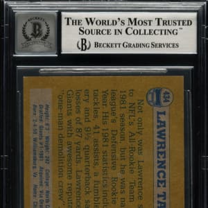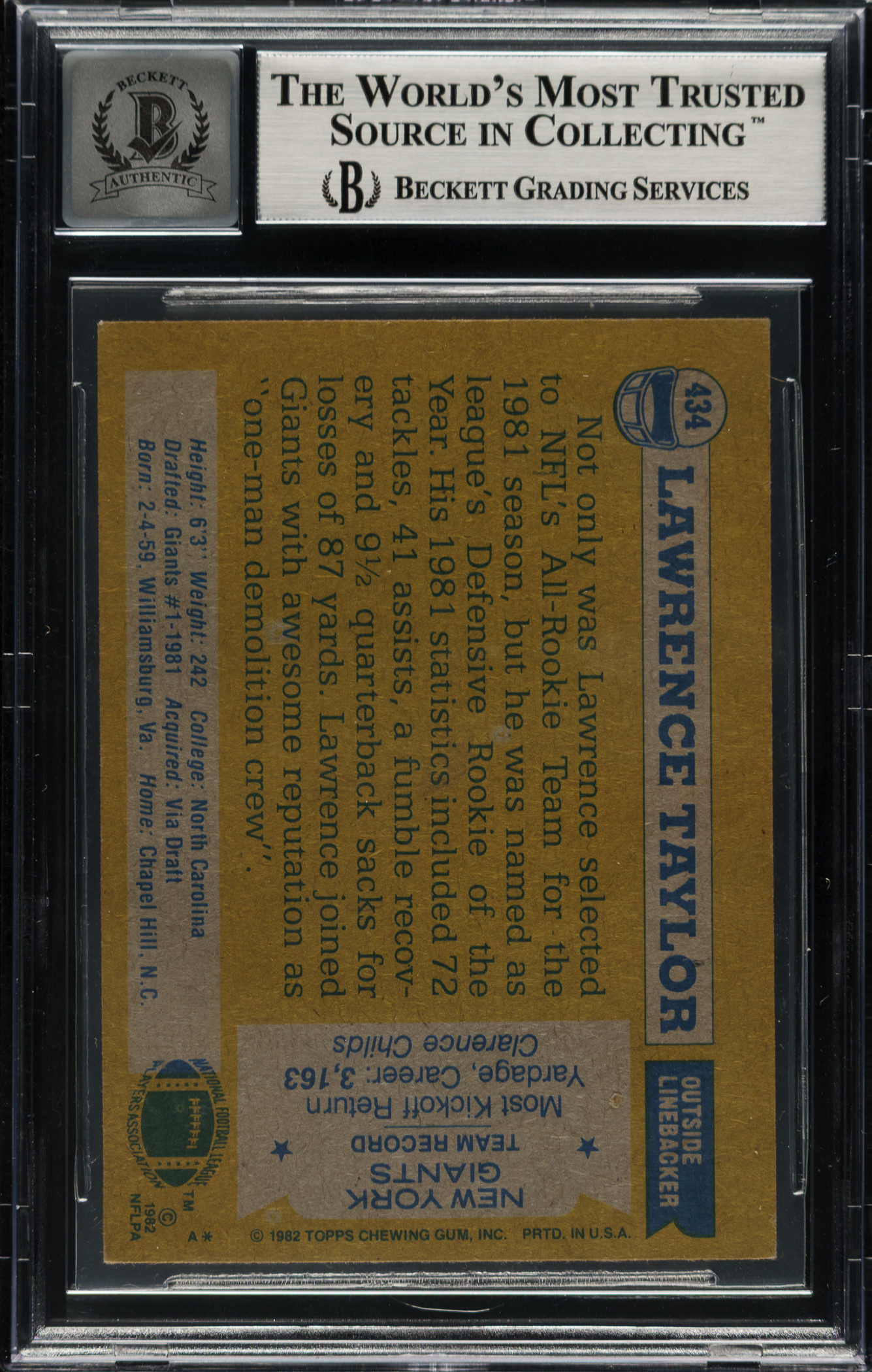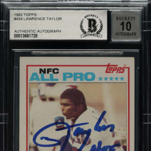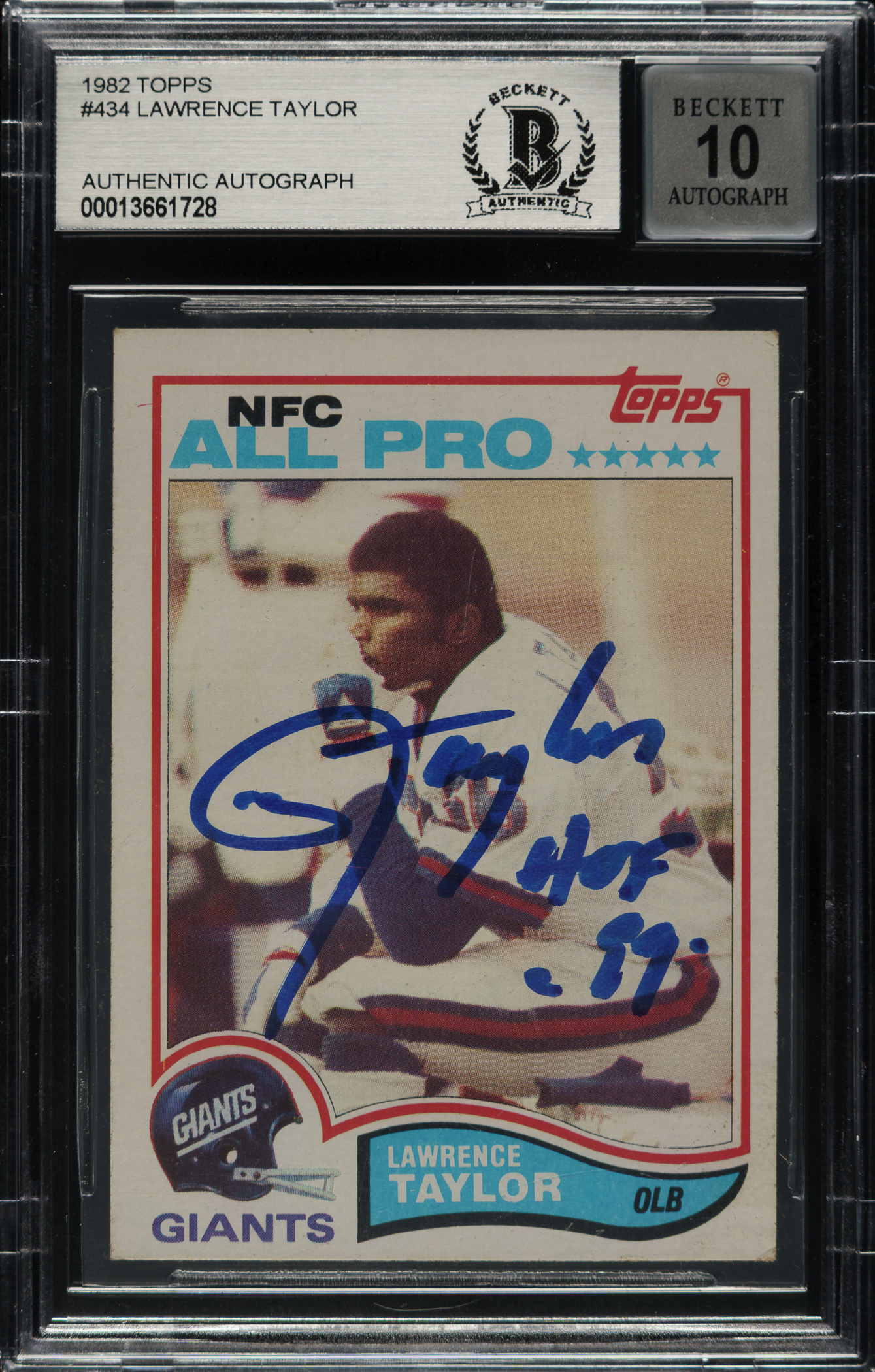 Beckett has encapsulated the card, grading the signature GEM MINT 10. New York Giants Hall of Famer Lawrence Taylor.