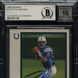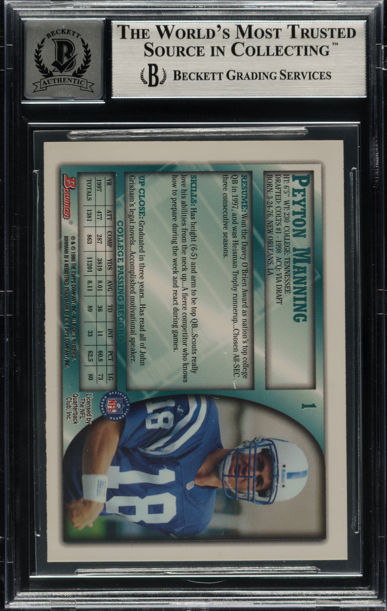 Beckett has encapsulated the card, grading the signature GEM MINT 10. Indianapolis Colts Hall of Famer Peyton Manning