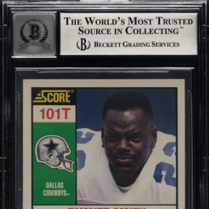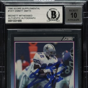 Beckett has encapsulated the card, grading the signature GEM MINT 10. Dallas Cowboys Hall of Famer Emmitt Smith.