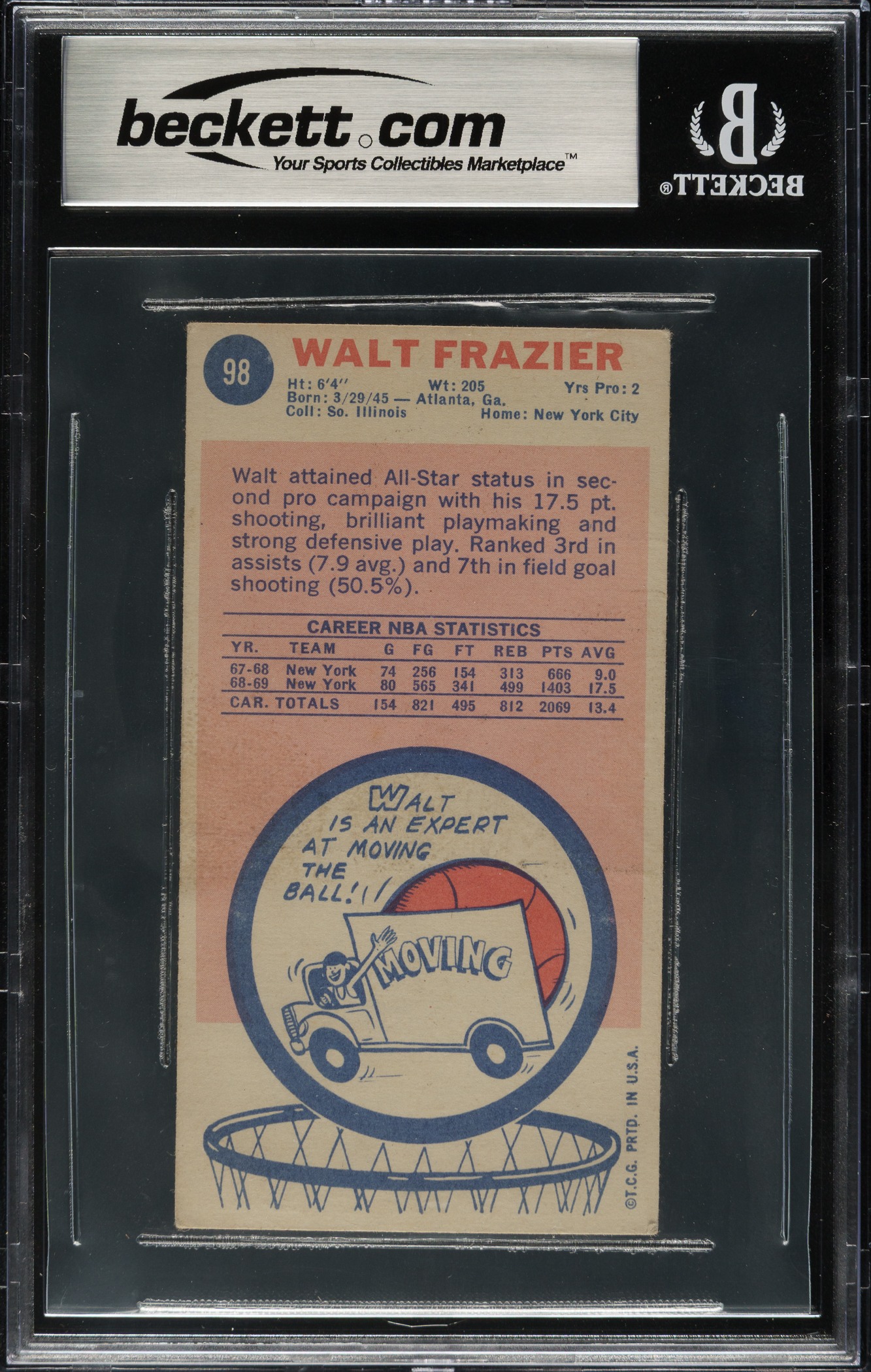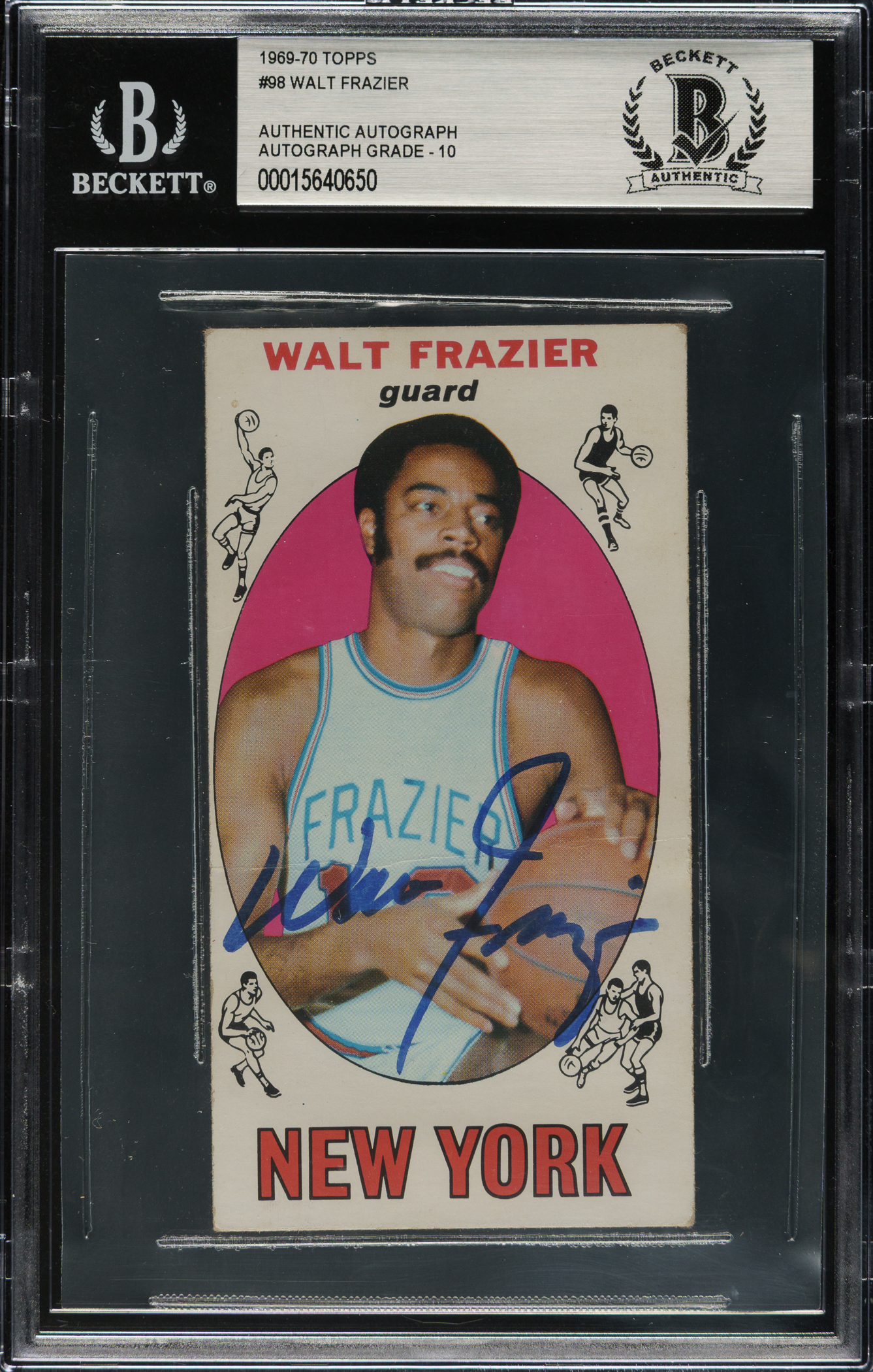 Beckett has encapsulated the card, grading the signature GEM MINT 10. New York Knicks Hall of Famer Walt Frazier.