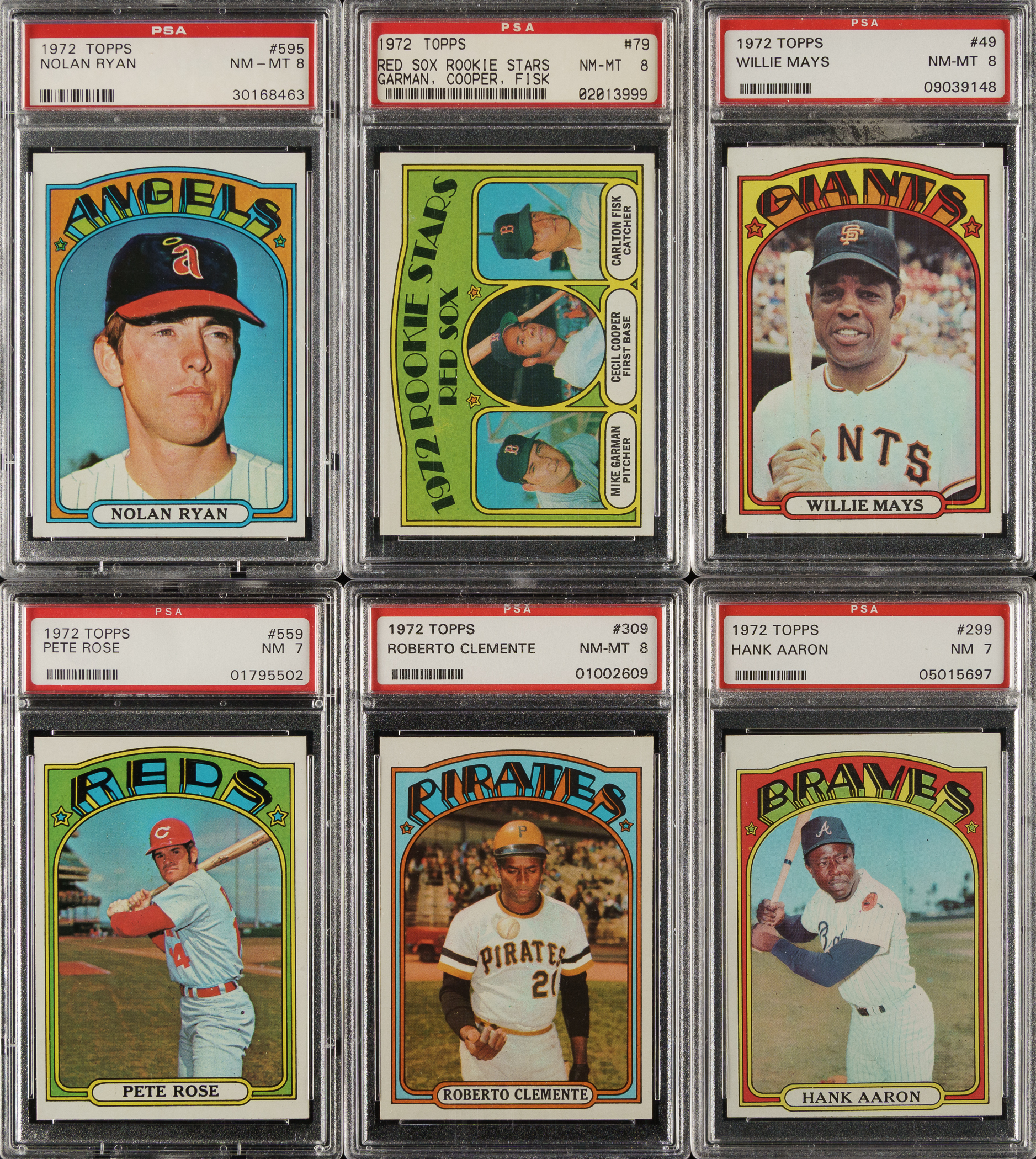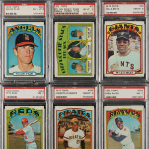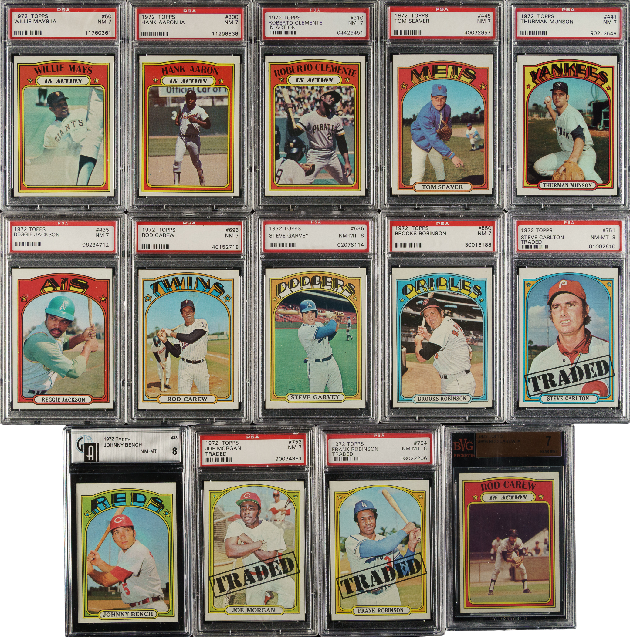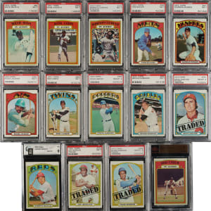 Presented is a high-grade complete set of 1972 Topps consisting of 787 different cards plus all seven variations (#18, 29, 45, 117, 251, 478, and 604) required for a complete master set. The 1972 Topps series is one of the most popular Topps sets of the decade. This is a beautiful set with many high grade cards. A total of 156 cards have been professionally graded and encapsulated by PSA (86), SGC (48), BVG (2), and GAI (20). Grading Composite (PSA unless noted): MINT 9 (2 cards): #89 (OC) and 621 (OC). NM-MT+ 8.5 (17 cards): #267 (SGC 92), 276 (SGC 92), 279 (SGC 92), 287 (SGC 92), 326 (SGC 92), 353 (SGC 92), 369 (SGC 92), 390 (SGC 92), 529 (SGC 92), 542 (SGC 92), 606 (SGC 92), 608 (SGC 92), 613 (SGC 92), 616 (SGC 92), 653 (SGC 92), 660 (SGC 92), and 664 (SGC 92). NM-MT 8 (54 cards): #49 Mays, 75 (SGC 88), 79 Fisk RC, 96 (OC), 130 Gibson, 131, 141 (SGC 88), 169, 198 (SGC 88), 205, 214, 242, 251a/small print on front, 265 (SGC 88), 277 (SGC 88), 280 McCovey, 286 (SGC 88), 289 (SGC 88), 302 (SGC 88), 309 Clemente, 319 (SGC 88), 340 (SGC 88), 350 (SGC 88), 355 (SGC 88), 356 (SGC 88), 359 (SGC 88), 368 (SGC 88), 373 (SGC 88), 386 (SGC 88), 394 (SGC 88), 400 Oliva, 420 Carlton, 433 Bench (GAI), 447 Stargell, 478a/small print on front, 535 (SGC 88), 543 (SGC 88), 544 (SGC 88), 567 Marichal, 581 (SGC 88), 595 Ryan, 603 (SGC 88), 604a/copyright on right (SGC 88), 604b/copyright on left, 625 (SGC 88), 626, 628 (SGC 88), 686 Garvey, 688 (SGC 88), 751 Carlton Traded, 754 F. Robinson Traded, 756, 761 (BVG), and 771 (SGC 88). NM+ 7.5 (20 cards): #112 (SGC 86), 528 (SGC 86), 658 (GAI), 663 (GAI), 666 (GAI), 667 (GAI), 680 (GAI), 704 (GAI), 708 (GAI), 715 (GAI), 716 (GAI), 727 (GAI), 734 (GAI), 738 (GAI), 743 (GAI), 745 (GAI), 755 (SGC 86), 758 (GAI), 772 (GAI), and 779 (GAI). NM 7 (63 cards): #1 World Champs, 18a/green under 'c' and 's', 34 Martin IA, 38 Yastrzemski IA, 45b/yellow under 'c' and 's', 50 Mays IA, 52 Killebrew IA, 86, 91, 100 F. Robinson, 117b/yellow under 'c' and 's', 177, 196, 199, 202, 207, 215, 222, 240 Allen, 255, 270 Palmer, 285 Perry (GAI), 298, 299 Aaron, 300 Aaron IA, 310 Clemente IA, 374, 375, 417, 421, 423, 434 Bench IA, 435 Jackson, 436 Jackson IA, 439 B. Williams, 441 Munson, 445 Seaver, 446 Seaver IA, 465 Hodges, 474 (GAI), 498, 550 B. Robinson, 553, 559 Rose, 582, 600 Kaline, 620 Niekro, 624, 641, 657, 668, 669, 674, 695 Carew, 696 Carew IA (BVG), 749 Alston, 752 Morgan Traded, 753 McLain, 757, 764 Baker, 776, 777 Wilhelm, and 778. The condition of the 638-card unencapsulated balance is 47% Nr/Mt to Nr/Mt-Mt (including a few Mint), 46% Ex to Ex-Mt, and 7% Vg to Vg-Ex (including a couple with a slight miscut). This is a beautifully preserved high-grade master set of one of the great classic Topps series of the era! The equivalent SMR value for just 133 of the 156 graded cards (not including the three PSA-qualified cards or the twenty GAI-graded cards and factoring in the twenty half grades at the lower whole-grade level) is $4,605. Total: 794 cards. The size/weight of this item requires that there will be an additional shipping charge for this lot.