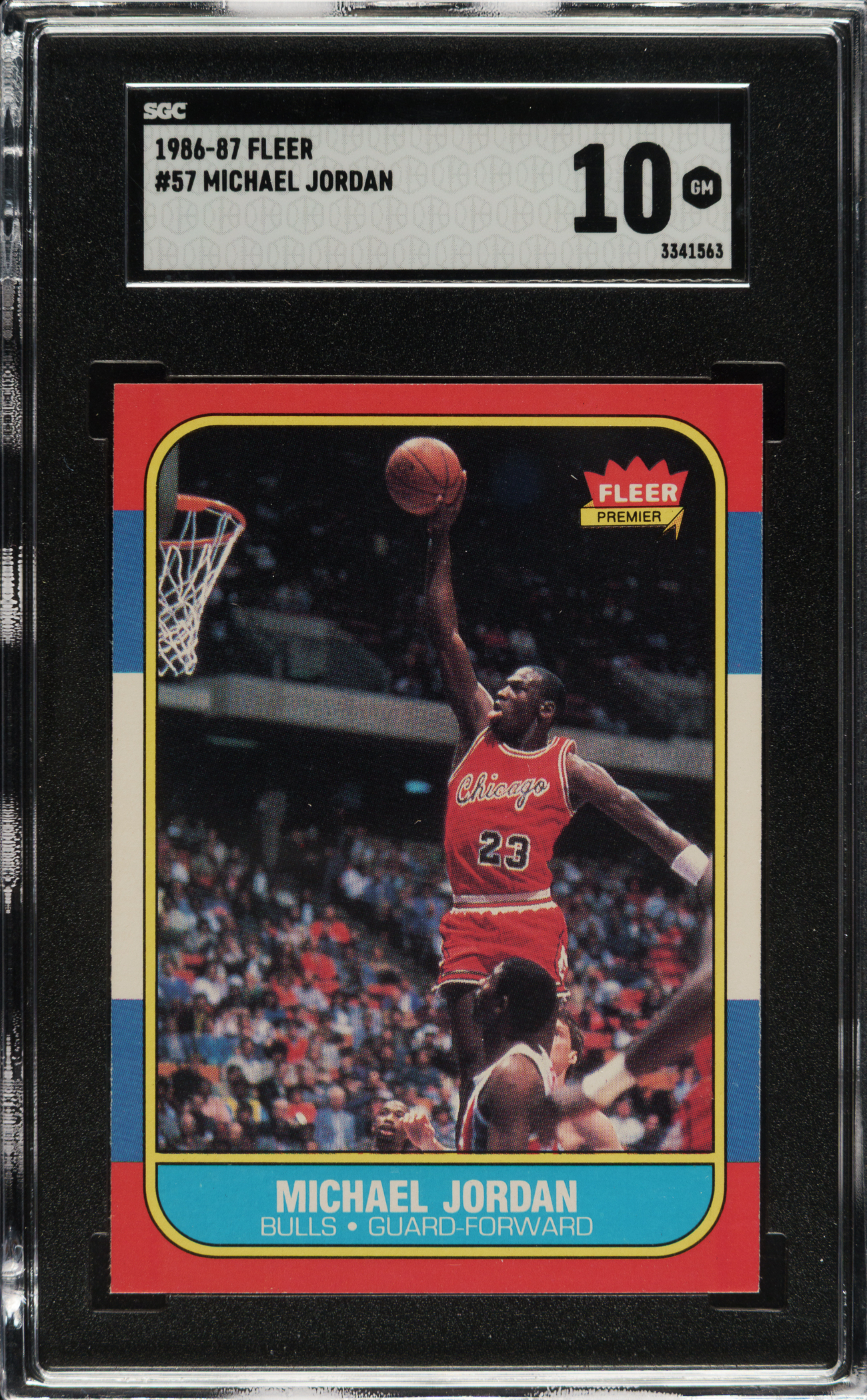 Graded GEM MINT 10 by SGC. Tremendous ultra-high-grade rookie card of Michael Jordan, arguably the greatest basketball player ever. This is a stunning example of the premier modern-day basketball card. The 1986-1987 Fleer basketball issue is extremely condition-sensitive due to its blue-and-red flush-to-the-border design. The offered card boasts a flawless image, sharp corners, outstanding centering, and no chipping to the extreme edges of the condition-sensitive red and blue borders. The Fleer Jordan card is one of the cards that is recognizable to collectors of all ages and is one of the great collectibles in our hobby. A spectacular example of this most sought-after modern basketball-card classic in superb GEM MINT condition.