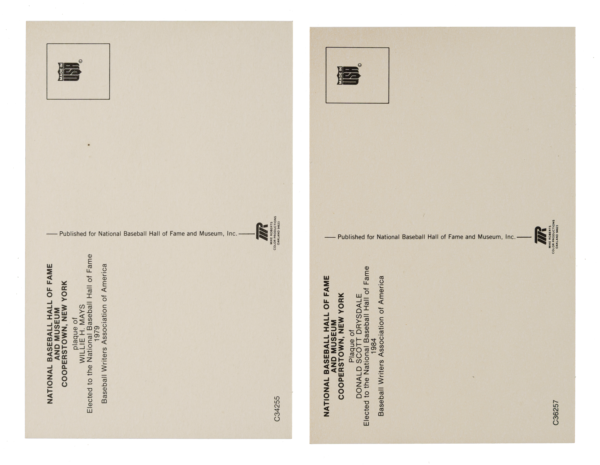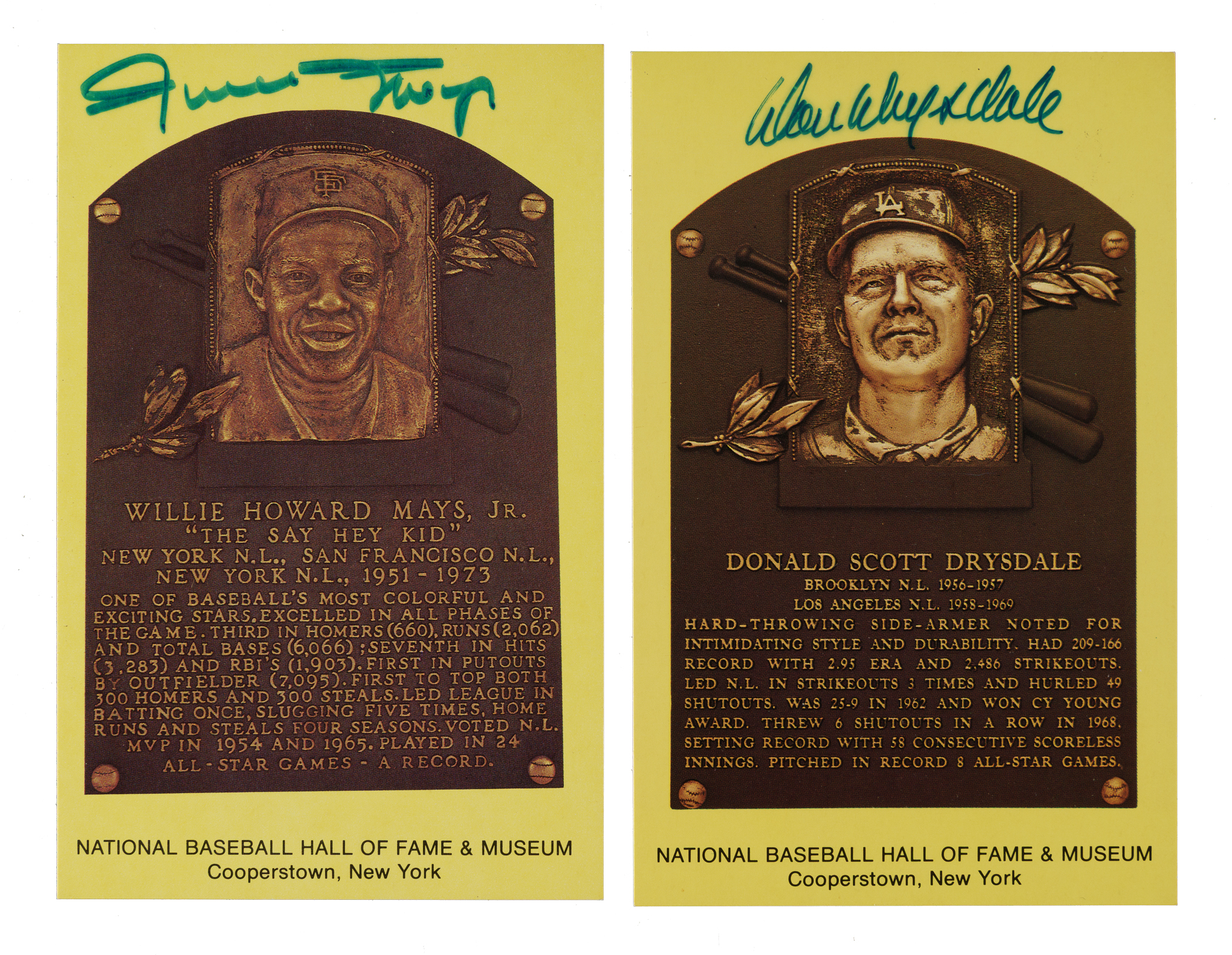 San Francisco Giants and Brooklyn Dodgers Hall of Famers Willie Mays and Don Drysdale signed Yellow Hall of Fame postcard pair. Auction LOA from James Spence/JSA.