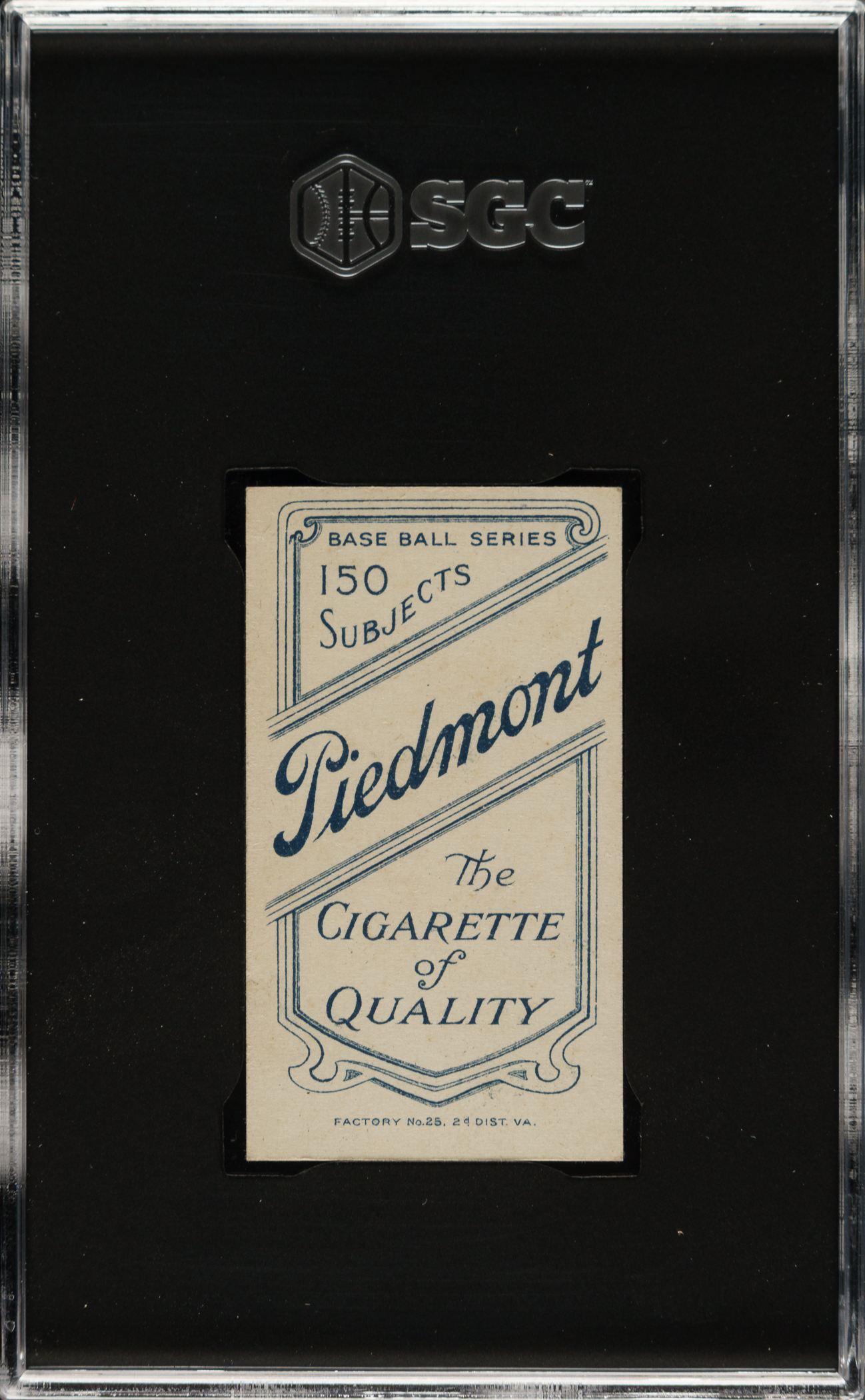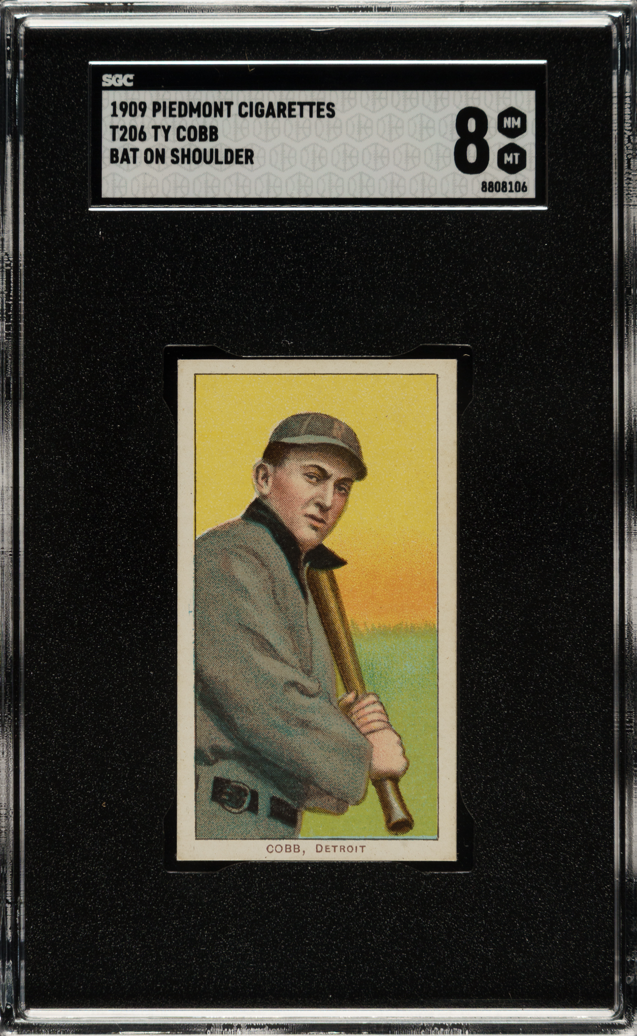 Graded NM/MT 8 by SGC. This is the ONLY example of this front/back combination graded at this level by SGC with none higher! Stunning ultra-high-grade example of this classic tobacco card of Detroit Tigers Hall of Famer Ty Cobb from the T206 White Borders series. The T206 Cobb bat-on-shoulder pose is one of the key cards in the set and the second most valuable of the four Cobb cards in the T206 series. This card boasts vibrant colors, outstanding registration, and four strong corners. Boldly printed Piedmont 150/25 advertising reverse. Any high-grade T206 card is an important condition rarity, but a NM/MT example of one of the key cards from the premier tobacco issue of the 1910 era is especially noteworthy and desirable. This T206 Cobb bat-on-shoulder pose would make a significant addition or upgrade to virtually any world-class T206, vintage Hall of Famer, or Ty Cobb card collection.