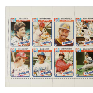 Extremely rare complete set of twenty-two 1980 Topps Pepsi-Cola All-Stars on an uncut sheet. When discussing rare prototype and proof cards that elude even the most advanced collectors, the 1980 Pepsi-Cola All-Stars are almost always near the top of the list. Samples are scarce, let alone offerings representing anything close to a complete set. In fact, this is the first time we have ever offered a complete set in uncut form! This set is loaded with Hall of Famers and stars, including Reggie Jackson, Mike Schmidt, Steve Carlton, and Rod Carew. The offered sheet (28 x 9 inches), which is fully printed on the back, is in exceptional condition. There is minimal wear to the edges and corners, along with a pair of production-related handwritten notations along the bottom border. This is a tremendous opportunity to acquire this sought-after prototype set in ideal uncut form.
