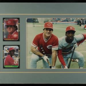 St. Louis Cardinals and Cincinnati Reds Willie McGee and Pete Rose signed photograph in framed display. Total dimensions: 12-3/4 x 18-1/4 Inches. Auction LOA from James Spence/JSA. The size/weight of this item requires that there will be an additional shipping charge for this lot.