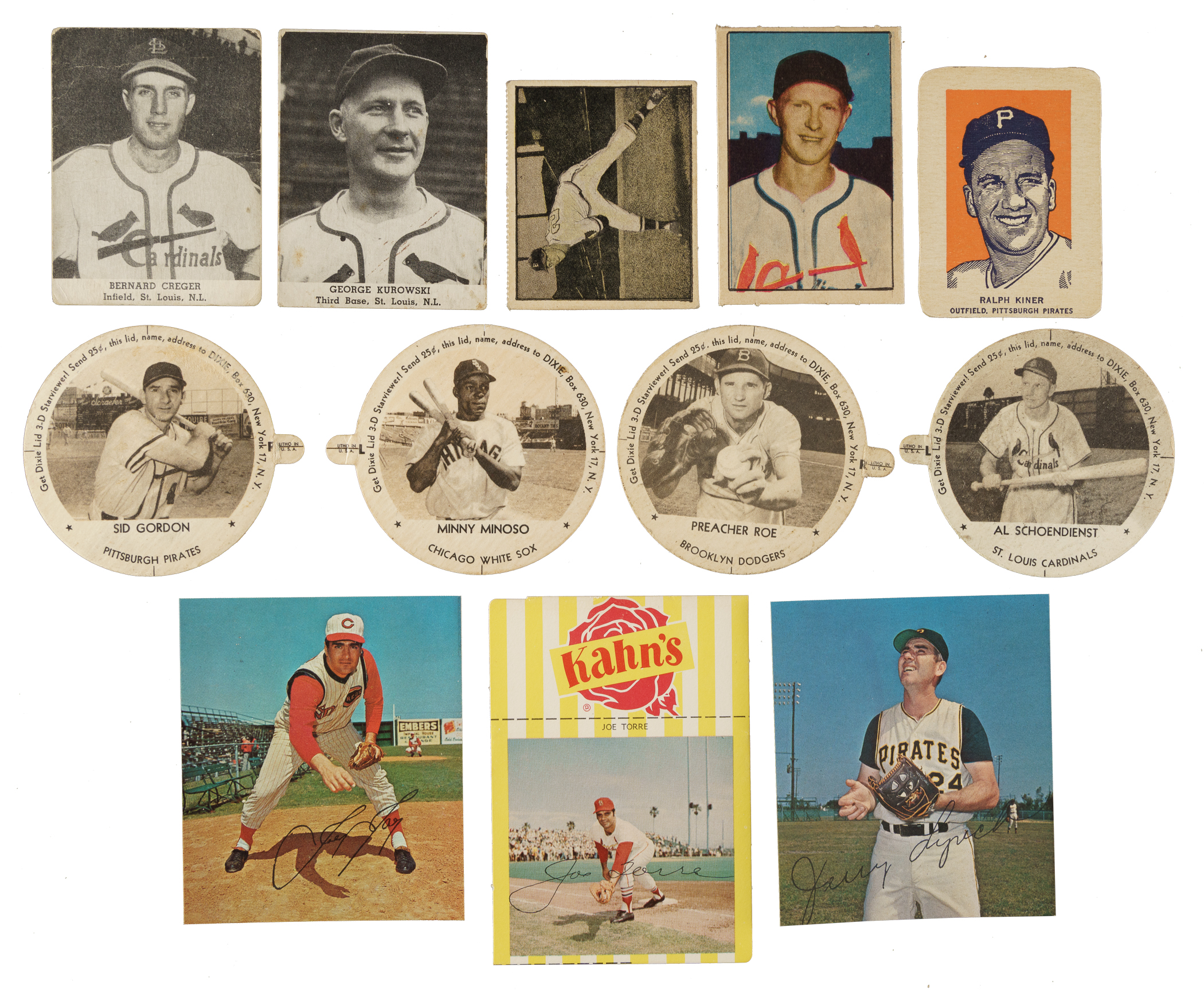 Collection of sixteen 1947 to 1969 oddball baseball cards highlighted by Robin Roberts, Warren Sphan, and Ralph Kiner. This collection consists of the following: 1) 1947 D323 Tip-Top Bread (4 cards): Creger (Pr), Kurowski (Fr), Marion (Fr-Gd), and Mize (Pr, HOF). 2) 1951 Berk Ross (2 cards): #2-2 Spahn (Vg-Ex, HOF) and 4-8 Roberts (Vg, HOF). 3) 1952 Berk Ross (1 card): Schoendienst (Vg-Ex, HOF). 4) 1952 Wheaties (1 card): Kiner/portrait (hand cut, otherwise Fr, HOF). 5) 1954 Johnston Cookies (1 card): #21 Spahn (Pr, HOF). 6) 1954 Dixie Lids (4 lids): Gordon (rubber stamp on reverse, otherwise Gd), Minoso (rubber stamp on reverse, otherwise Vg, HOF), Roe (rubber stamp on reverse, otherwise Vg), and Schoendienst (rubber stamp on reverse, otherwise Gd+, HOF). 7) 1965 Kahn's Wieners (2 cards): Jay (Nr/Mt) and Lynch (Nr/Mt). 8) 1969 Kahn's Wieners (1 card): Torre (hand cut, otherwise Nr/Mt, HOF). Total: 16 cards.