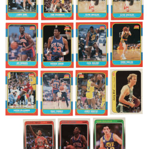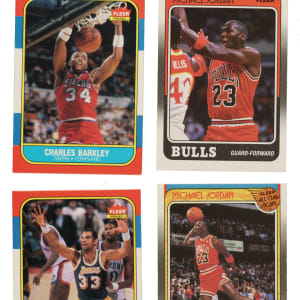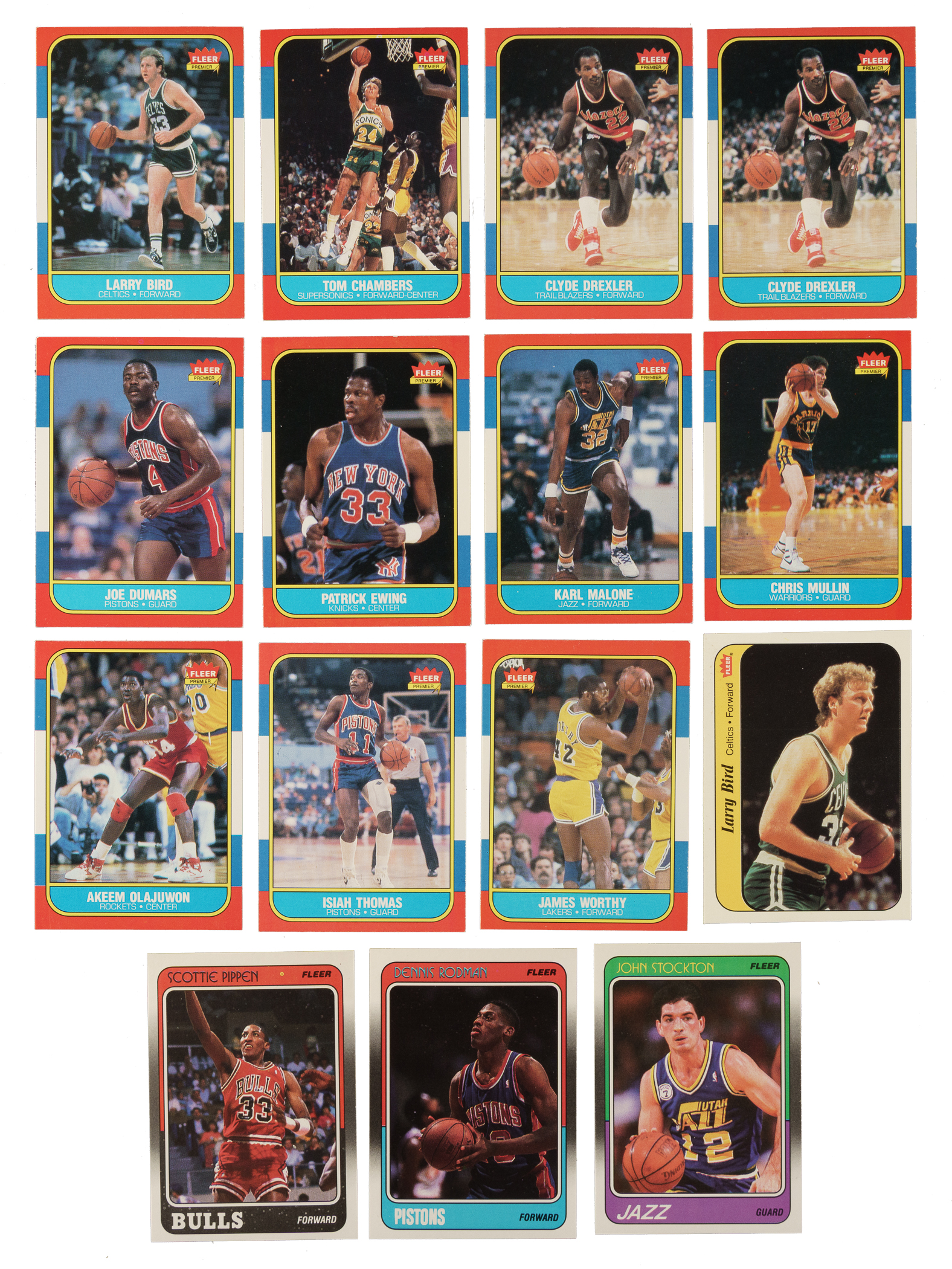 Collection of nineteen 1986-1987 and 1988-1989 Fleer Basketball Hall of Famers highlighted by Michael Jordan, Kareem Abdul-Jabbar, and Charles Barkley. This collection consists of the following: 1) 1986-1987 (14 cards): One card is from the sticker set. Includes: #1 Abdul-Jabbar (Ex+), 7 Barkley (Ex), 9 Bird (Nr/Mt), 15 (Ex-Mt), two 26 Drexler (Nr/Mt+ and Nr/Mt), 27 Dumars RC (Nr/Mt), 32 Ewing (Ex-Mt), 68 Malone RC (Ex due to light stain on reverse), 77 Mullin RC (Nr/Mt-Mt), 82 Olajuwon (Ex-Mt), 109 Thomas (Ex-Mt+), 131 Worthy (Ex+), and #2 Bird (Nr/Mt, sticker). 2) 1988-1989 (5 cards): #17 Jordan (15/85 T/B, otherwise Nr/Mt-Mt), 20 Pippen RC (Nr/Mt), 43 Rodman RC (Nr/Mt-Mt), 115 Stockton RC (Nr/Mt-Mt), and 120 Jordan AS (Nr/Mt). Total: 19 cards.