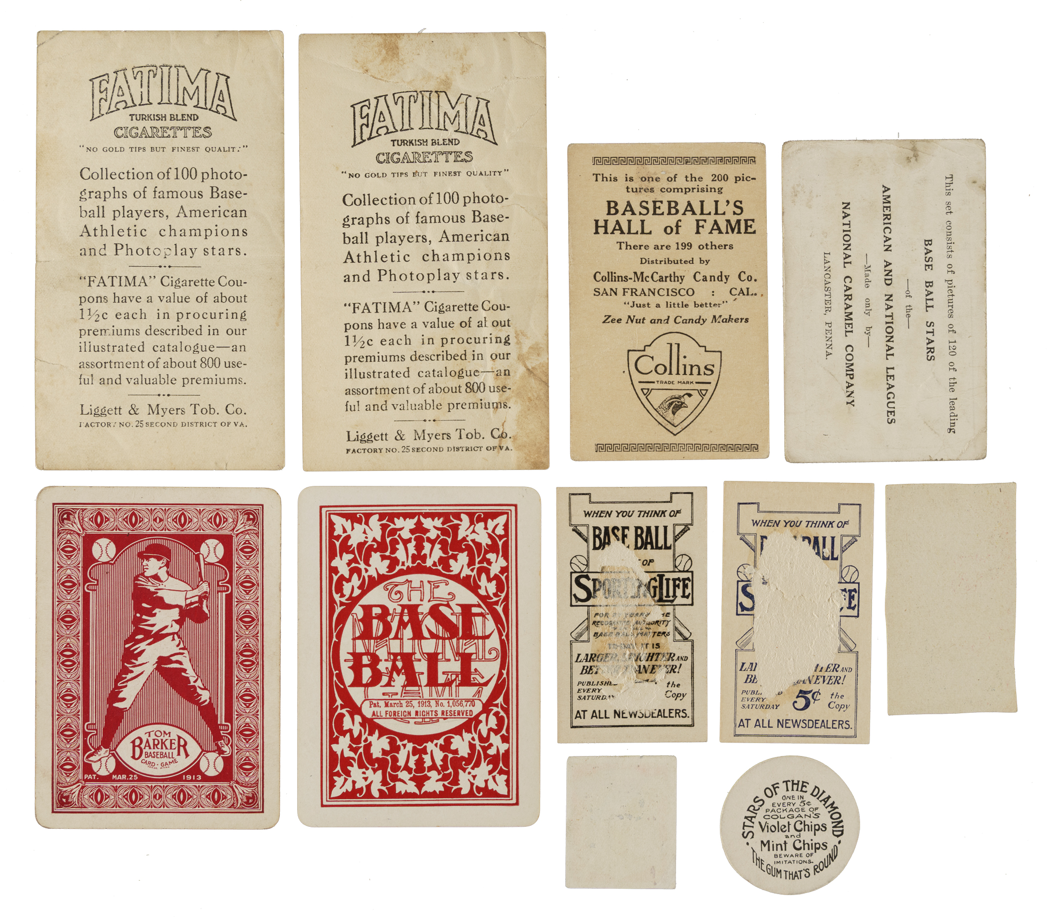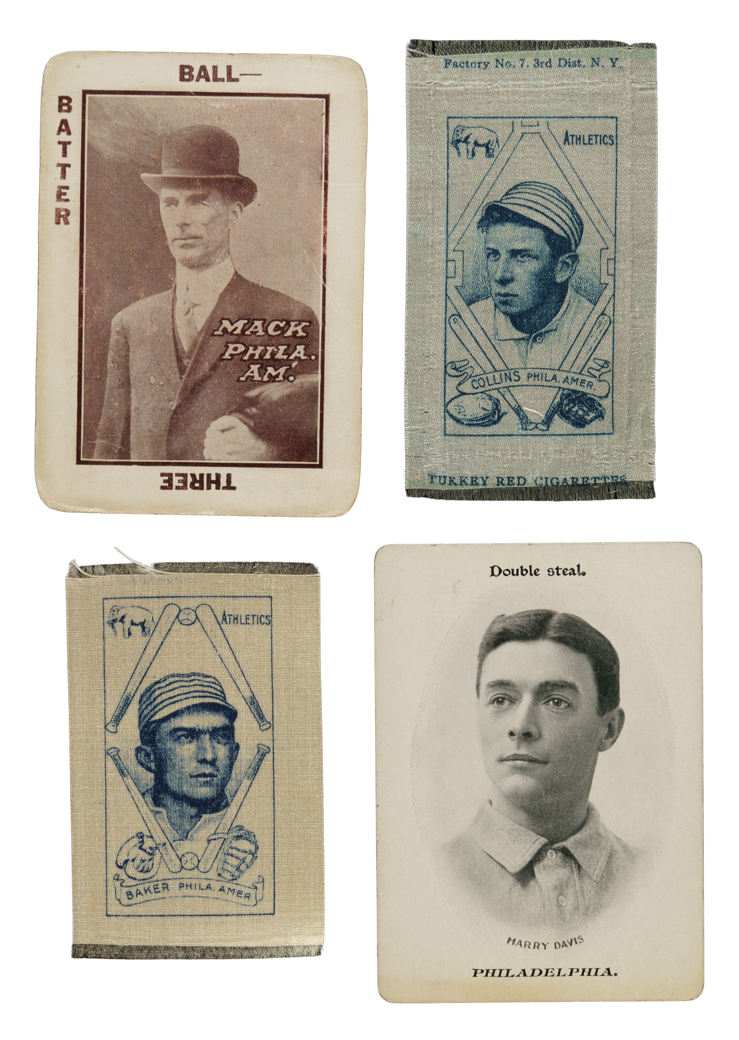 Collection of fifteen 1910-era type-cards highlighted by Connie Mack, Home Run Baker, and Eddie Collins. This collection consists of the following: 1) 1906 WG2 Fan Craze A.L. (1 card): Davis (Gd). 2) 1909-1911 E254 Colgan's Chips Stars of the Diamond (1 card): Jordon/Brooklyn (Vg-Ex due to tiny wrinkle on reverse). 3) 1910 W-UNC Strip Card (1 card): Coombs (hand cut, otherwise Pr due to pencil). 4) 1910 S74 Tobacco Silks (2 silks): Baker (Vg-Ex, white) and Collins (stitching holes, otherwise Vg, "Colored", blue). 5) 1910-1911 M116 Sporting Life (2 cards): Mullin (Pr due to back damage, black back) and Schmidt (Pr due to back damage, blue back). 6) 1911 T332 Helmar Stamps (1 stamp): Daubert (Vg). 7) 1913 WG6 Tom Barker Game (1 card): Crawford (Vg). 8) 1913 WG5 National Game (2 cards): Dahlen (Vg-Ex) and Mack (Fr). 9) 1914 T222 Fatima (2 cards): Oldring (Pr) and Orr (Pr). 10) 1917 E135 Collins-McCarthy (1 card): #151 Schang (Pr). 11) 1921-1923 E220 National Caramel (1 card): Mails (Pr). Total: 15 cards.