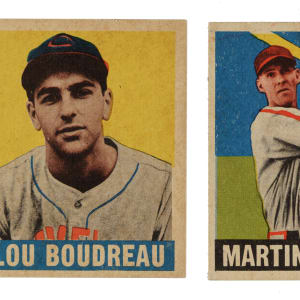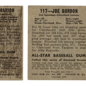 Presented is a trio of 1948-1949 Leaf baseball cards. This trio consists of the following: #97 Marion (Pr-Fr due to heavy gum stain on reverse), 106 Boudreau (pen on reverse, otherwise Ex), and 117 Gordon (Vg-Ex). Total: 3 cards.