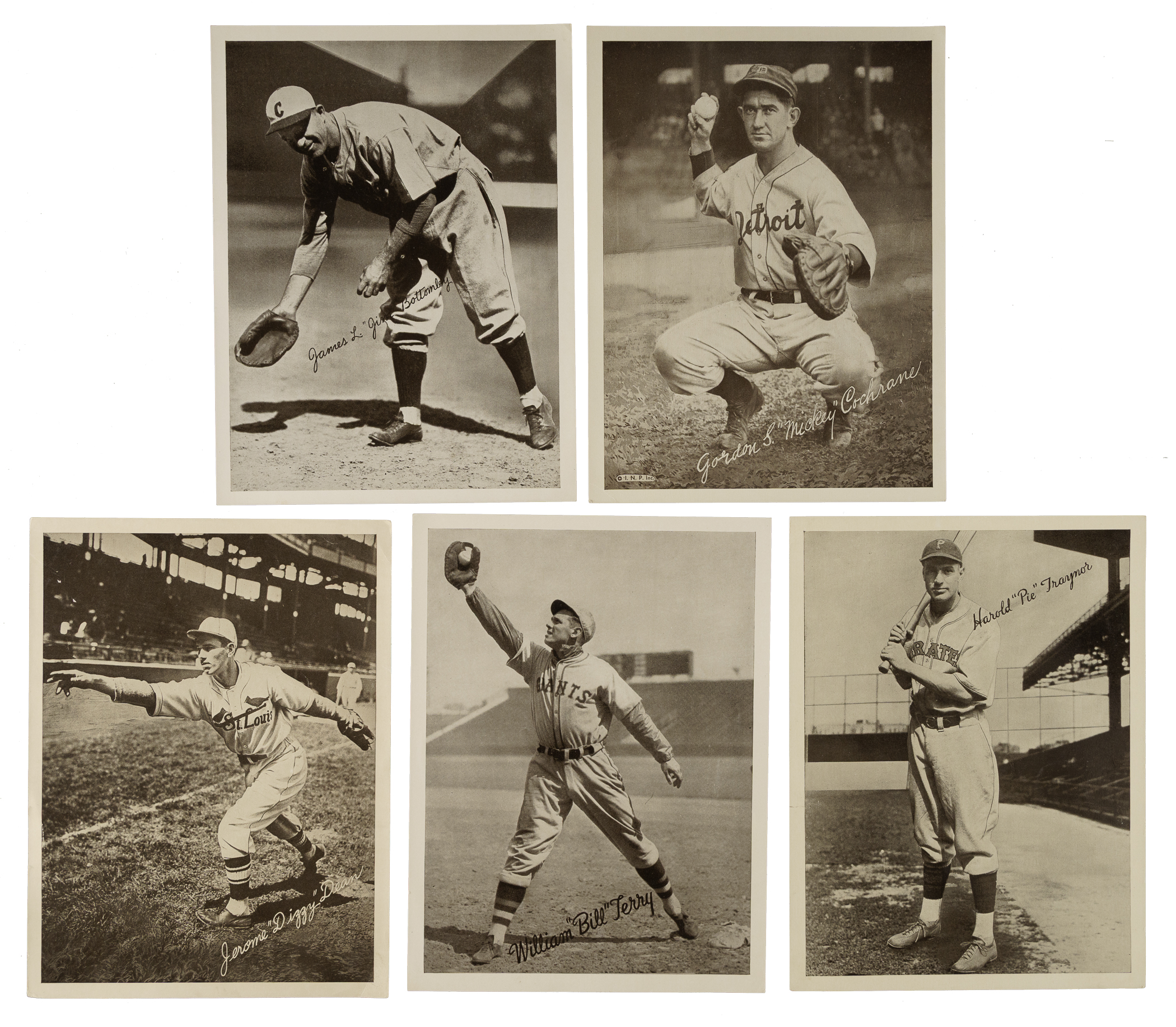 Collection of five 1936 R311 Glossy Finish Premiums Hall of Famers. This collection consists of the following: Bottomley (Vg-Ex), Cochrane (Vg), Dean (Fr-Gd due to tiny tears), Terry (Gd+), and Traynor (Gd+). Total: 5 cards.