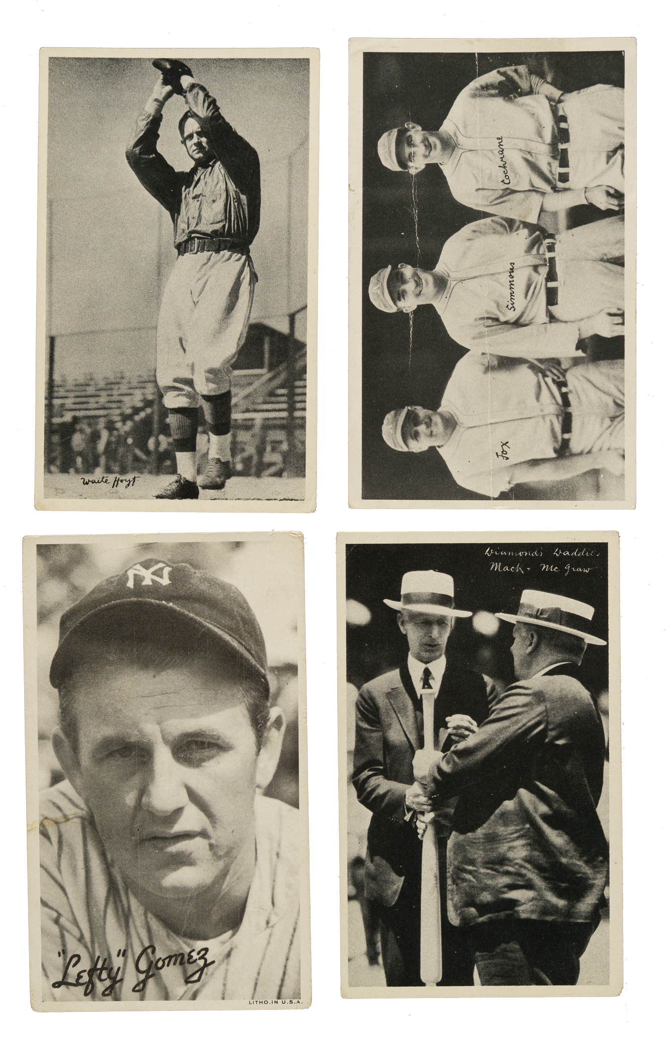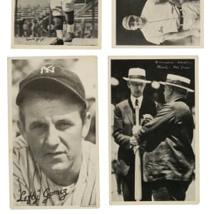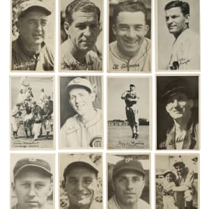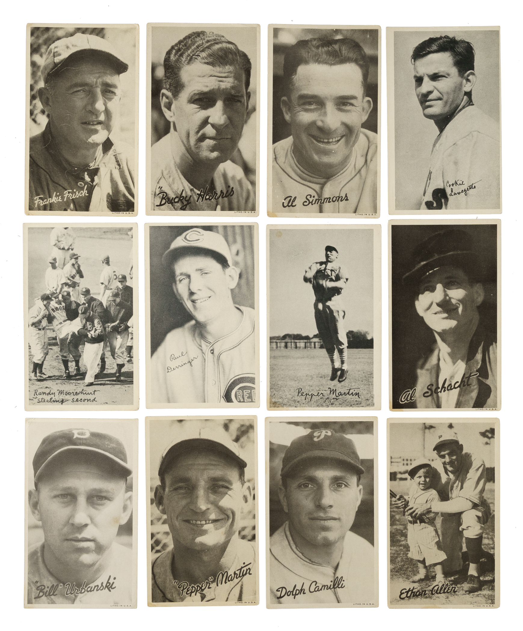 Presented is a collection of sixteen 1936 R313 National Chicle "Fine Pen" and R314 Goudey "Wide Pen" Premiums highlighted by Foxx, Frisch, Mack, and Harris. Condition ranges from Pr to Gd, including a couple slightly higher. This collection consists of the following: 1) R313 (7 cards): Derringer, Foxx/Simmons/Cochrane (Pr, HOF), Hoyt (Gd+, HOF), Lavagetto, Mack/McGraw (Gd, HOF), Martin, and R. Moore. 2) R314 (9 cards): Allen, Camilli, Frisch (Pr-Fr, HOF), Gomez (Pr, HOF), Harris (Gd, HOF), Martin, Schact, Simmons (Pr, HOF), and Urbanski. Total: 16 cards.